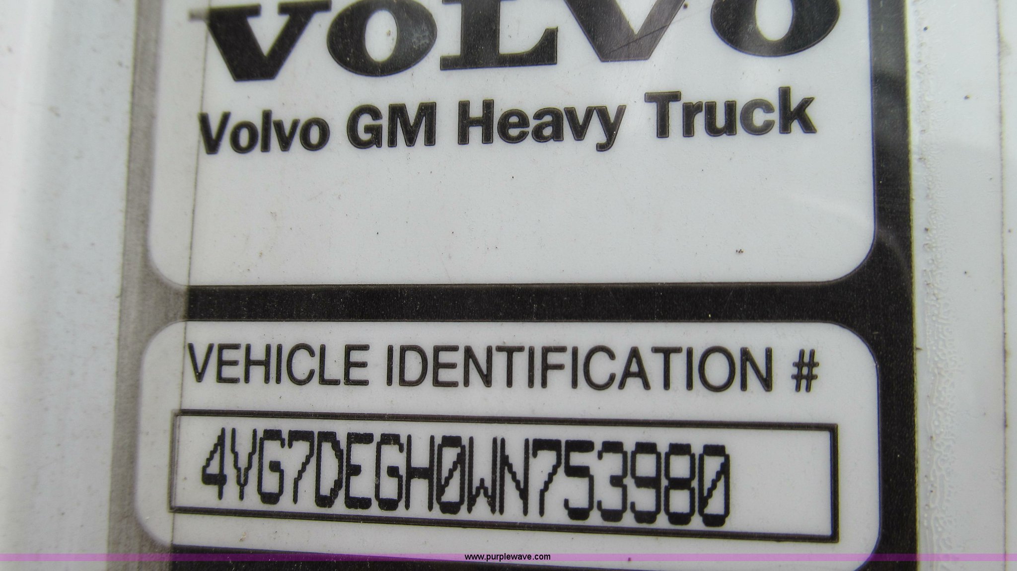 1998 Volvo VN semi truck. 652,407 miles on odometer, Volvo VE D12 12.1L L6 diesel engine 425 HP at 1,800 RPM, Serial D12088029, Rockwell RM10-145R 10 speed manual transmission Serial LB97021665, Twin screw, AC and heat, AM/FM/cassette, Air suspension seat, Integral sleeper, Exterior visor, Chrome bumper, Dual fuel tanks, Quarter fenders, Aluminum deck plate, Front tow hooks, Bug deflector, Air suspension, Air brakes , Jake brake, Aluminum wheels, 295/75R22.5 tires, GVWR 50,125 lbs. Title distribution may be delayed up to 14 days from verification of funds. 4VG7DEGH0WN753980. Shipping quotes available. Phillips Grading. 15290 Highway 135. Booneville, MO 65233