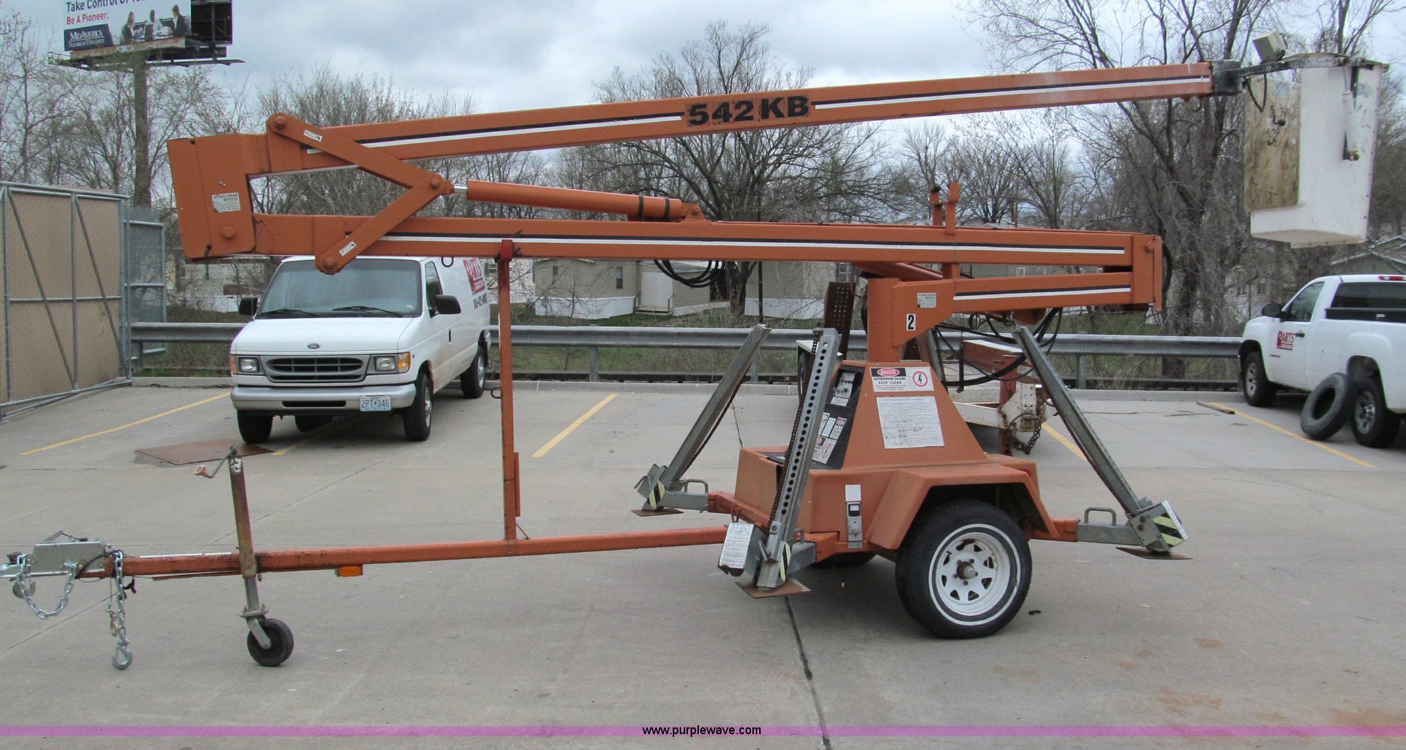 Purple Wave is selling a used Boom Lift in Missouri. This item is a 1999 KB 542 Unilift towable boom lift with the following: 36' platform height, 42' working height, 300 lb lift capacity, Manual outriggers, One man basket, Upper and lower controls, 2" ball, Surge brake, Tongue jack, Built-in charger, 360 degree rotation, 205/75R14 tires, 2,900 lbs. base operating weight, Serial 42010