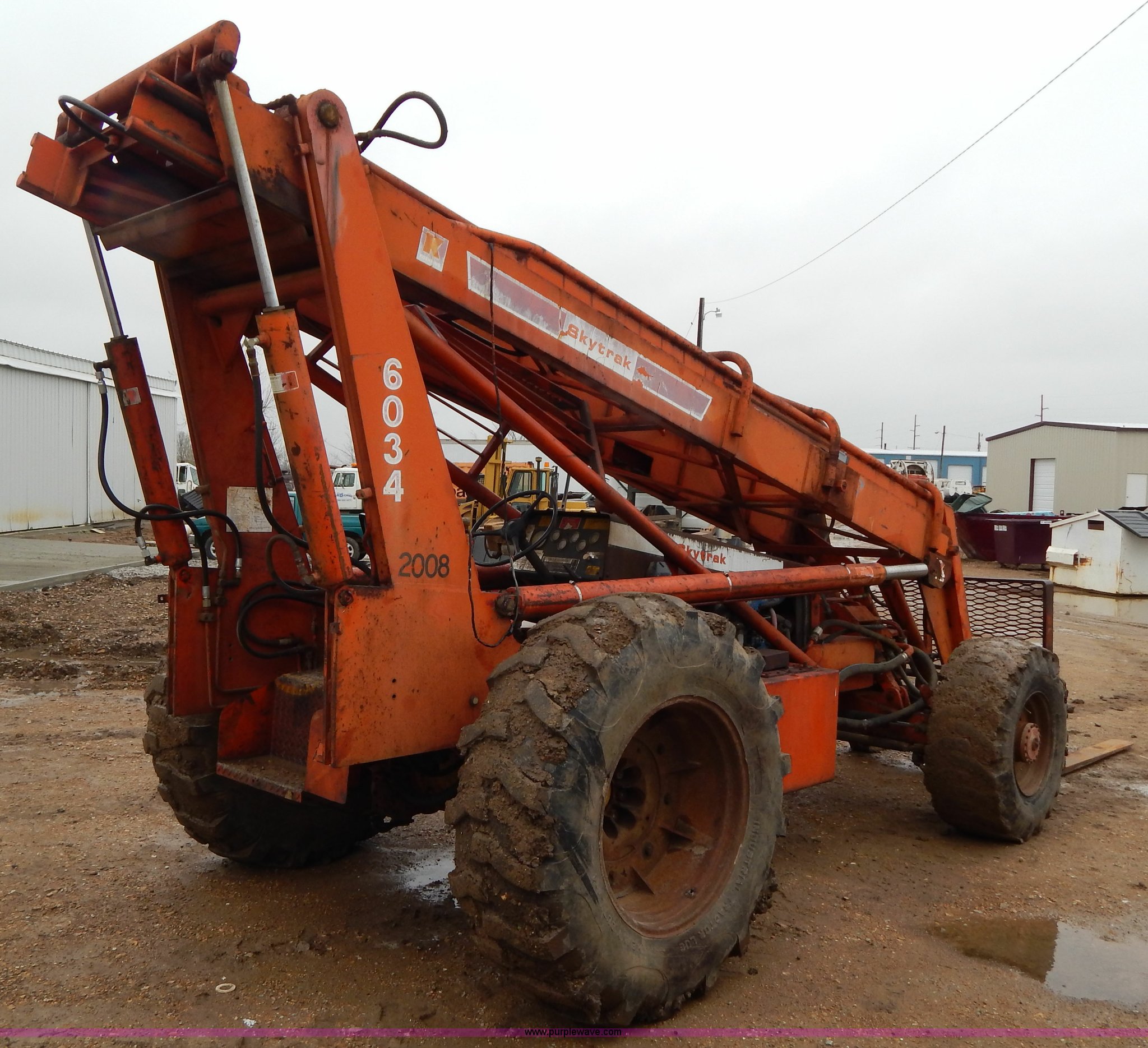 Purple Wave is selling a used Telehandler in Missouri. This item is a Koehring Sky Trak 6034-4 telehandler with the following: Ford four cylinder diesel engine, 4F-4R gears, 34' max height, 6,000 lb load capacity, 5'L x 6"W forks, Up to 55"W spread, 15x19.5 front tires, 16.9-28 rear tires, Serial 9G0004