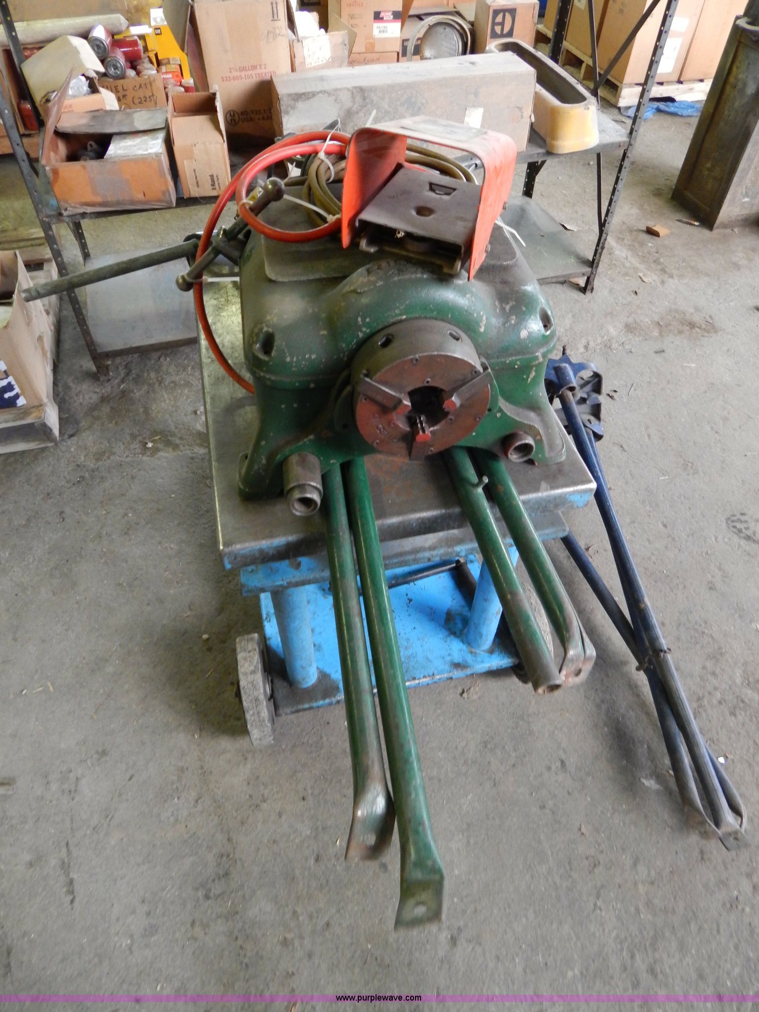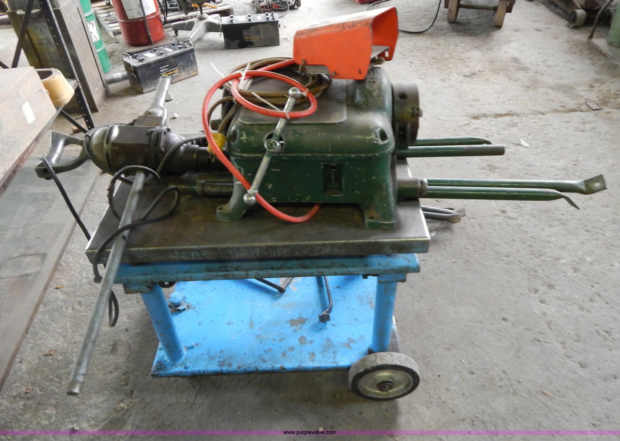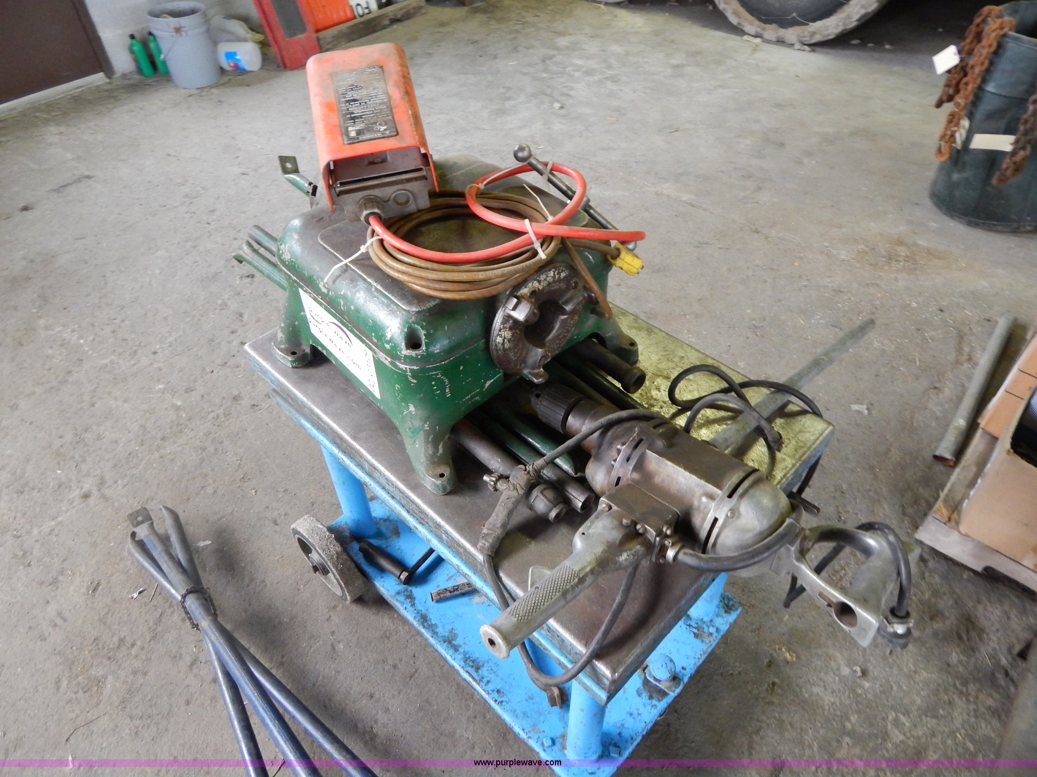 Purple Wave is selling a used Tools in Missouri. This item is a Ridgid 400 pipe threader with the following: 120V, Tripod, Cart is not included