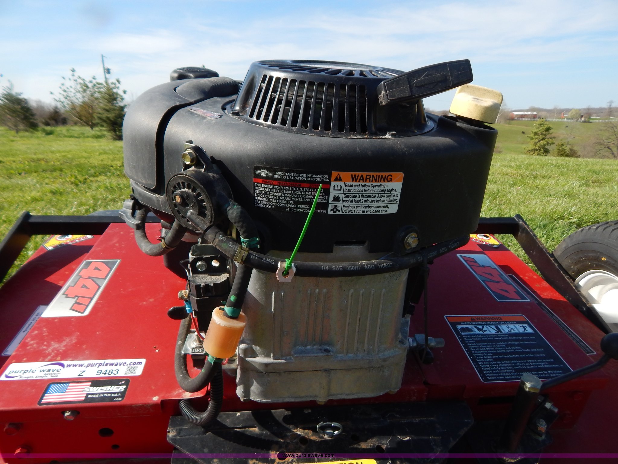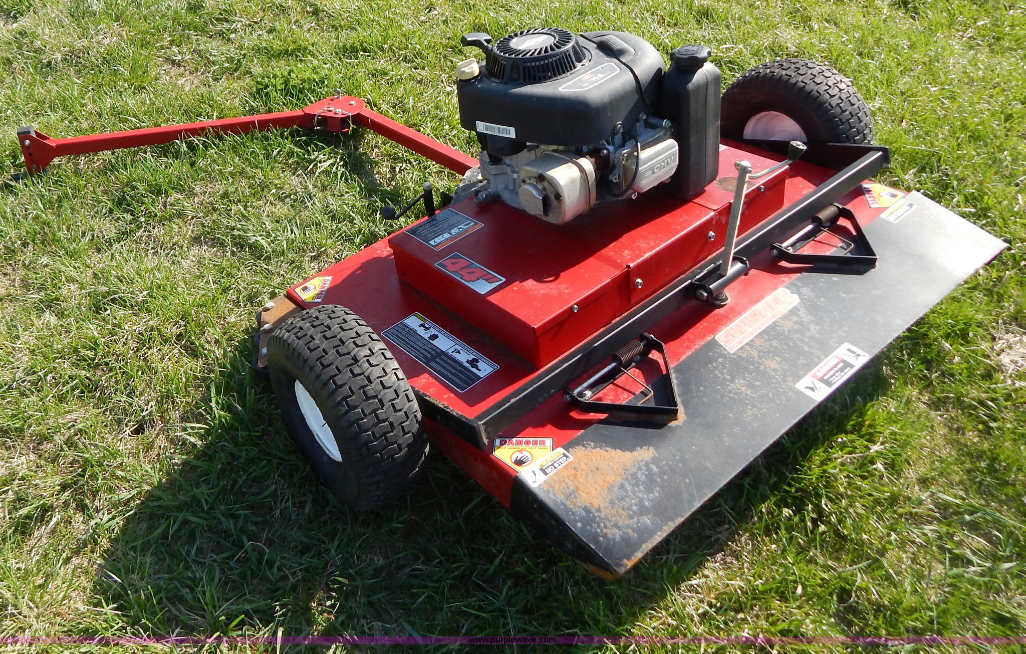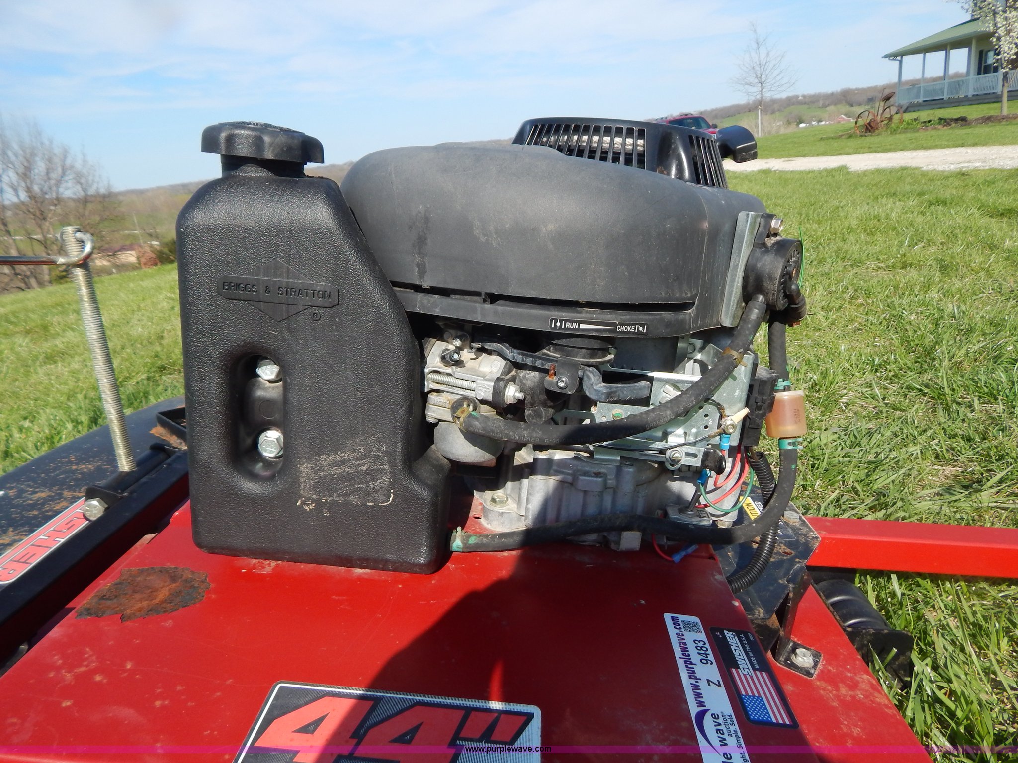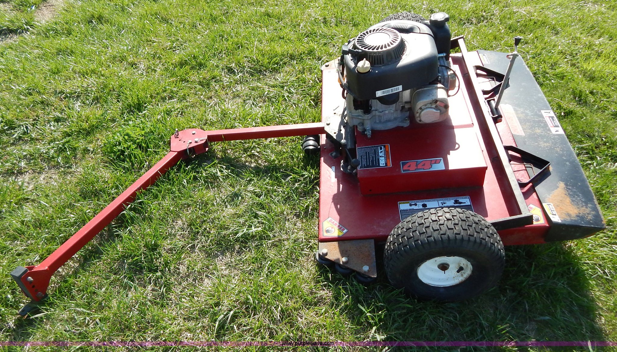 Purple Wave is selling a used Lawn and Garden in Missouri. This item is a Swisher T11544 pull behind mower with the following: 44" cut, Briggs & Stratton 11.5 HP gas engine, Angled receiver, 5x6-6 tires, Serial L108-010044