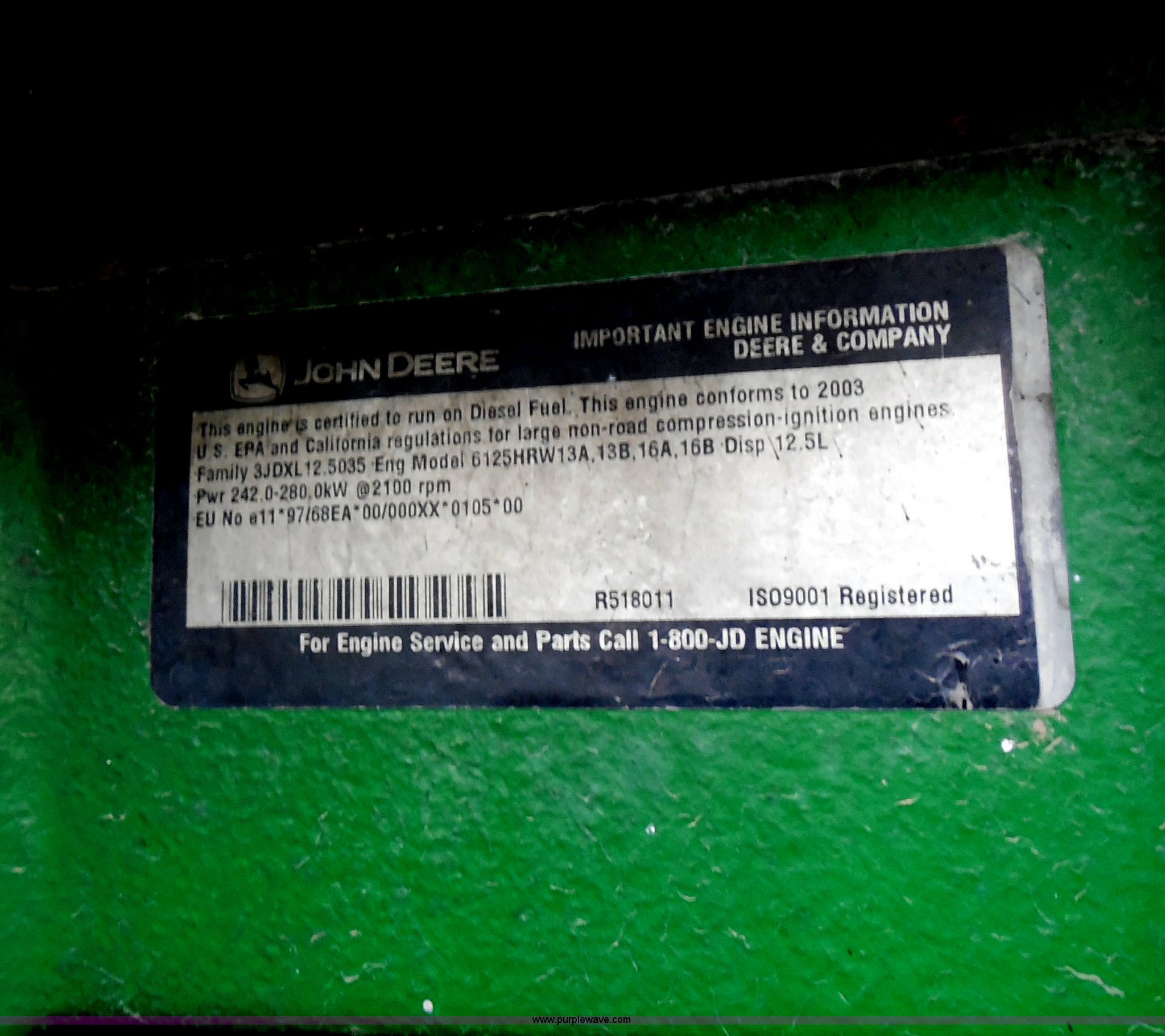 Purple Wave is selling a used Articulated 4-Wheel Drive Tractor in Kansas. This item is a 2003 John Deere 9220 4WD tractor with the following: 6,231 hours on meter, John Deere six cylinder diesel engine, Model 6125HRW13, Serial RG6125H037225, Powershift transmission, AC and heat, AM/FM, Air swivel seat, Instructor's seat, Tilt steering wheel, Shades and visors, Dual fuel tanks, Draw bar, Large 1000 PTO, (4) rear hydraulic remote sets, 620/70R46 dual tires, Recently replaced front axle bearings, Rear end has been rebuilt, Serial RW9220P011013, Stock# 72870