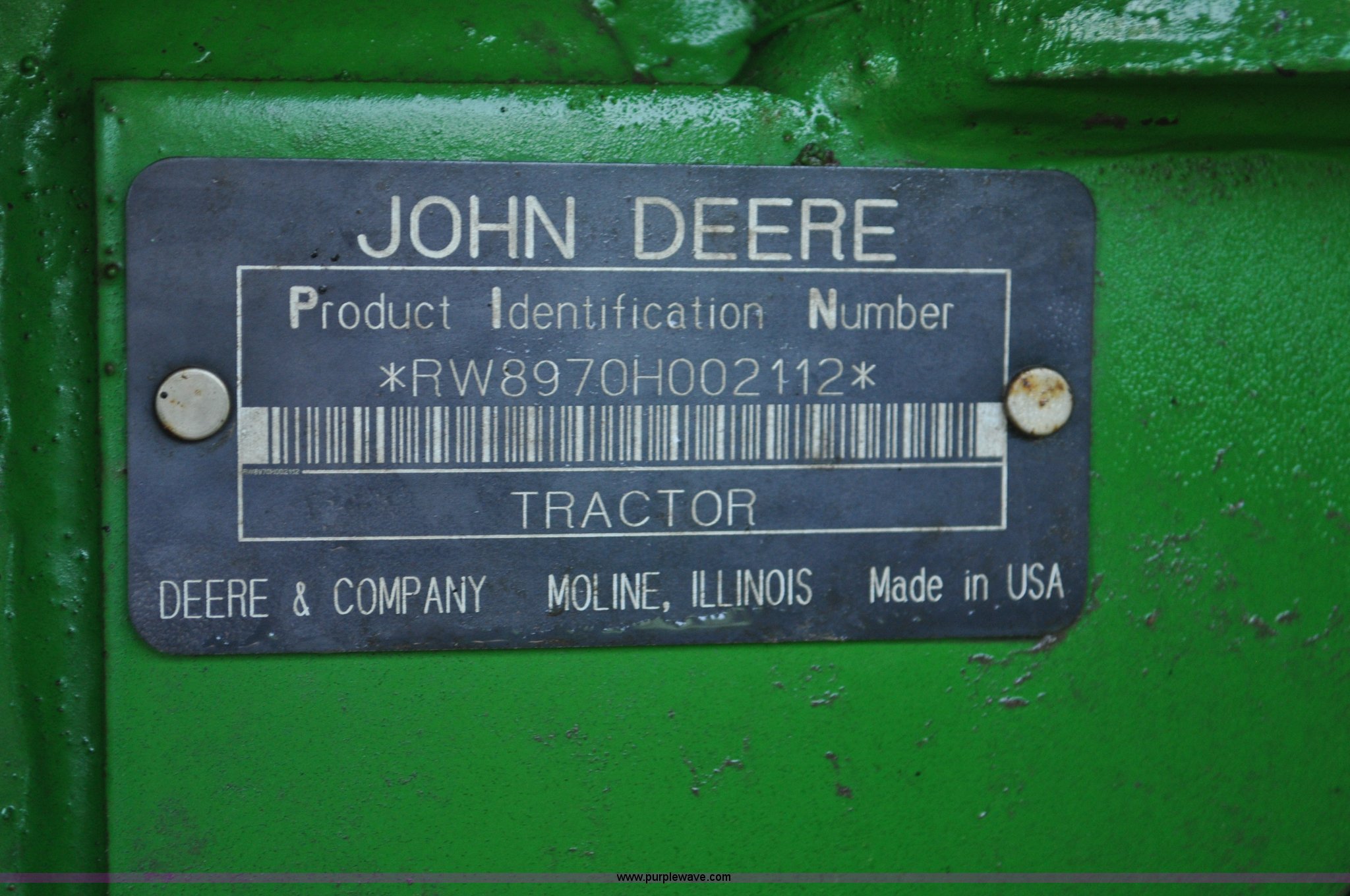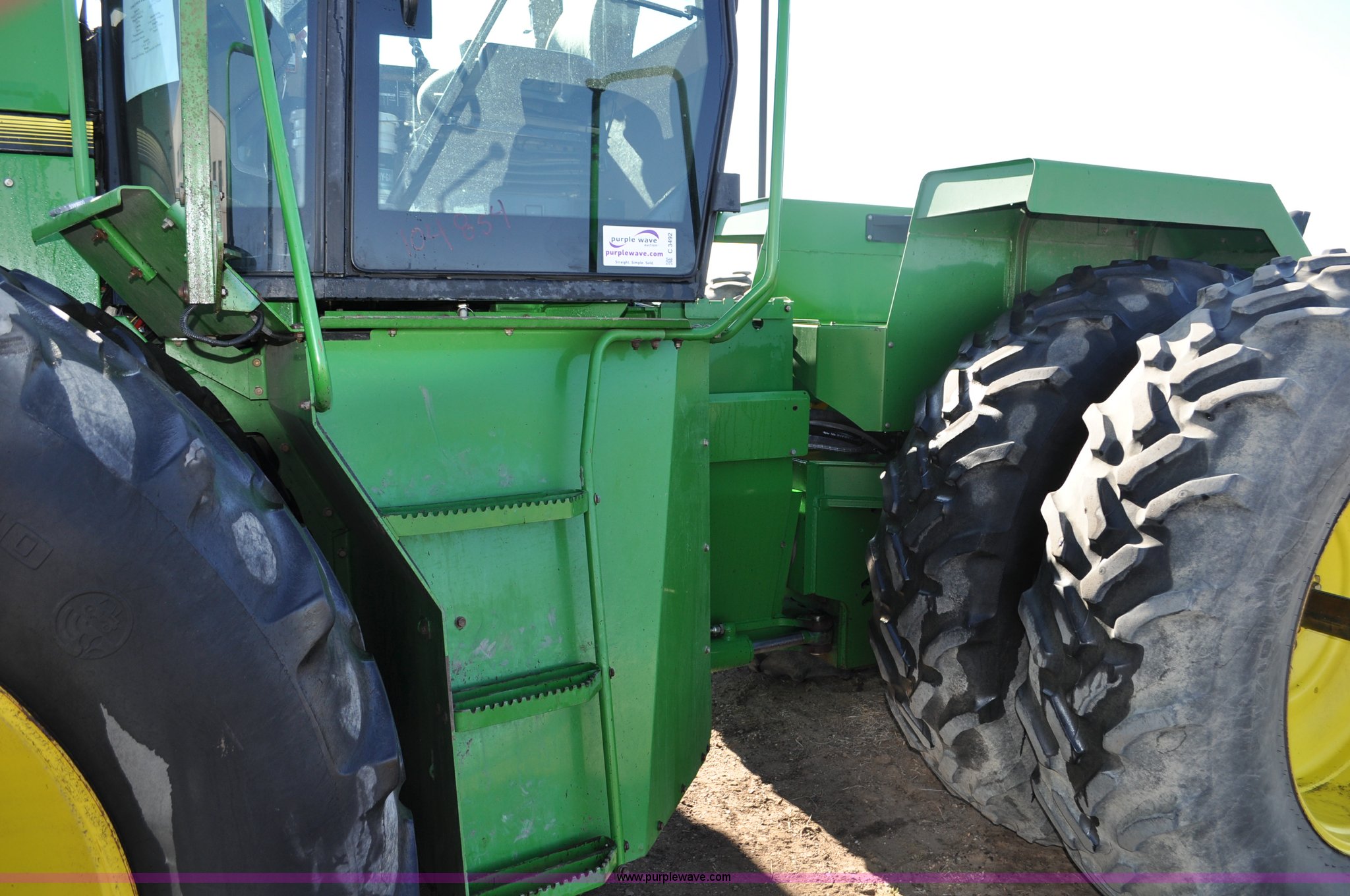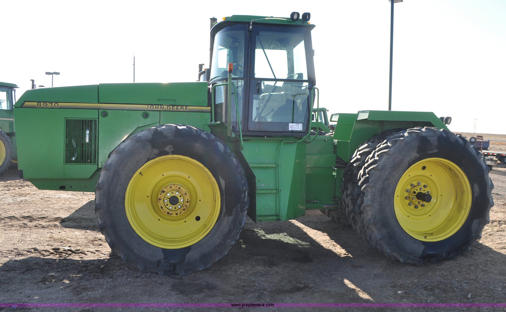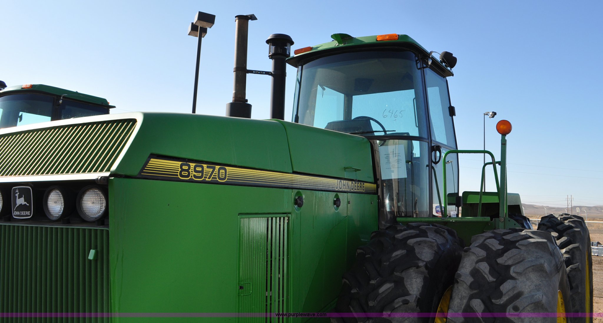 Purple Wave is selling a used Articulated 4-Wheel Drive Tractor in Wyoming. This item is a 1994 John Deere 8970 4WD tractor with the following: 10,917 hours on meter, Cummins NTA-855-A six cylinder diesel engine, 339 PTO HP, Serial 30343971, PowrSync transmission, 24F-6R gears, Two speed power shift, Differential lock, AC and heat, AM/FM, Air seat, Tilt steering wheel, Visor, Draw bar, (4) rear hydraulic remotes, 220 gallon fuel tank, Rear wheel weights, 134" wheelbase, 20.8R42 dual tires, 33,655 lbs. base operating weight, Serial RW8970H002112, Unit# T0122888