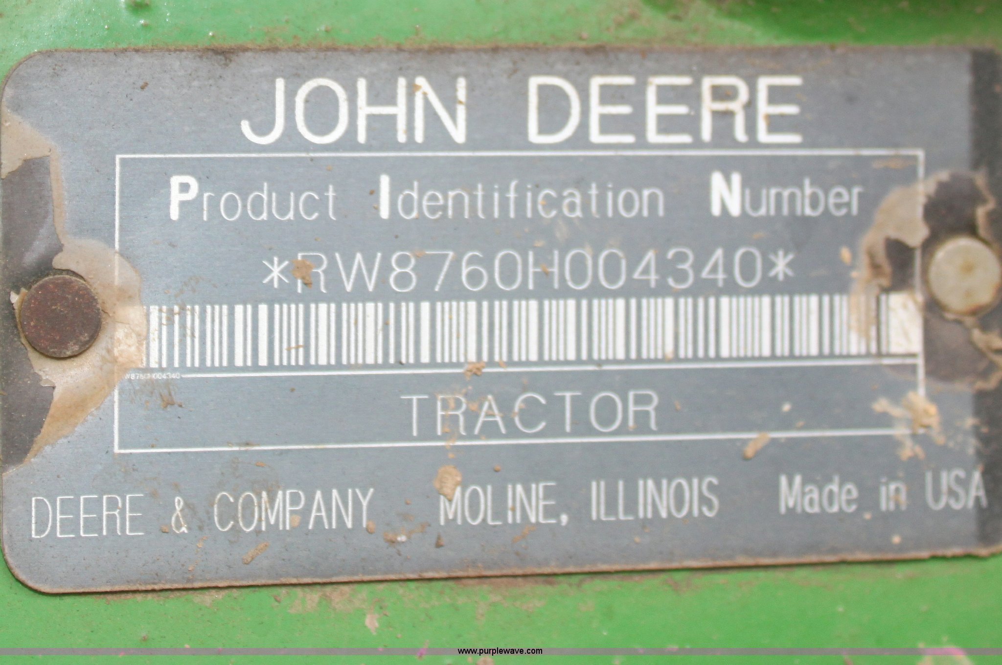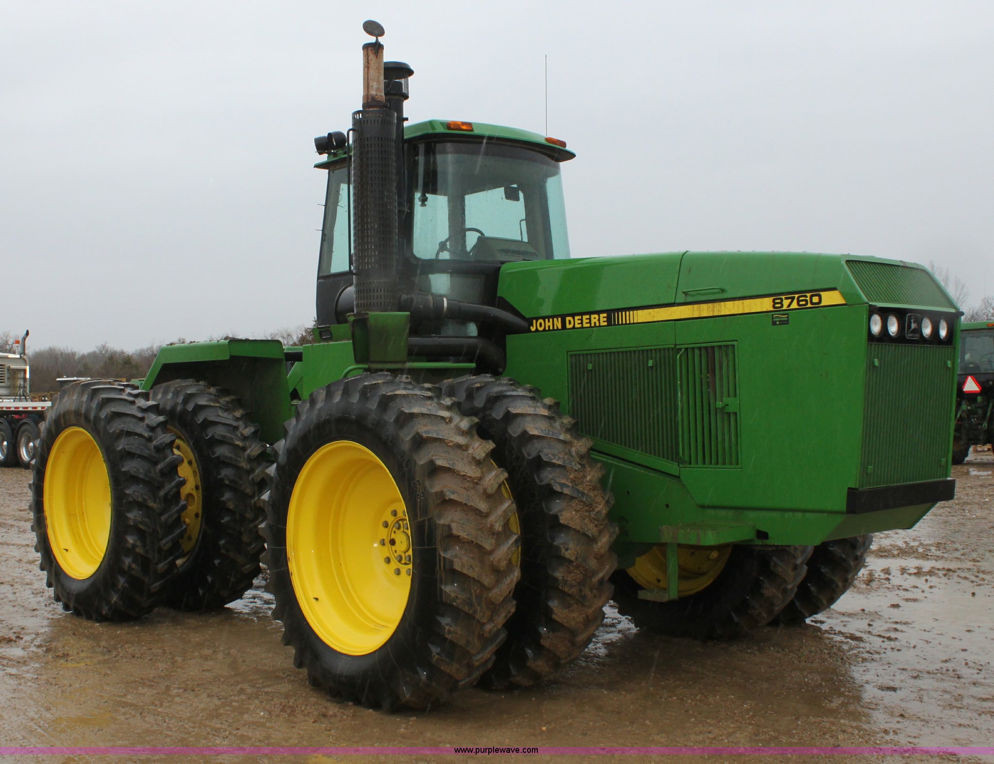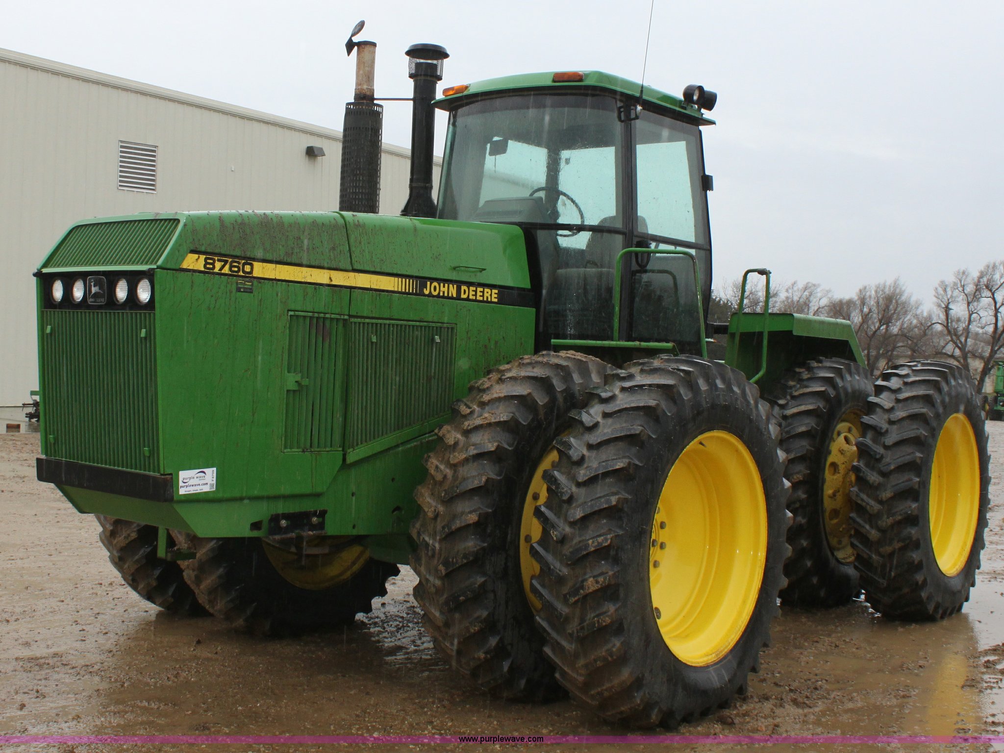 Purple Wave is selling a used Articulated 4-Wheel Drive Tractor in Kansas. This item is a 1992 John Deere 8760 4WD tractor with the following: 8,306 hours on meter, John Deere six cylinder diesel engine, 300 HP, Serial RG6101H103542, Partial powershift transmission, 24F-18R gears, AC and heat, Tilt, AM/FM, Air ride seat, (3) rear hydraulic remotes, 480/80R42 dual tires, Serial RW8760H004340, Stock# 77394