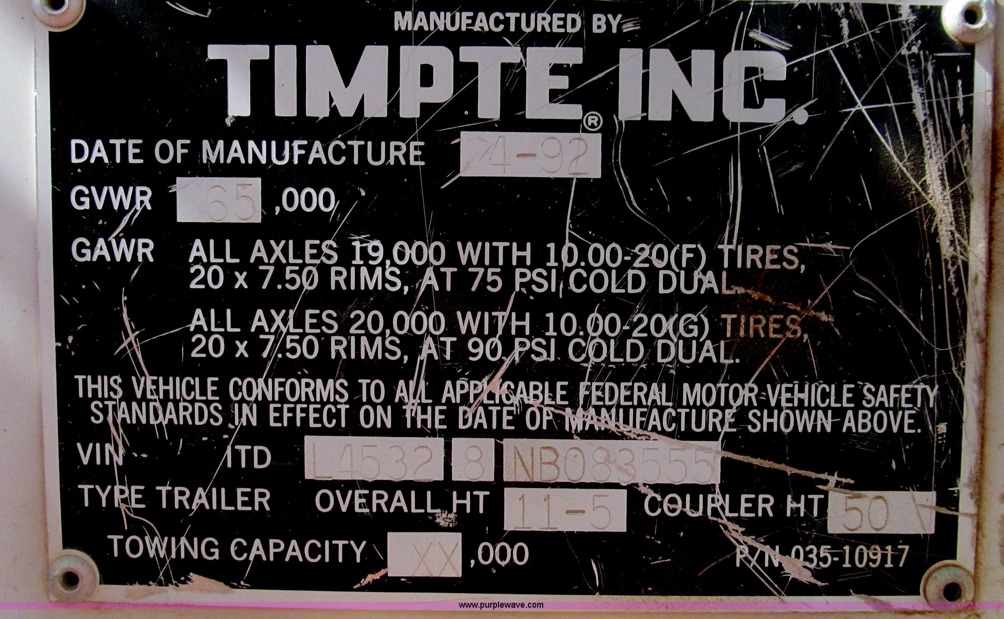 Purple Wave is selling a used Grain or Commodity Trailer in Texas. This item is a 1992 Timpte 45' live bottom trailer with the following: 11.5'H without extensions, 24" aluminum extensions, Shur-Lok tarp, Tandem axle, 11R24.5 tires, GVWR 65,000 lbs