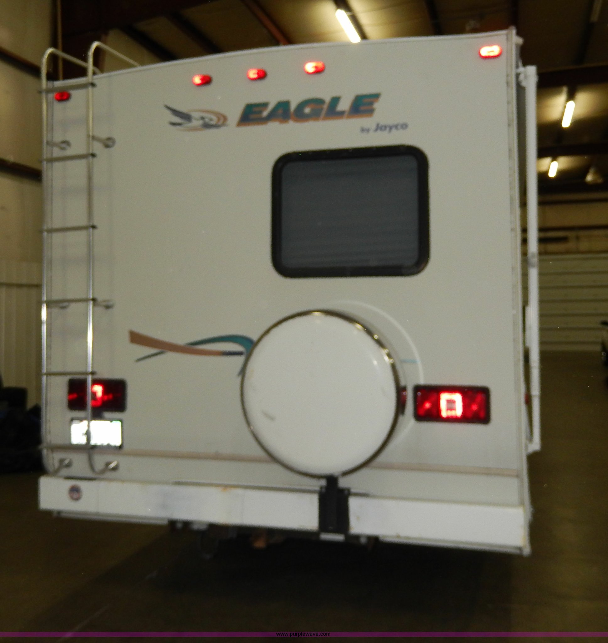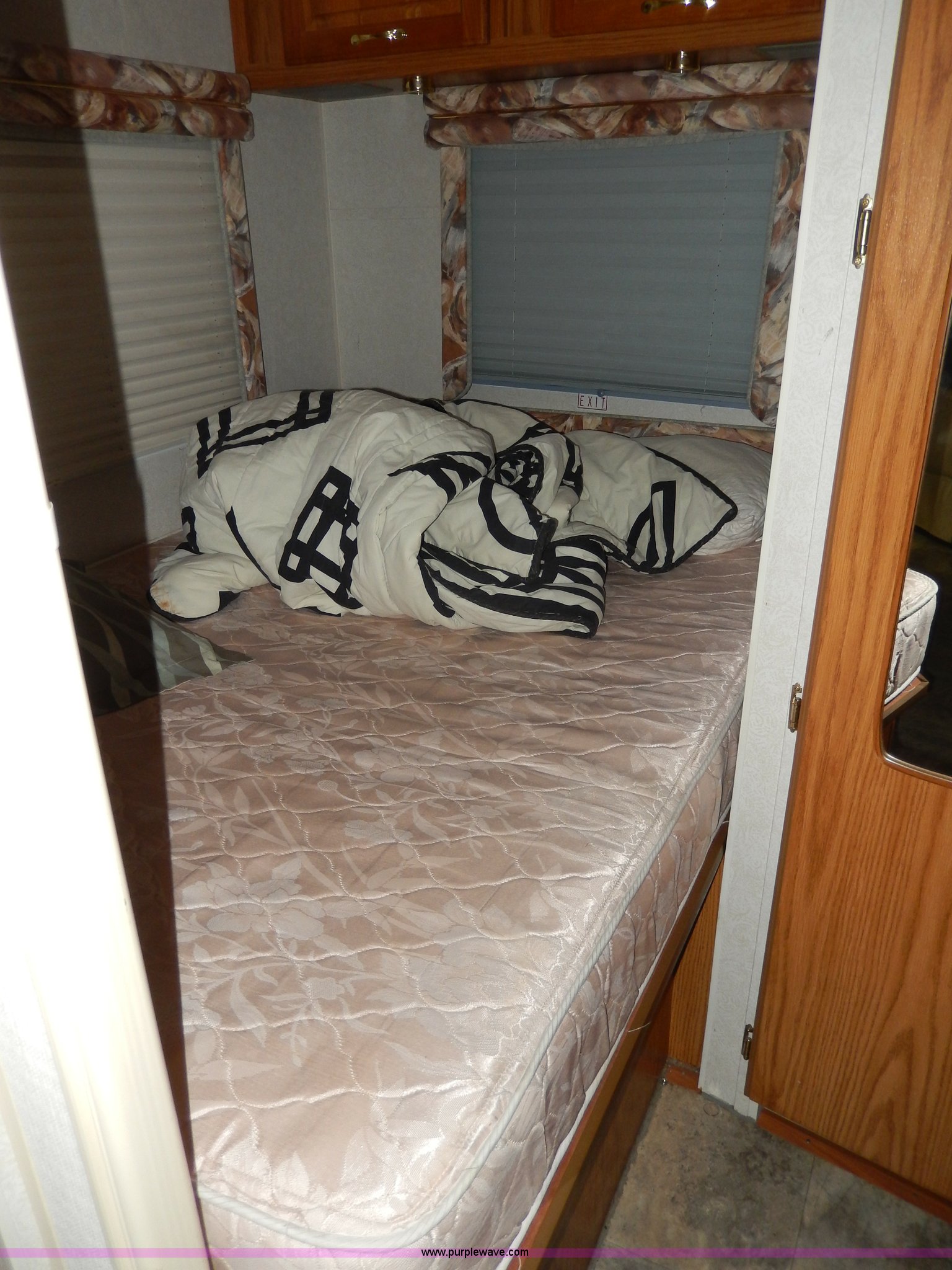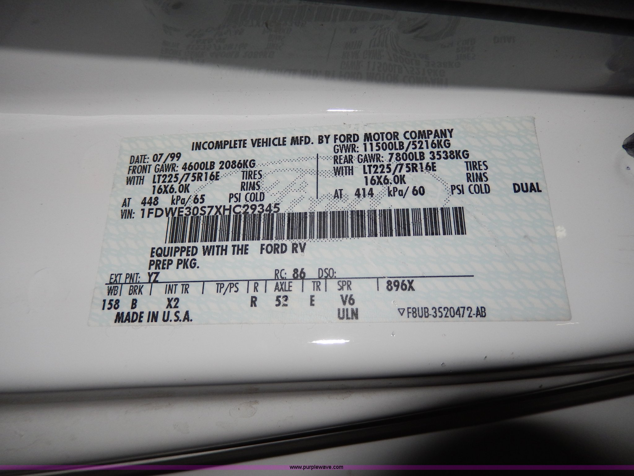 Purple Wave is selling a used RV in Kansas. This item is a 1999 Ford Econoline E350 Eagle recreational vehicle with the following: 51,905 miles on odometer, 6.8L V10 SOHC 20V gas engine, Automatic transmission, AC and heat, Tilt, Cruise, AM/FM/CD, Power windows, locks, and mirrors, Vinyl interior, Propane unit, City water connection, Sewer hose connection, Overhead bed, Table top with two bench seats, Single chair, Overhead cabinets, Kitchen, Stove, Sink, Microwave, Cabinets, Refrigerator/freezer, Bathroom, Shower, Sink, Toilet, Bedroom, Bed, Cabinets, Coleman Mach rear unit, Awning, Receiver hitch, Trailer wiring, 225/75R16 tires