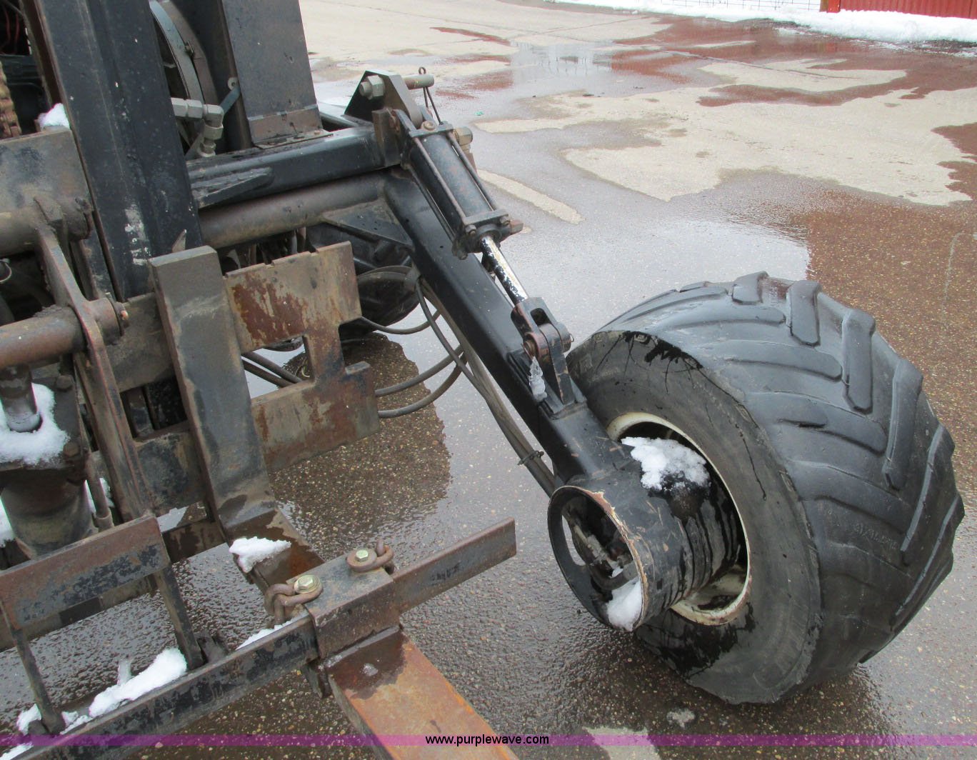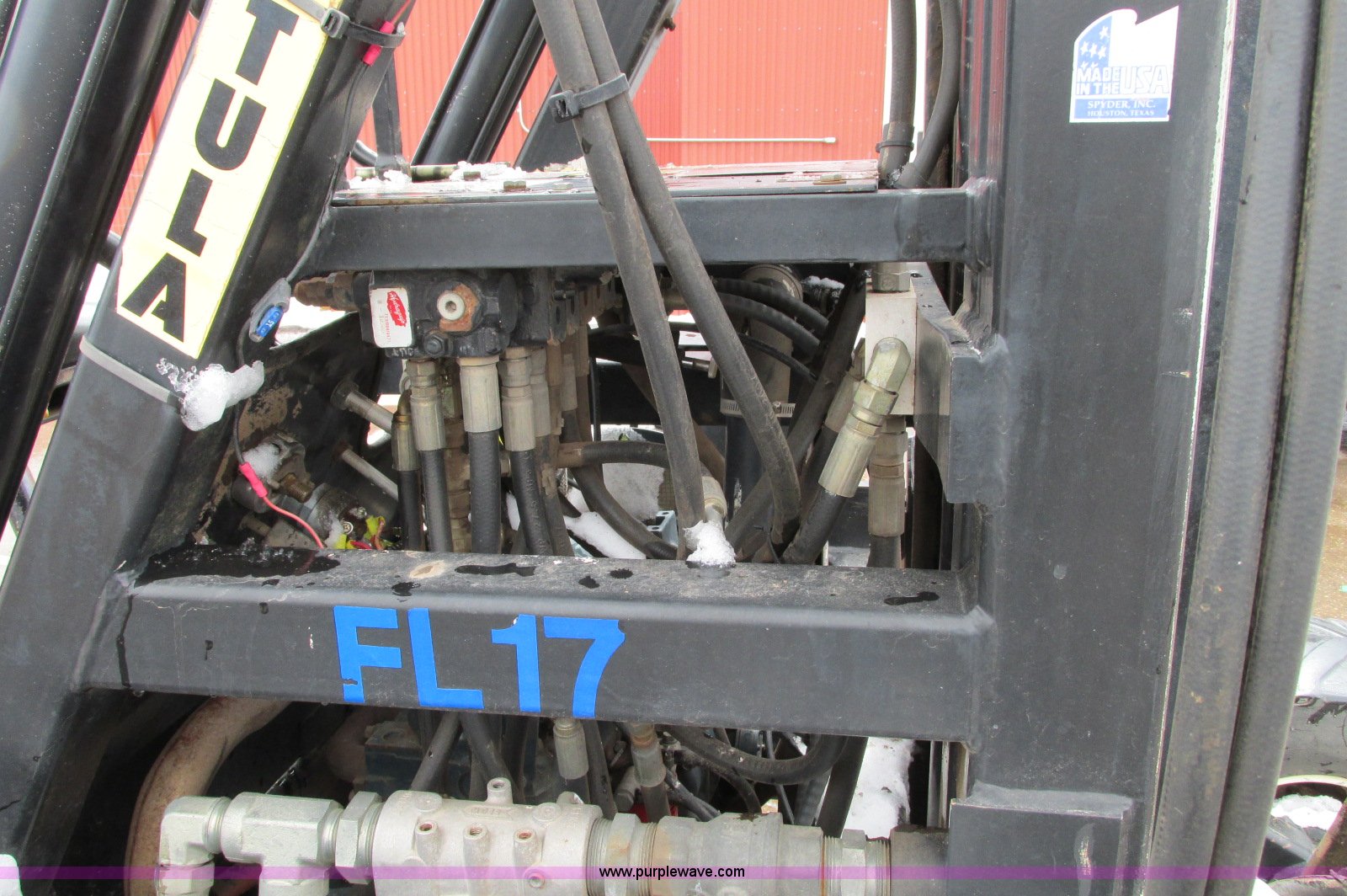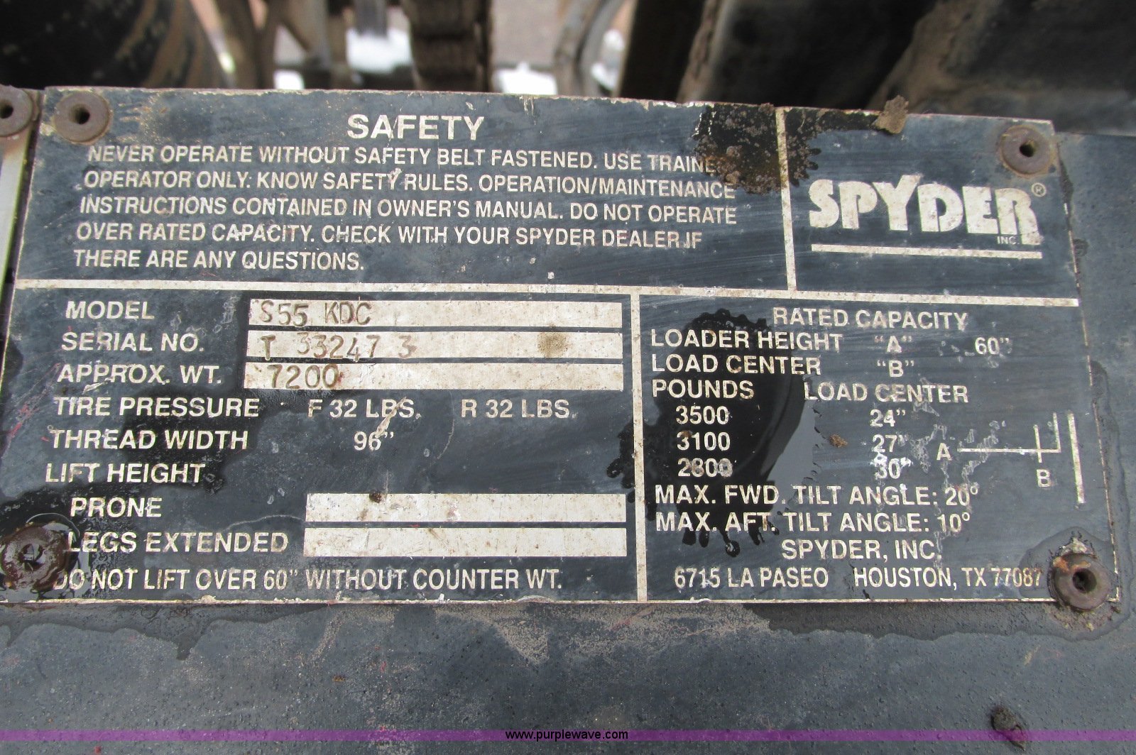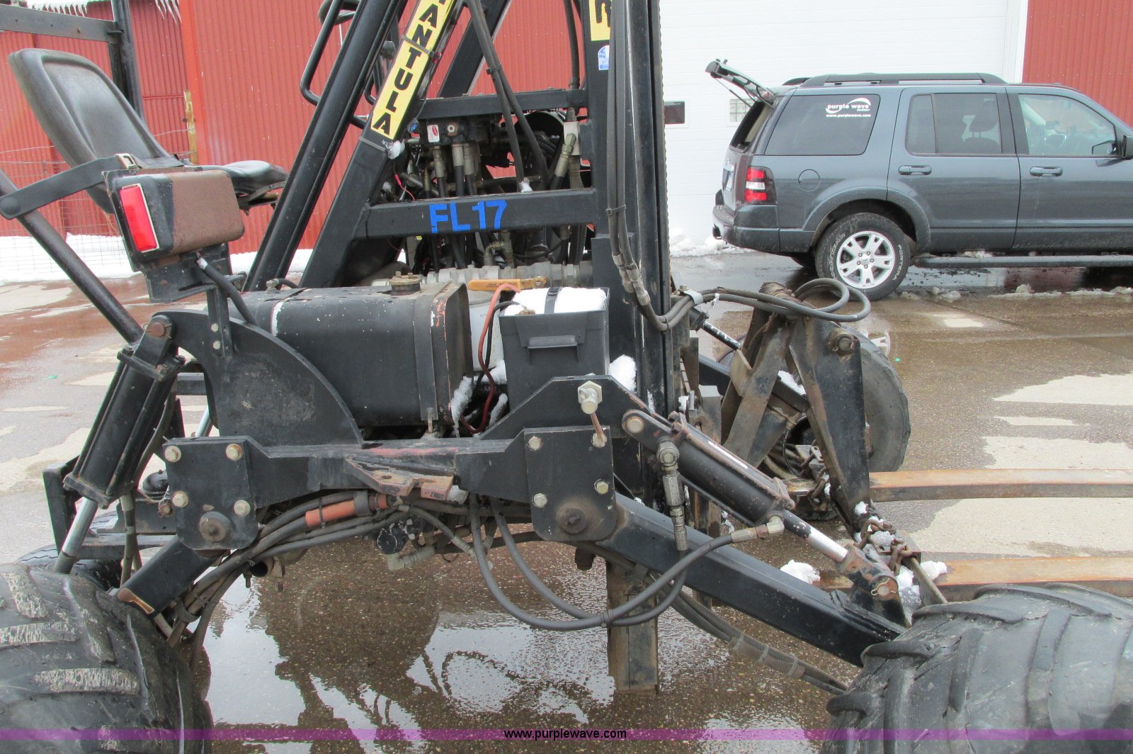 Purple Wave is selling a used Cushion Tire or Pneumatic Forklift in Minnesota. This item is a Spyder Tarantula 555KDC forklift with the following: 212 hours on meter, Kubota V2203-E diesel engine, Four wheel drive, ROPS, Work lights, Strobe light, Auxiliary lights, Straight mast, 176" maximum lift height, 5,500 lbs maximum lift capacity, Adjustable forks, 31 x 15.15NHS front tires, 18.5-8.5-8 rear tires, 7,200 lbs. base operating weight, Previously used with item E5049., Serial T332473