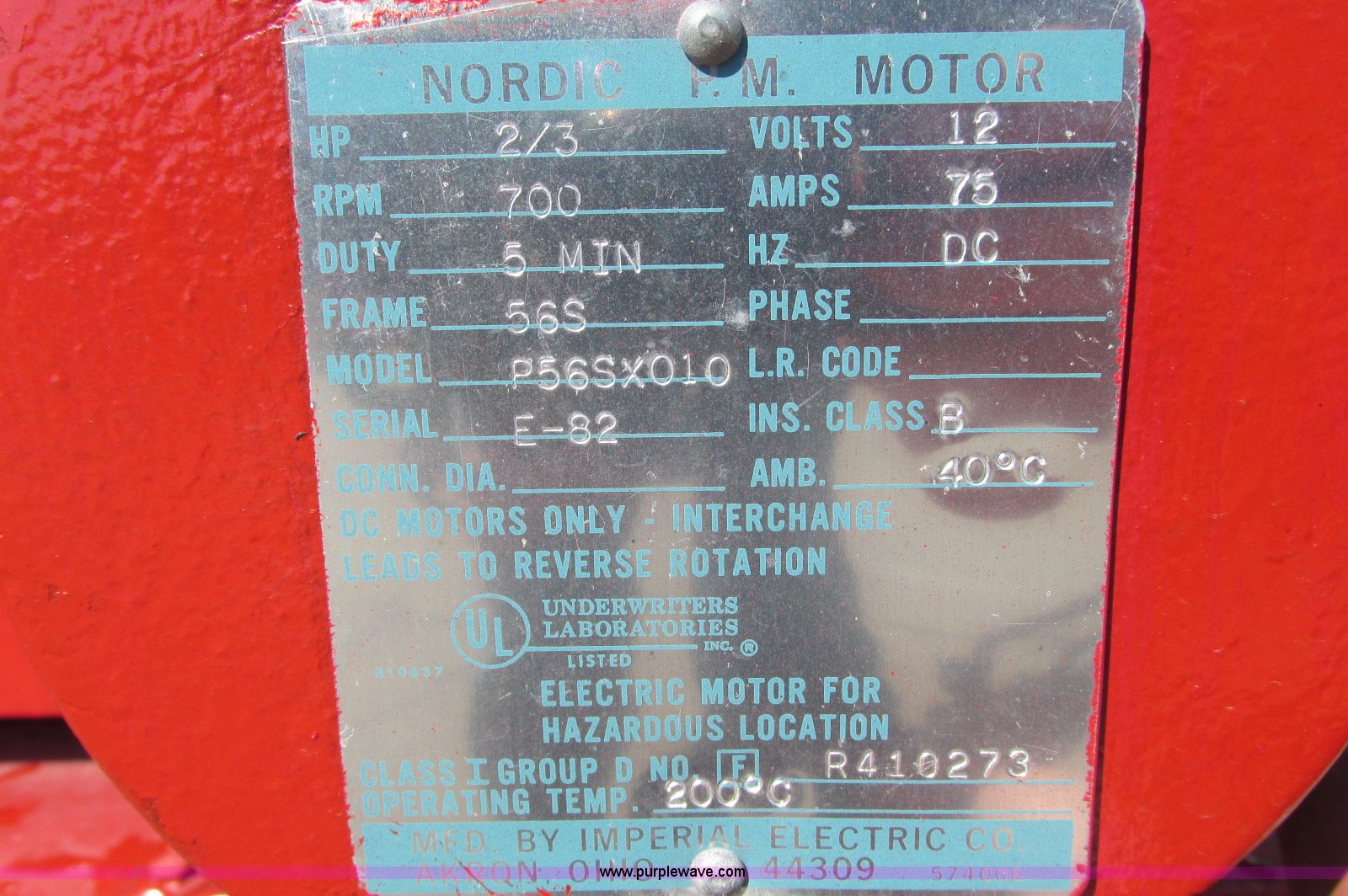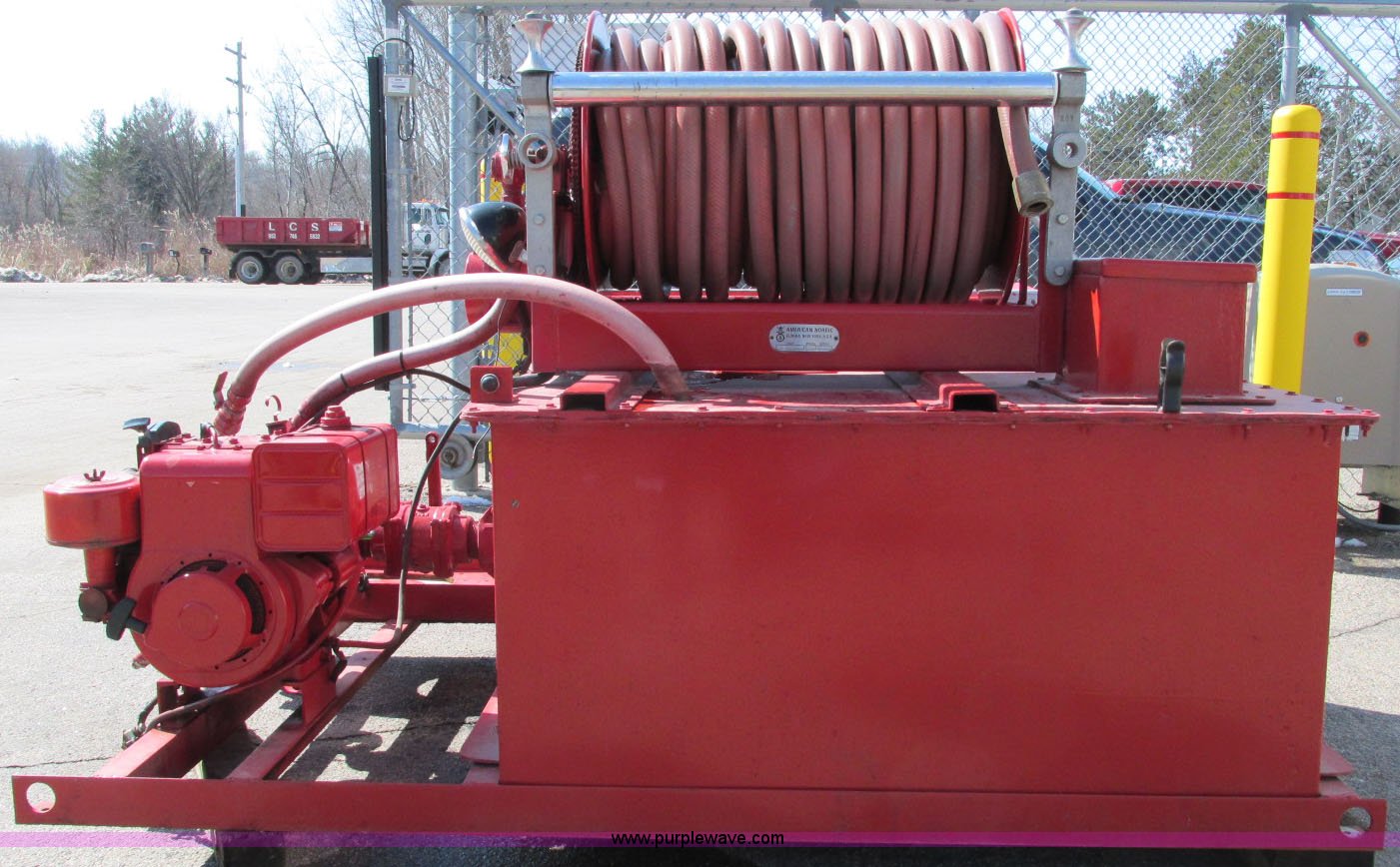 Purple Wave is selling a used Truck Part and Attach. in Minnesota. This item is a American Nordic H61 brush fire unit with the following: Holiday water tank, Approximately 250 gallon capacity, Hose reel, 1.5" hose, Approximately 100'L, Nordic 2/3 HP 12V hose rewind motor, Model A5BSX010, Serial E-82, 3" hose connections, Pressure gauge, Primary pump motor, Model 252415, Type D146-01, Code 79091311, Side tool storage, Velcro cover, Serial 1358