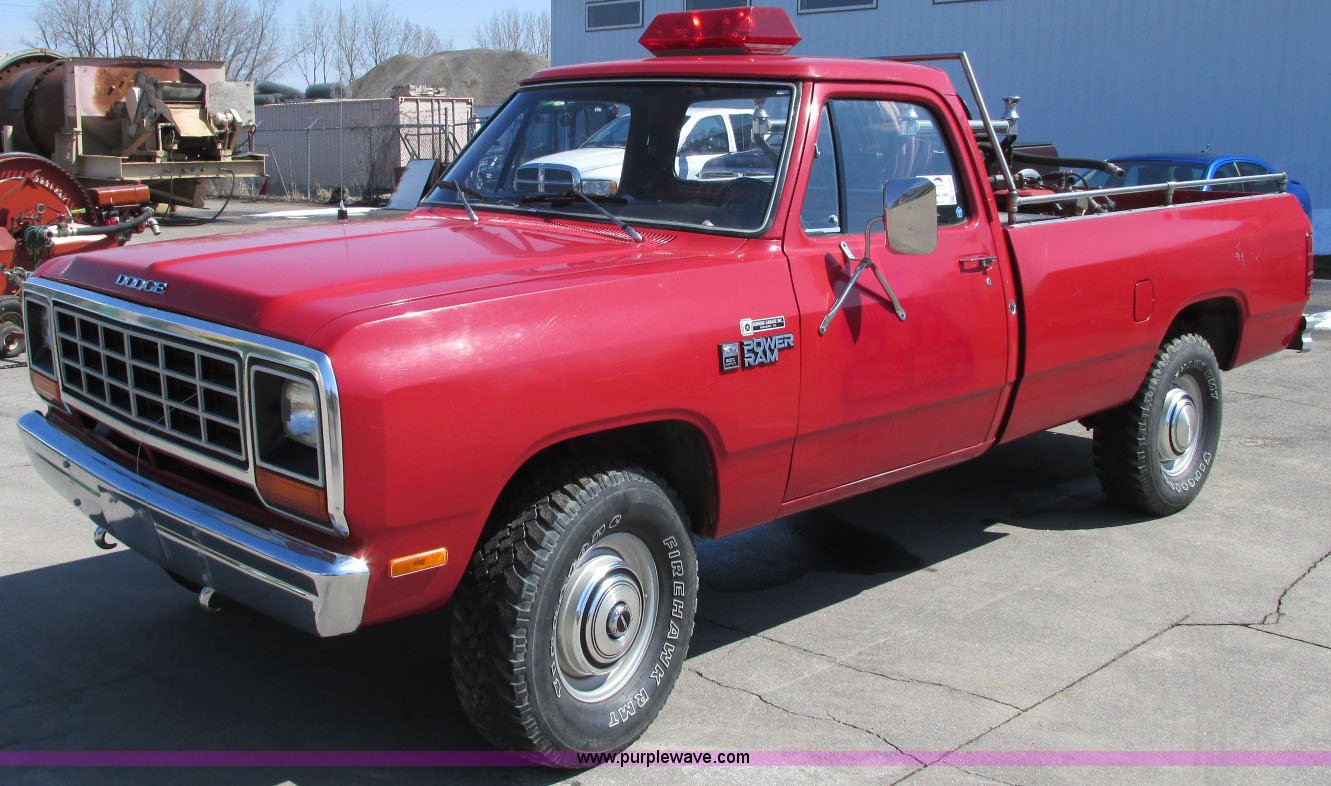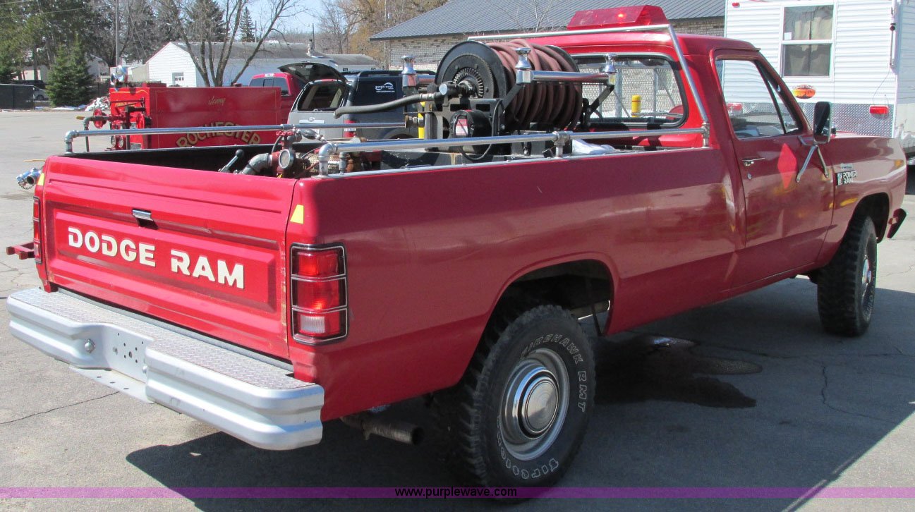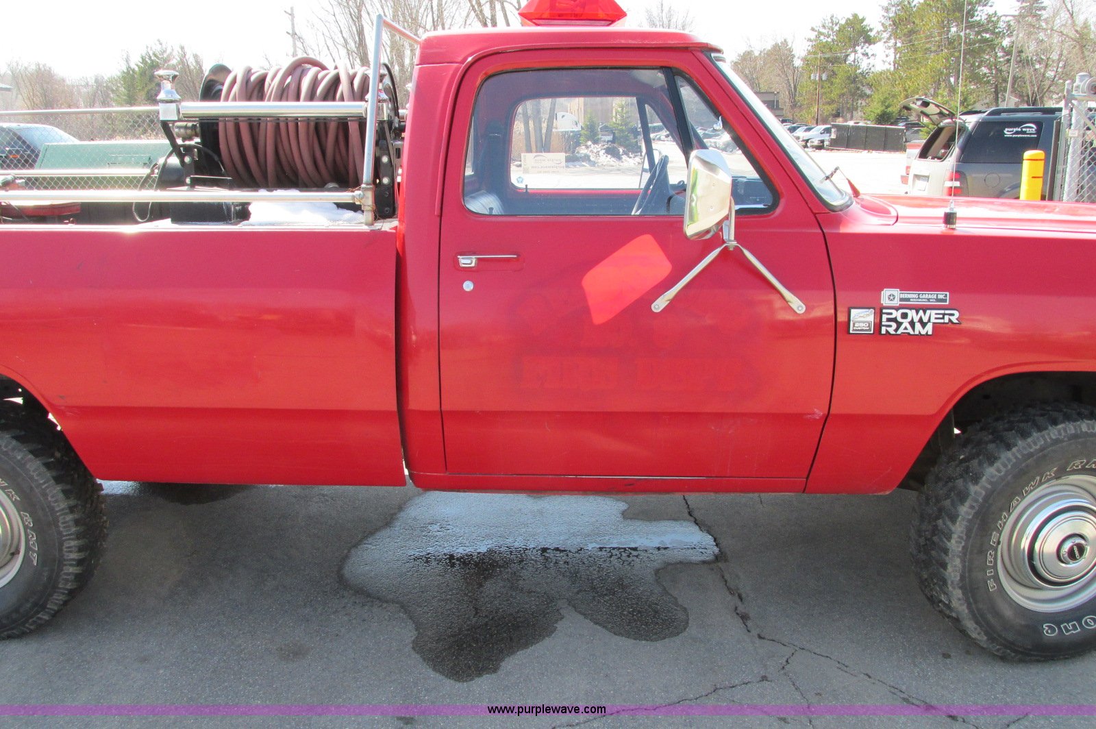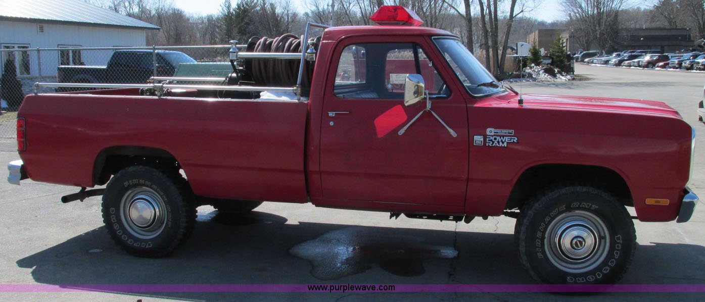 Purple Wave is selling a used Passenger Vehicle in Minnesota. This item is a 1983 Dodge Power Ram 250 Custom pickup truck with the following: 12,176 actual miles, 5.2L V8 OHV 16V gas engine, Automatic transmission, Four wheel drive, Heat, Manual windows and locks, Vinyl interior, Federal Signal Corperation PA300 radio, Motorola Max Trac radio, In cab light and siren controls, Code 3 strobe light bar, Brush fire unit, Hannay hose reel, Model EF32-19-21RT, Serial 723685, 1.5" hose, Approximately 100'L, WS Darley 18 HP IC reel motor, WS DArley 1.5 AGE pump, Serial 25773, PSI gauge, 2" intake valve, Dual output valves, 1.25" and 1.75", Approximately 200 gallon tank, Front tow hooks, Long bed, LT265/75R16 M/S tires, Hood release broken, Body scratched, Pump motor unknown operating condition, No fuel tank for brush fire unit