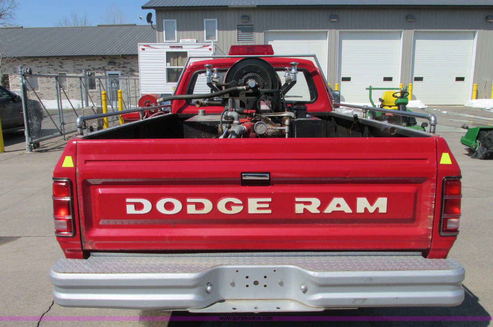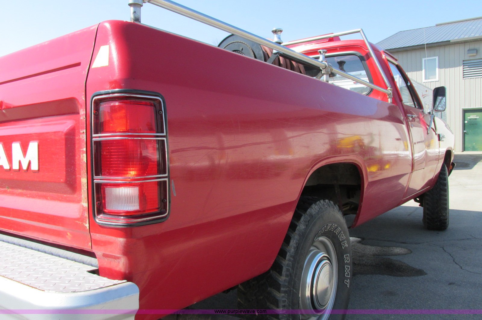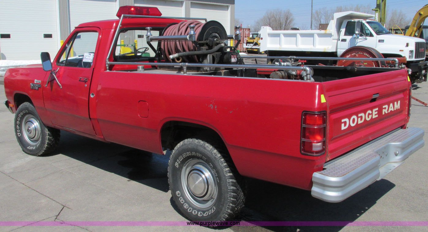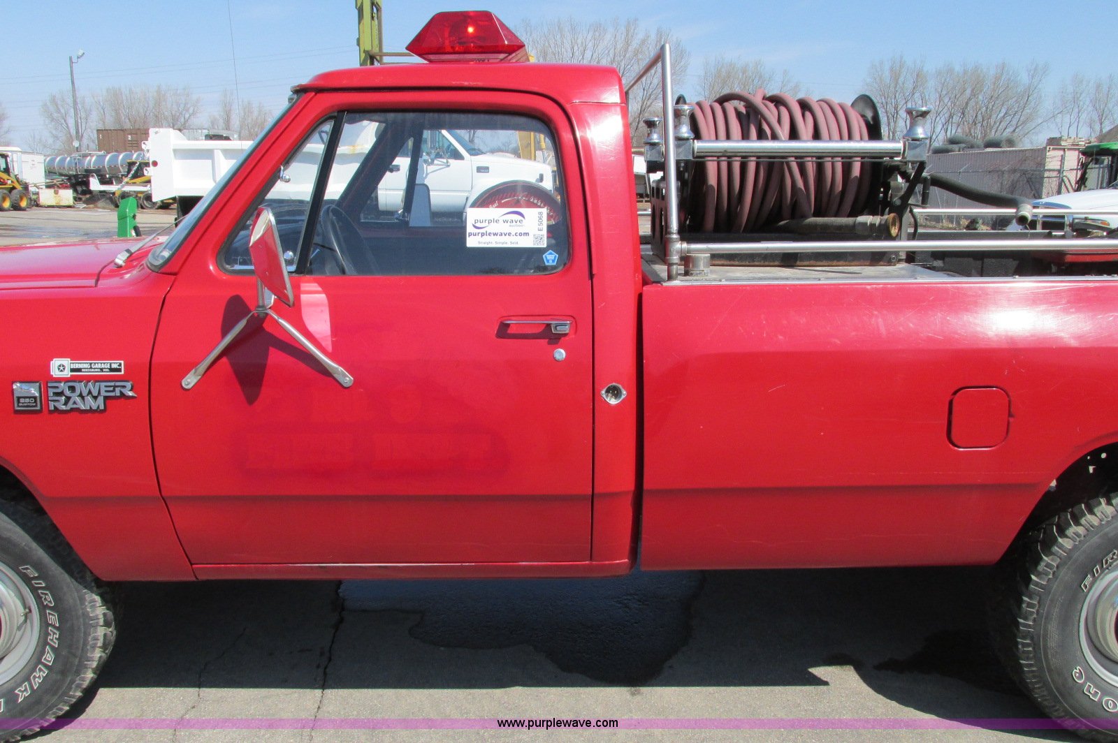 Purple Wave is selling a used Passenger Vehicle in Minnesota. This item is a 1983 Dodge Power Ram 250 Custom pickup truck with the following: 12,176 actual miles, 5.2L V8 OHV 16V gas engine, Automatic transmission, Four wheel drive, Heat, Manual windows and locks, Vinyl interior, Federal Signal Corperation PA300 radio, Motorola Max Trac radio, In cab light and siren controls, Code 3 strobe light bar, Brush fire unit, Hannay hose reel, Model EF32-19-21RT, Serial 723685, 1.5" hose, Approximately 100'L, WS Darley 18 HP IC reel motor, WS DArley 1.5 AGE pump, Serial 25773, PSI gauge, 2" intake valve, Dual output valves, 1.25" and 1.75", Approximately 200 gallon tank, Front tow hooks, Long bed, LT265/75R16 M/S tires, Hood release broken, Body scratched, Pump motor unknown operating condition, No fuel tank for brush fire unit