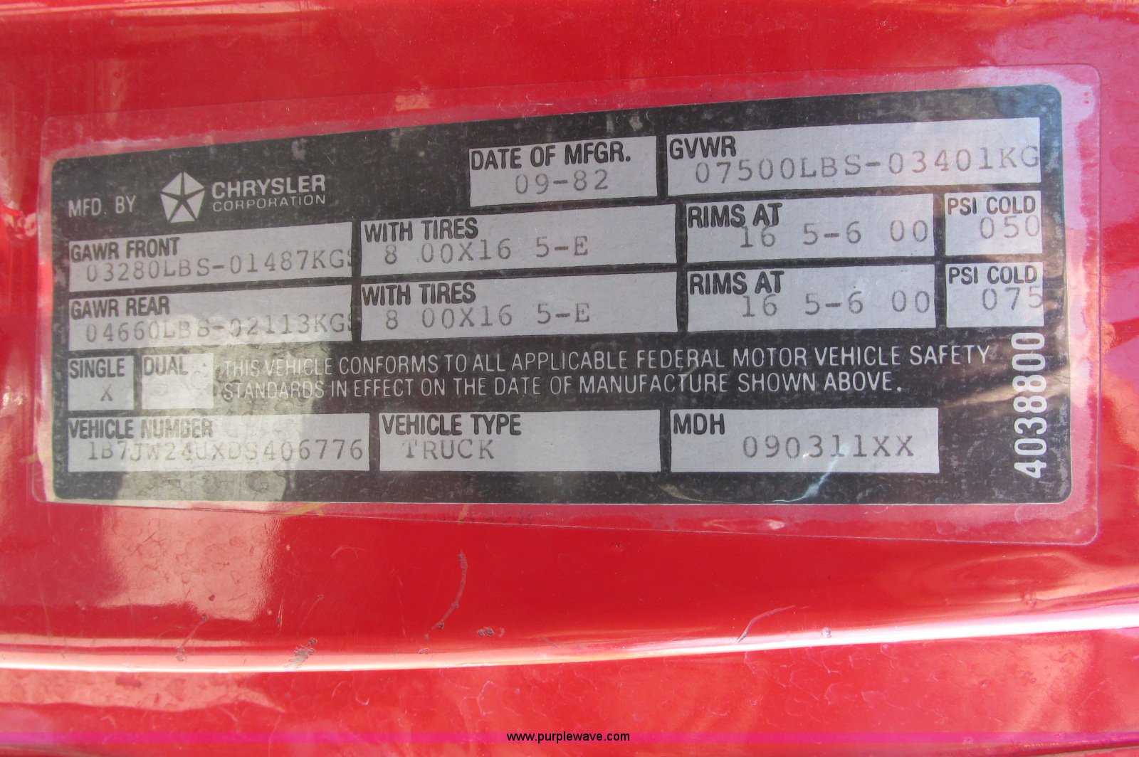 1983 Dodge Power Ram 250 Custom pickup truck. 12,176 actual miles, 5.2L V8 OHV 16V gas engine, Automatic transmission, Four wheel drive, Heat, Manual windows and locks, Vinyl interior, Federal Signal Corperation PA300 radio, Motorola Max Trac radio, In cab light and siren controls, Code 3 strobe light bar, Brush fire unit Hannay hose reel Model EF32-19-21RT, Serial 723685, 1.5" hose, Approximately 100'L, WS Darley 18 HP IC reel motor, WS DArley 1.5 AGE pump Serial 25773, PSI gauge, 2" intake valve, Dual output valves 1.25" and 1.75", Approximately 200 gallon tank, Front tow hooks, Long bed, LT265/75R16 M/S tires, Hood release broken, Body scratched, Pump motor unknown operating condition, No fuel tank for brush fire unit. 1B7JW24UXDS406776. Shipping quotes available. DCI Environmental Inc.. 7217 W 128th Street. Savage, MN 55378