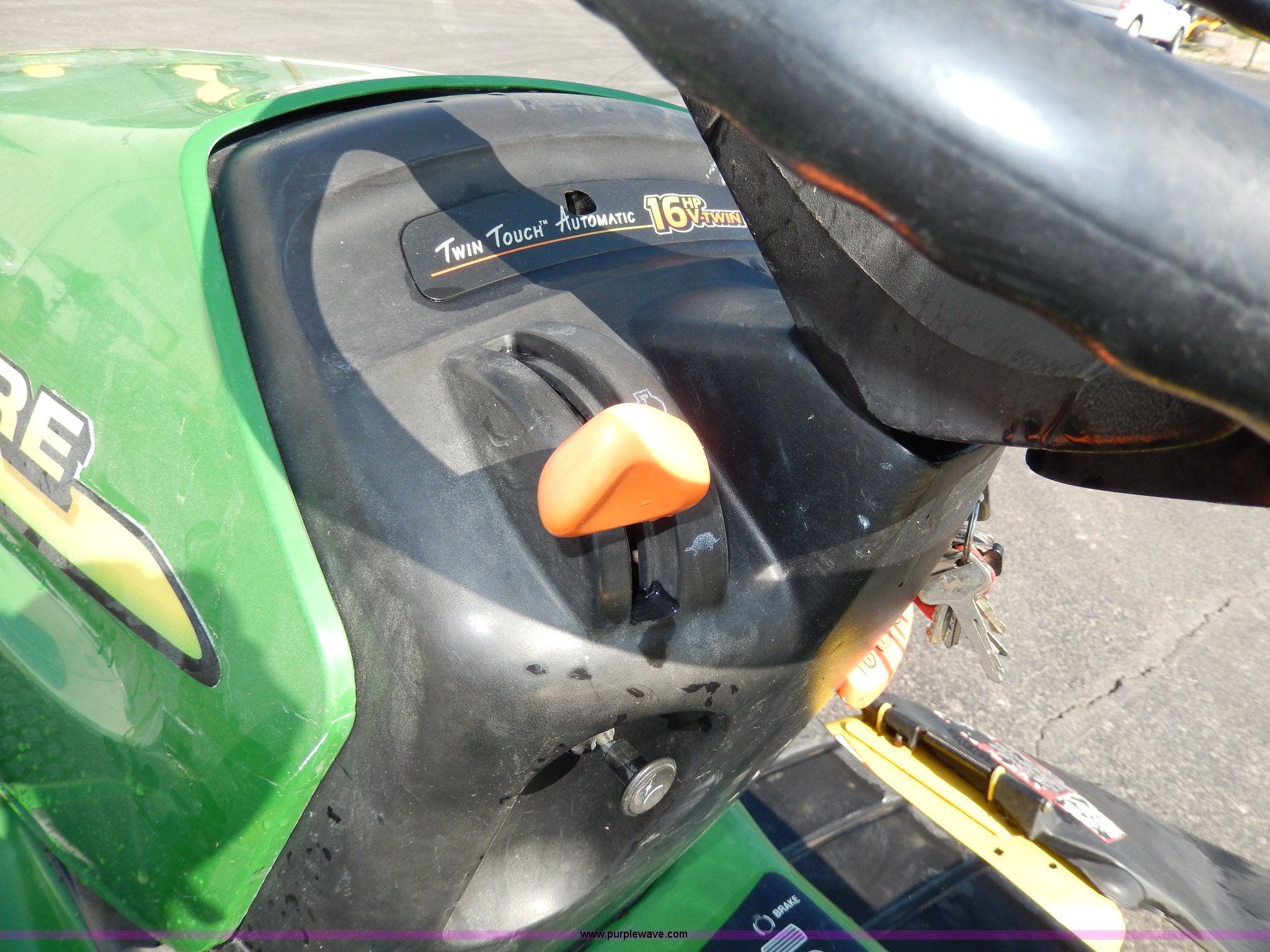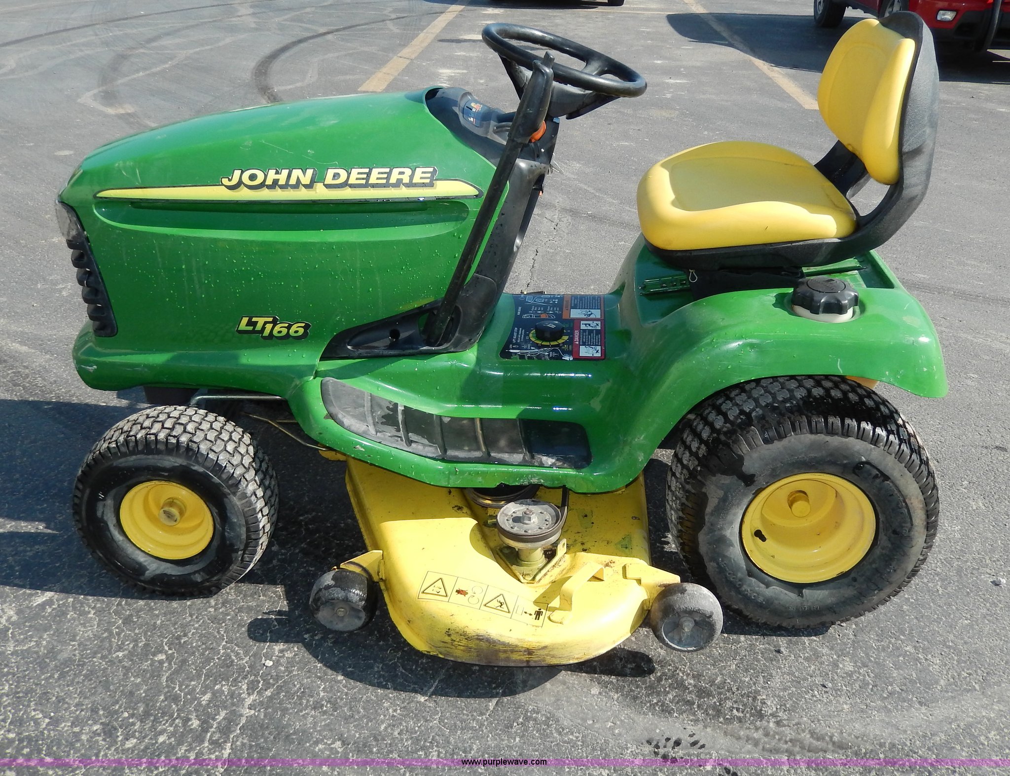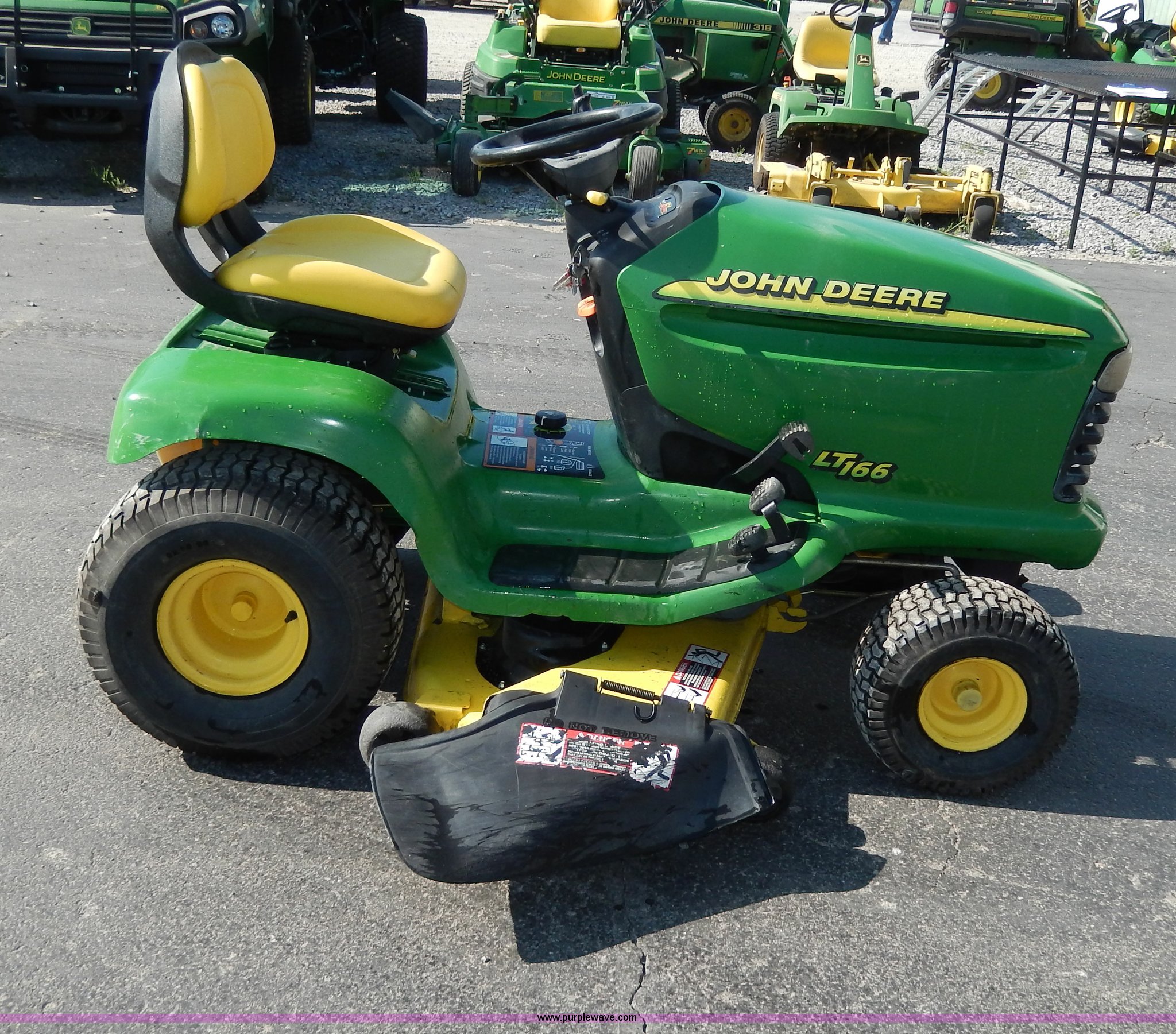 Purple Wave is selling a used Lawn and Garden in Kansas. This item is a John Deere LT166 lawn mower with the following: 42" cut, John Deere 16 HP V-twin engine, Twin Touch automatic transmission, 15x6.00-6 front tires, 20x10.00-8 rear tires, Steering column worn, Deck chatter, blades hit, Serial M0L166D013363