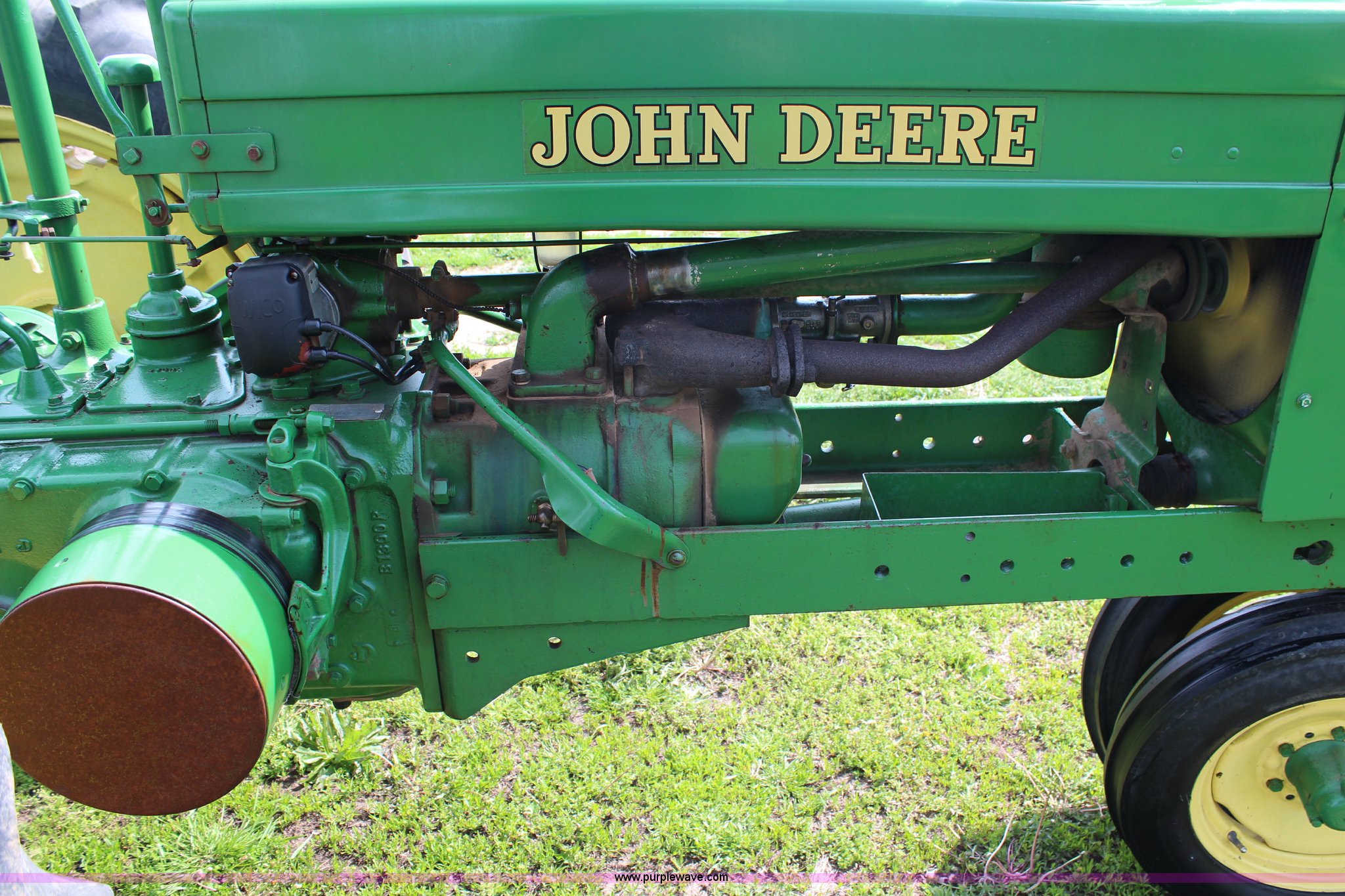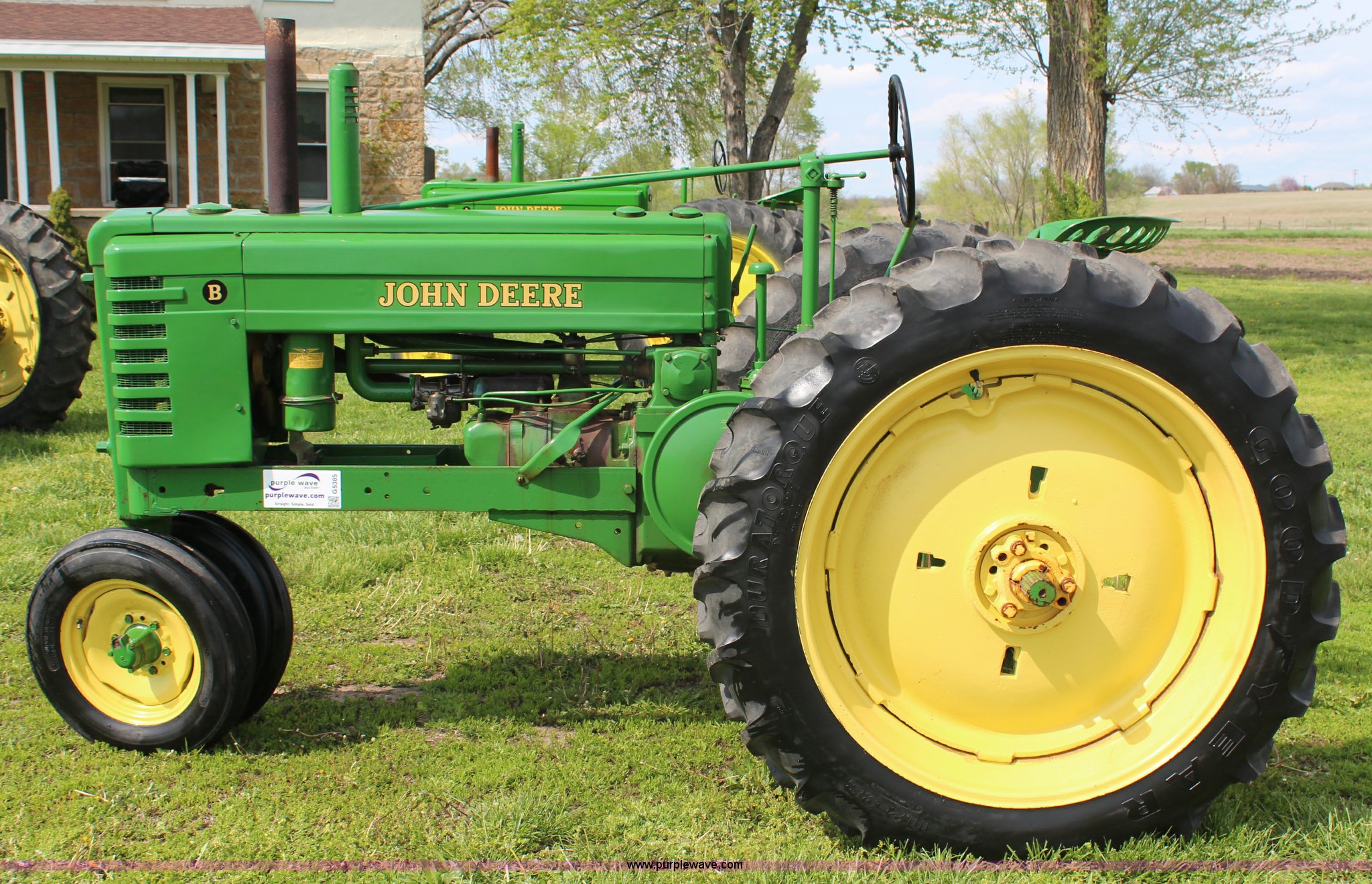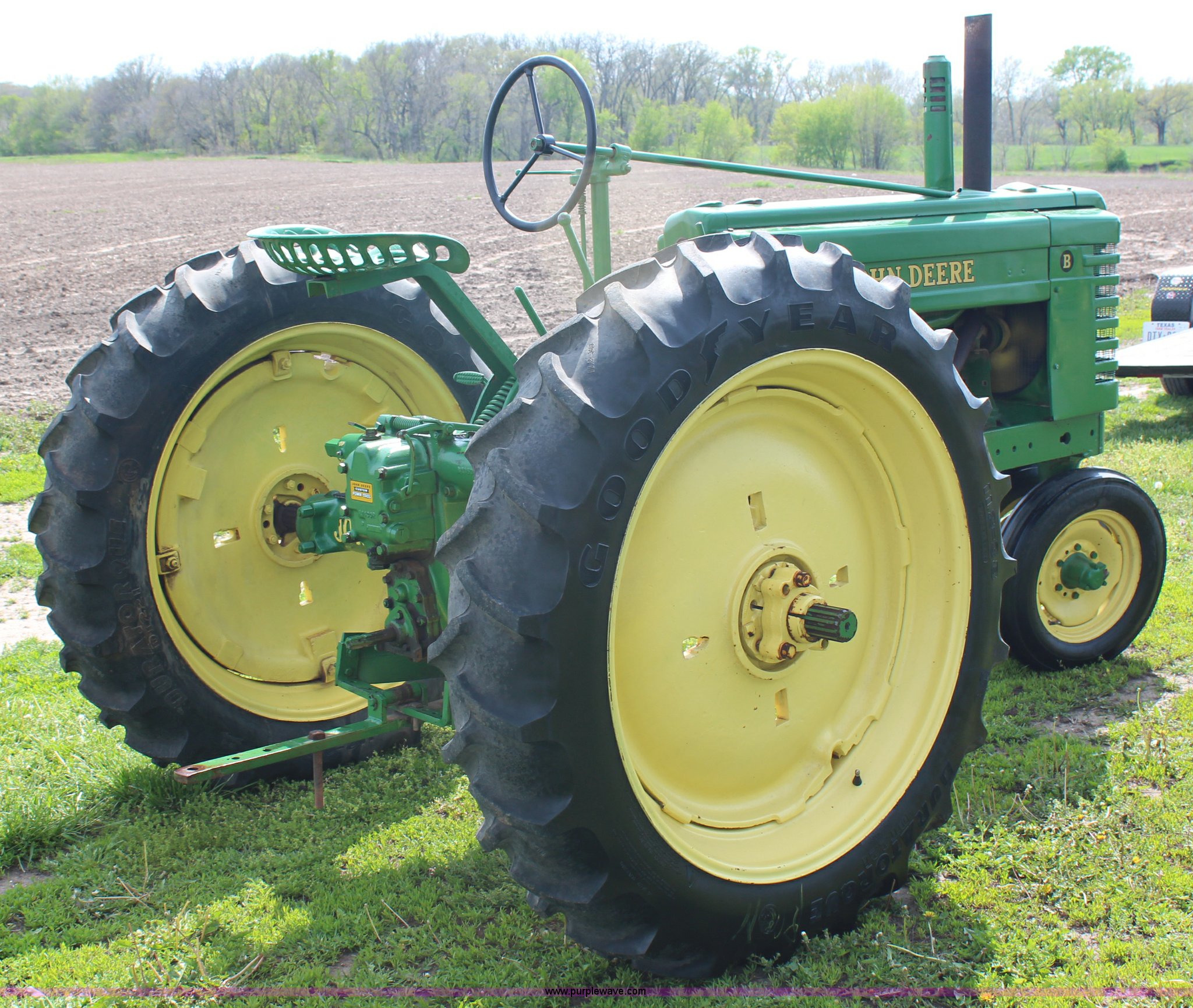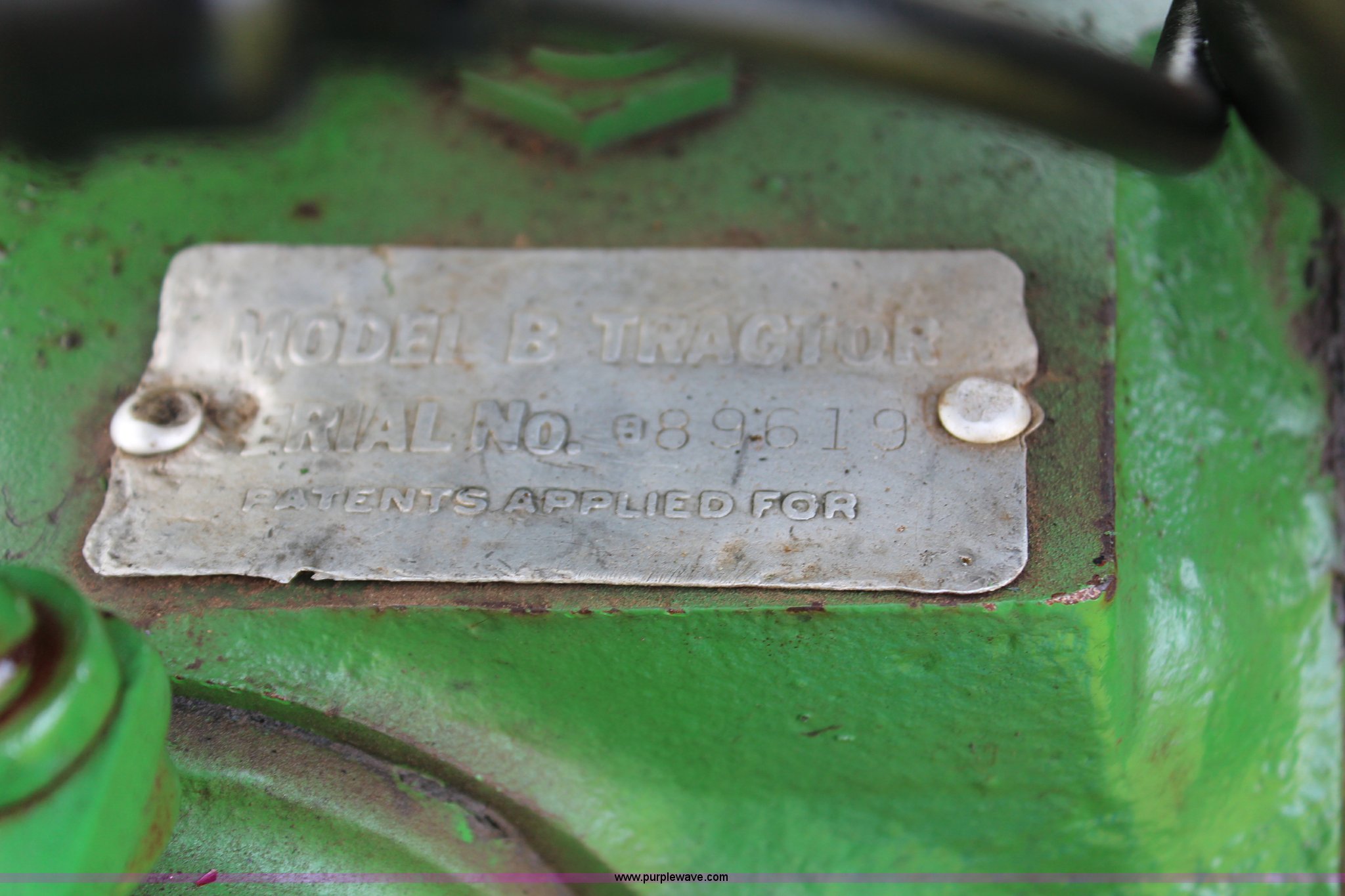Purple Wave is selling a used Tractor in Kansas. This item is a 1940 John Deere B tractor with the following: Two cylinder gas engine, Two speed transmission, High and Low, 540 PTO, Draw bar, 5.00-15 front tires, 11.2-38 rear tires, Serial 89619