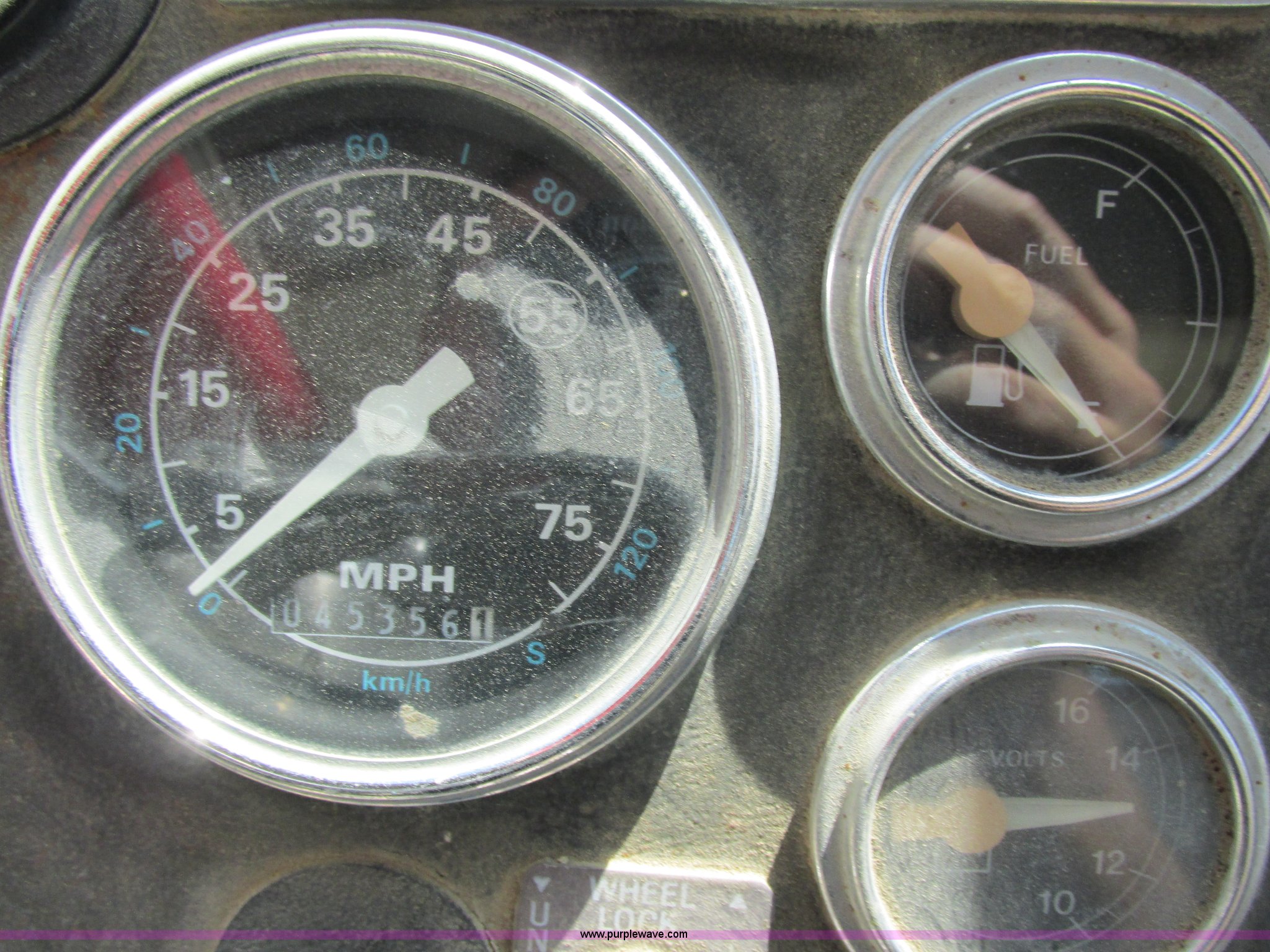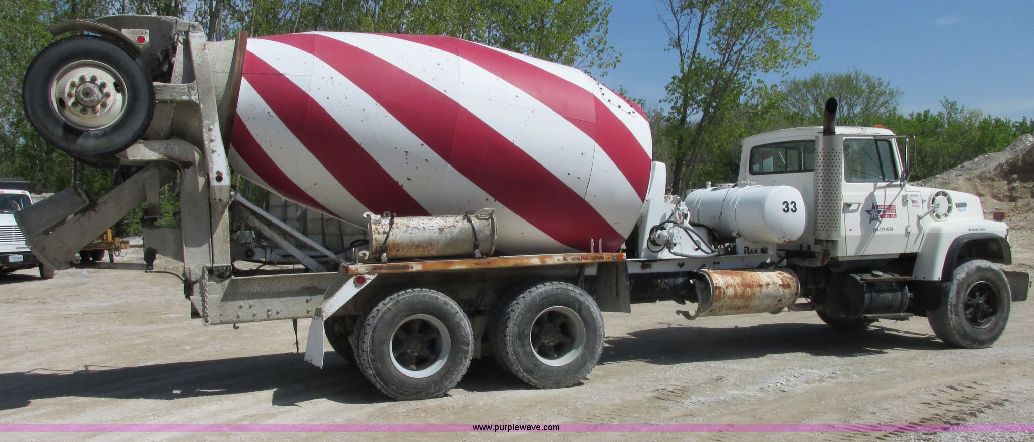 Purple Wave is selling a used Ready Mix or Pump Truck in Missouri. This item is a 1992 Ford L9000 mixer truck with the following: 45,356 miles on odometer, Cummins L10 10.0L L6 diesel engine, Road Ranger seven speed manual transmission, Locking differential, Rex 770E adustawate mixer, 11 cu. yd. capacity, (3) additional chute pieces, Rear chute and drum controls, Serial 110RLM4109, 150 gallon water tank, 50 gallon fuel tank, Tag axle, 425/65R22.5 front tires, 11R22.5 rear tires, Dash cracked, Interior/exterior cosmetic damage, Minor leaks, Paint wear, Unit 33
