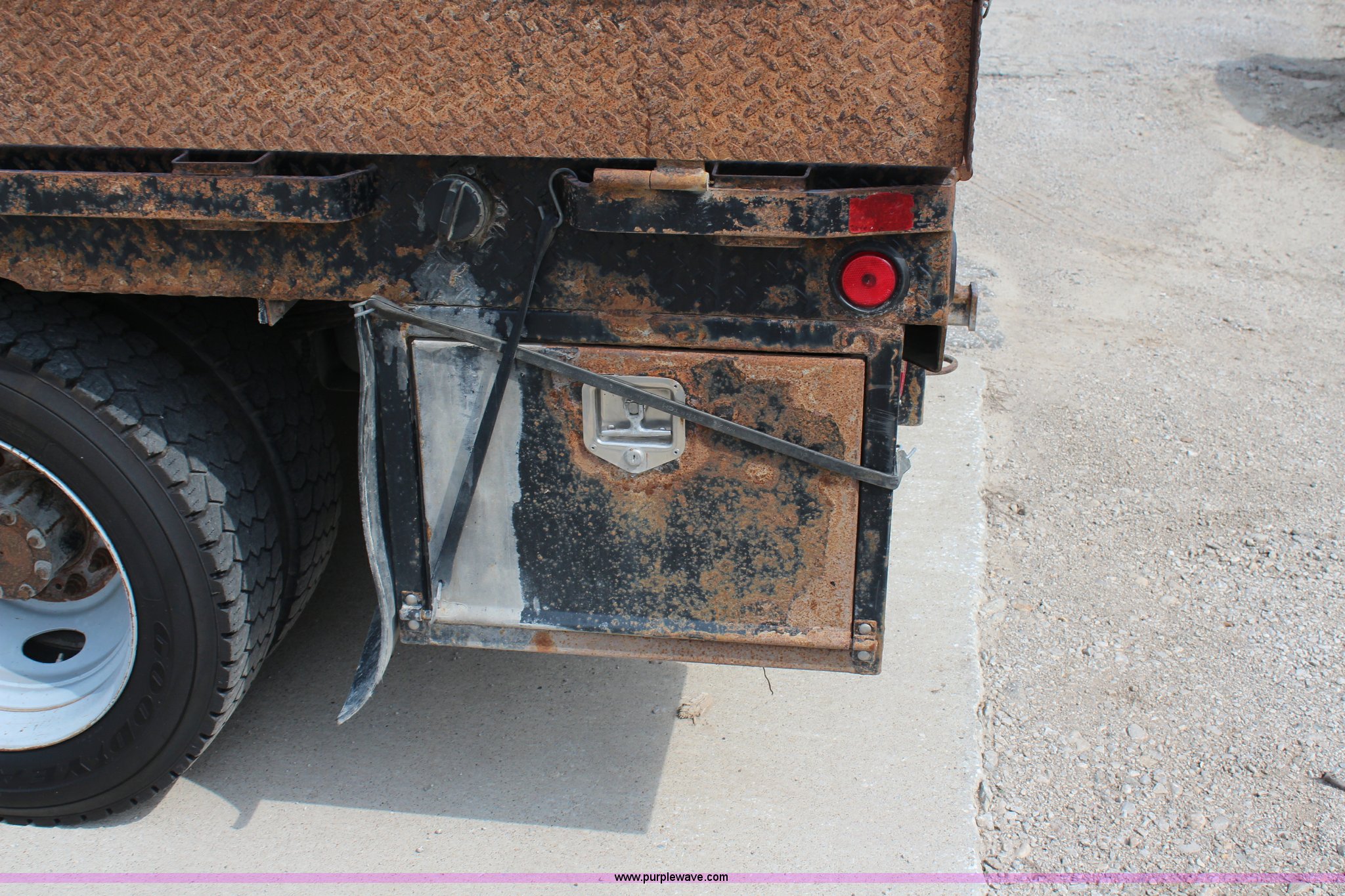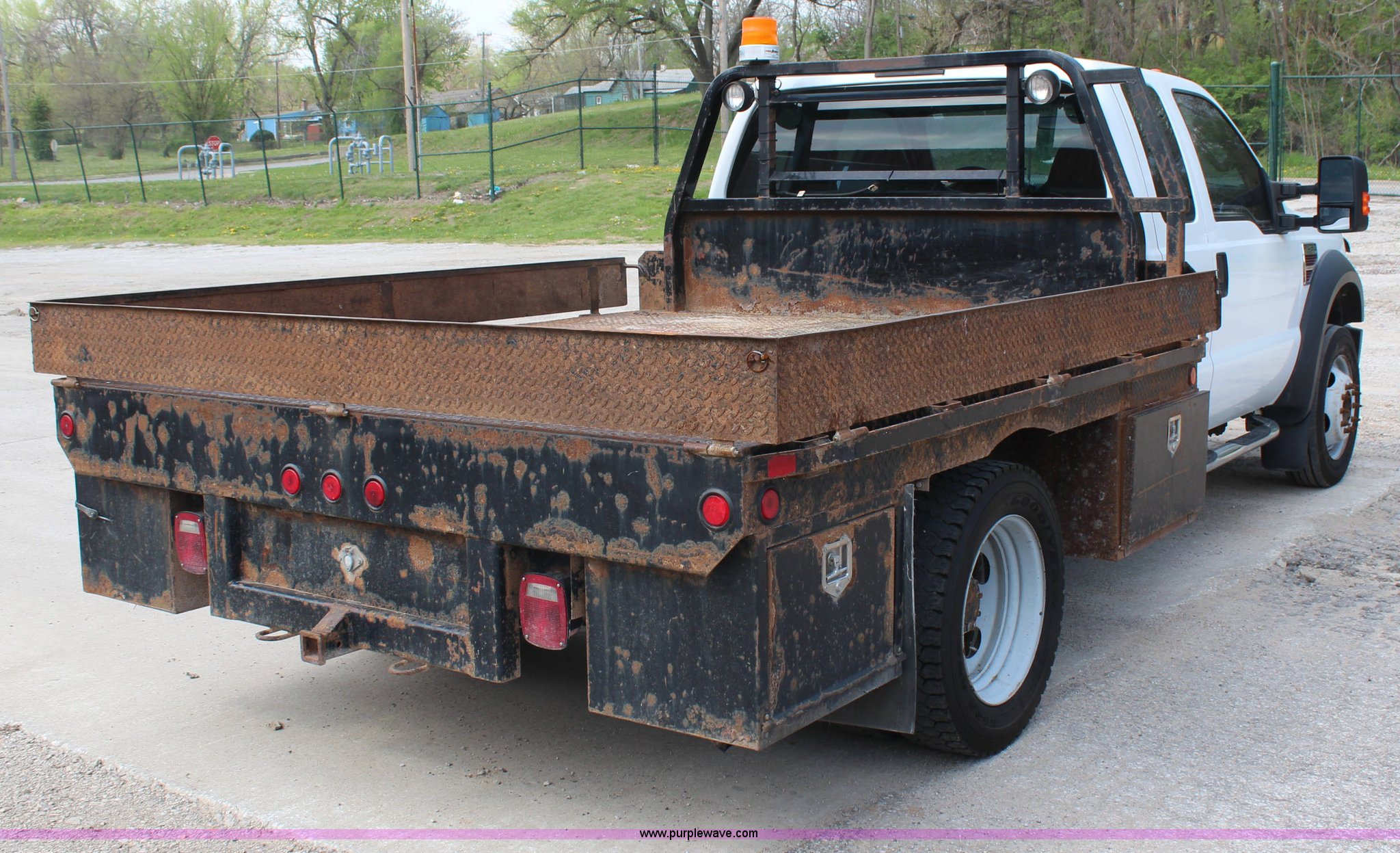 Purple Wave is selling a used Flat Bed Truck in Kansas. This item is a 2008 Ford F450 Super Duty SuperCab flatbed truck with the following: 224,513 miles on odometer, 6.4L V8 OHV 32V turbo diesel engine, Automatic transmission, AC and heat, Tilt, Cruise, AM/FM/CD, Power windows, locks, and mirrors, Cloth interior, Brake controller, 9'L x 8'4"W flatbed, 8.5"H sides, (4) under bed toolboxes, Receiver hitch, 225/70R19.5 tires, Dent in front bumper