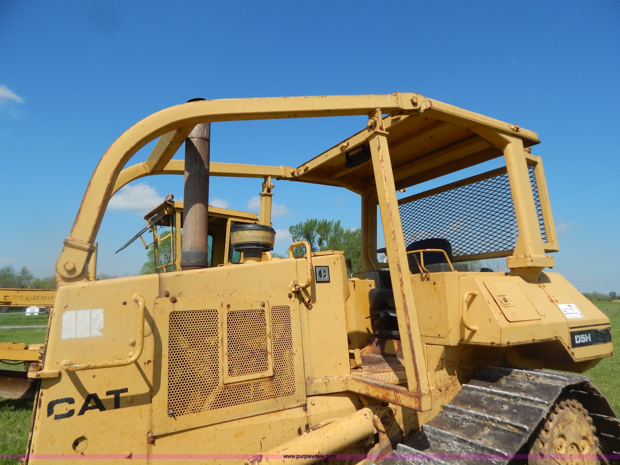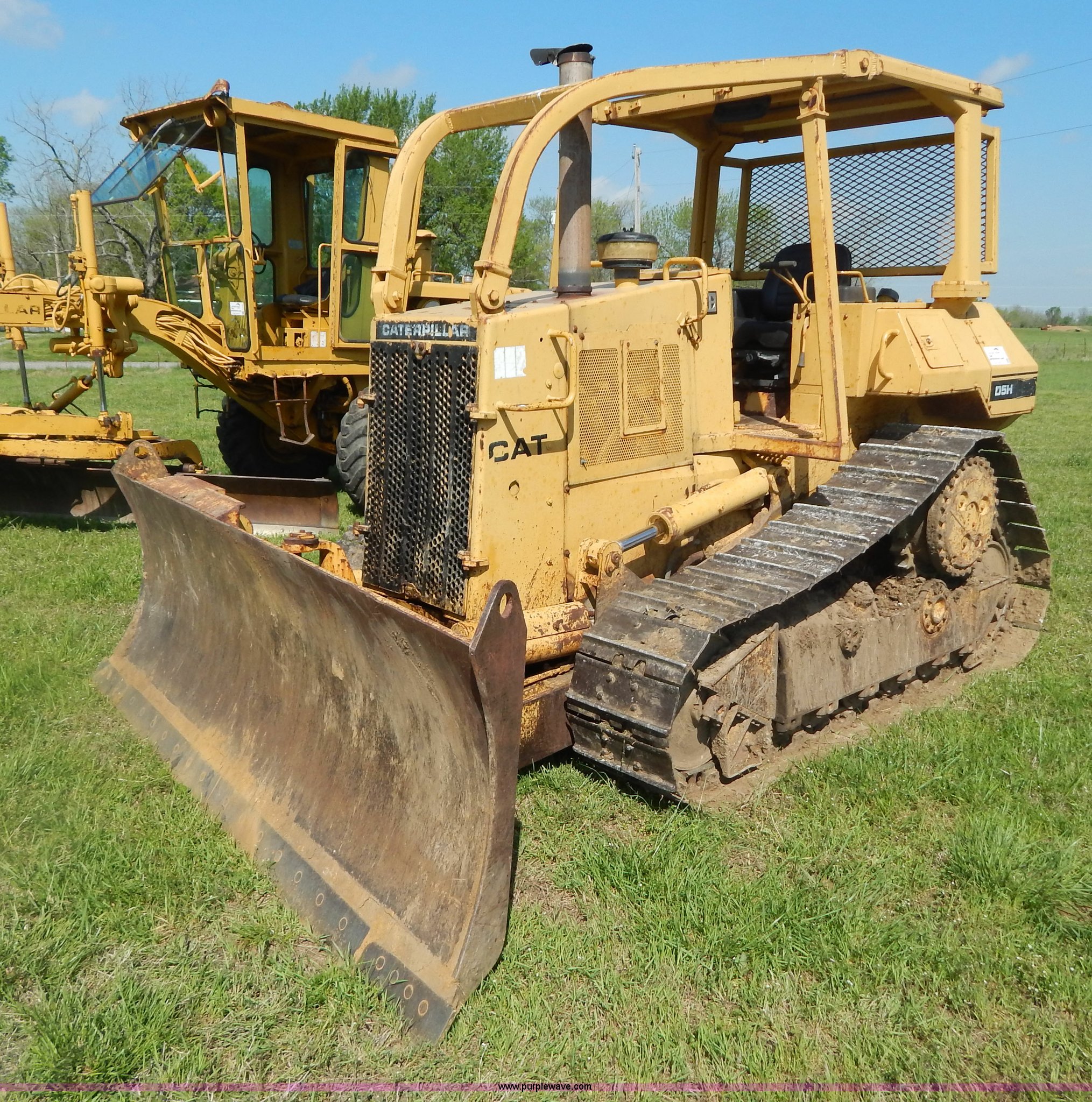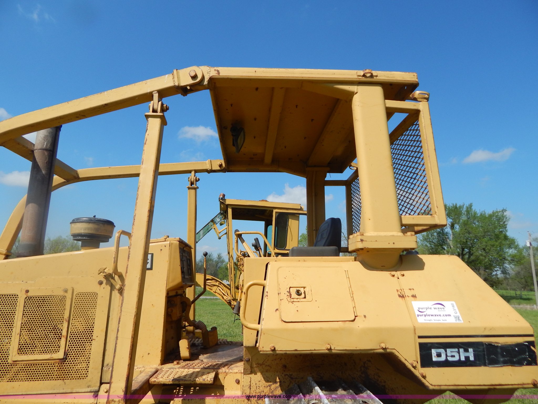 Purple Wave is selling a used Crawler Dozer in Oklahoma. This item is a 1986 Caterpillar D5H dozer with the following: 2,022 hours on meter, Caterpillar 3304 DI diesel engine, Serial 09205126, Powershift transmission, 3F-3R gears, Serial 1RE00406, OROPS with sweeps, Joystic blade control, 10.5'W six way blade, Smooth bolt on cutting edge, 20"W track pads, (6) bottom rollers, Rear pin hitch, 26,641 lbs. base operating weight, Serial 3MD00446