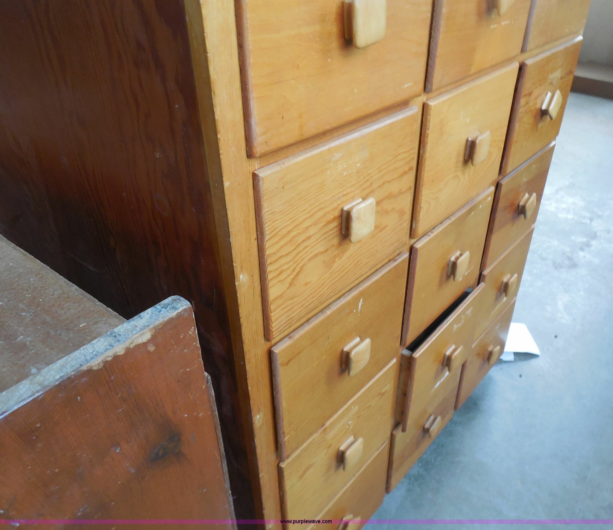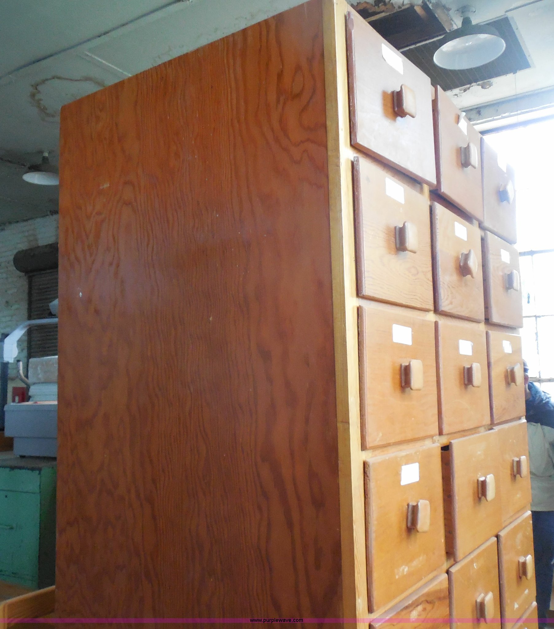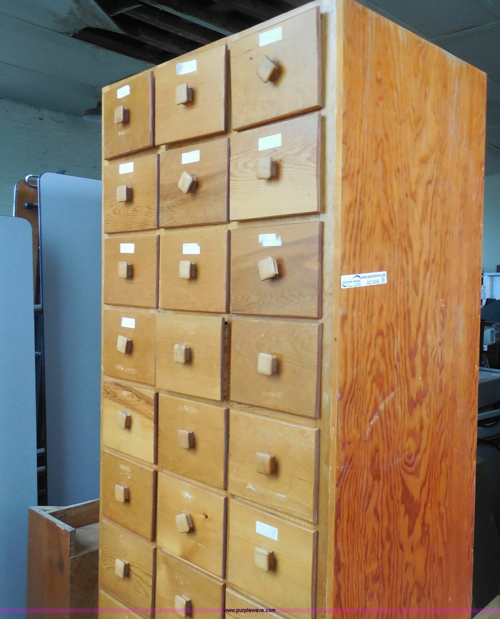 Purple Wave is selling a used Furniture in Kansas. This item is a Wooden storage cabinet with the following: 30 drawers, 24"L x 36"W x 84"H