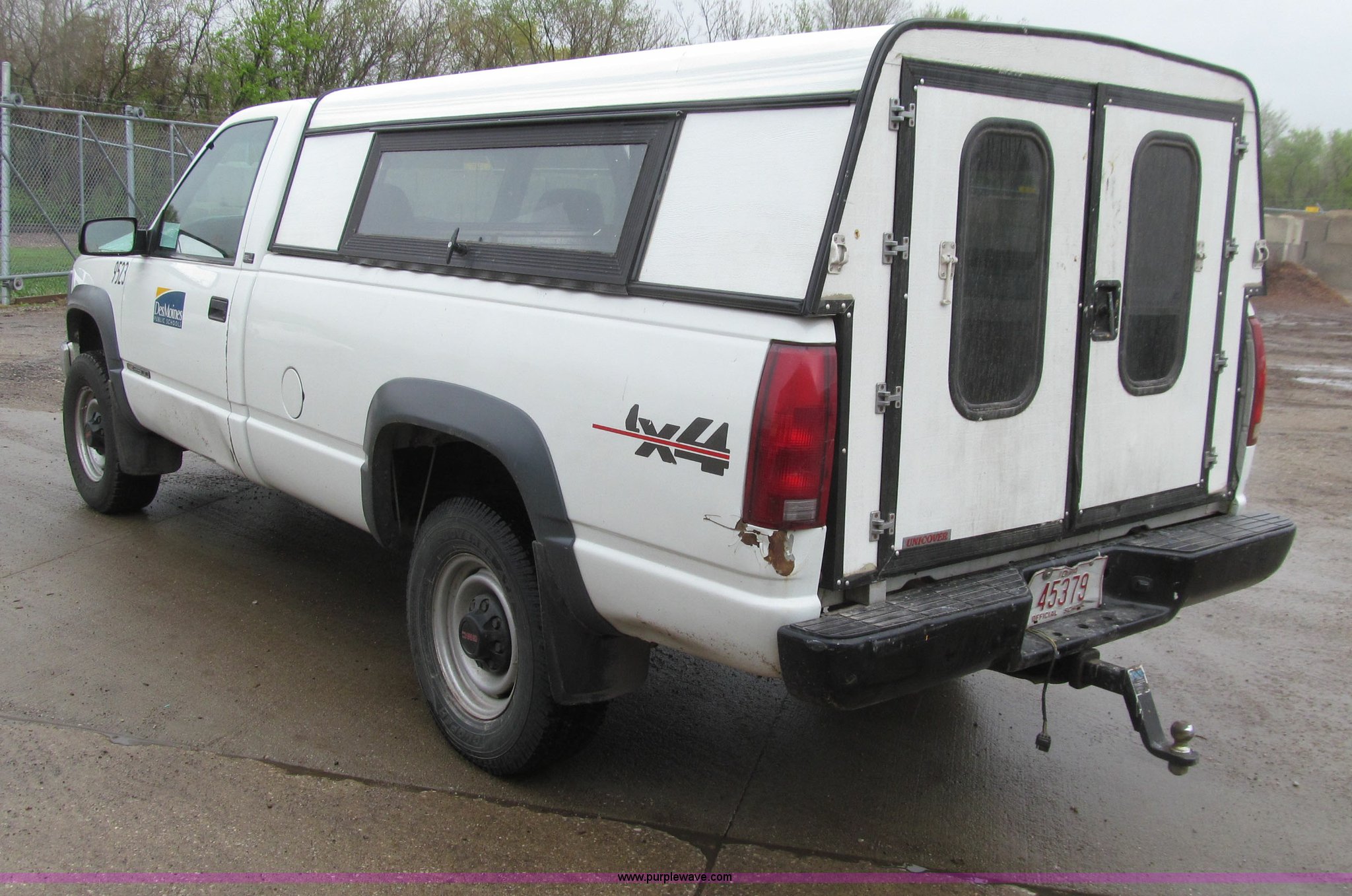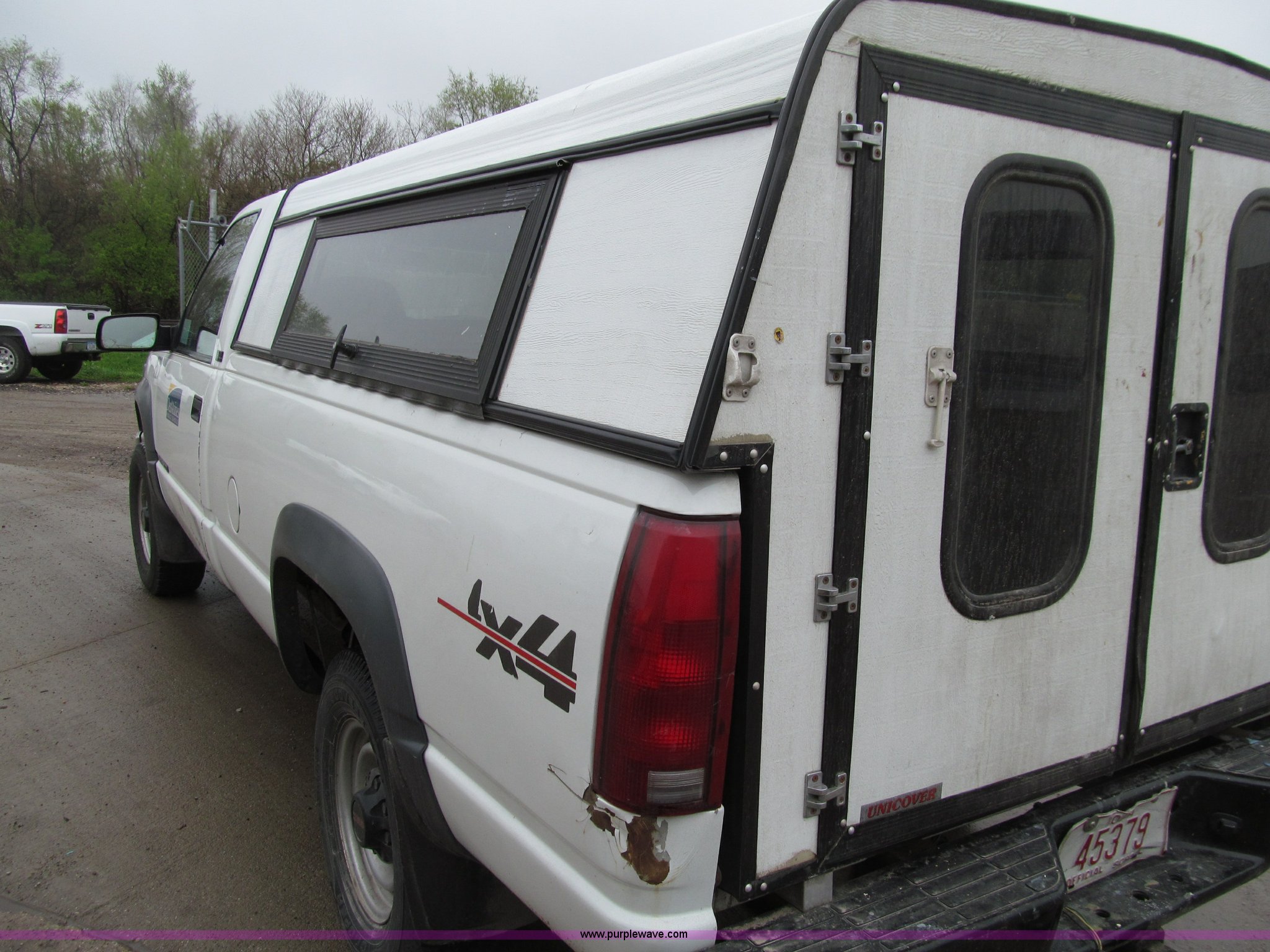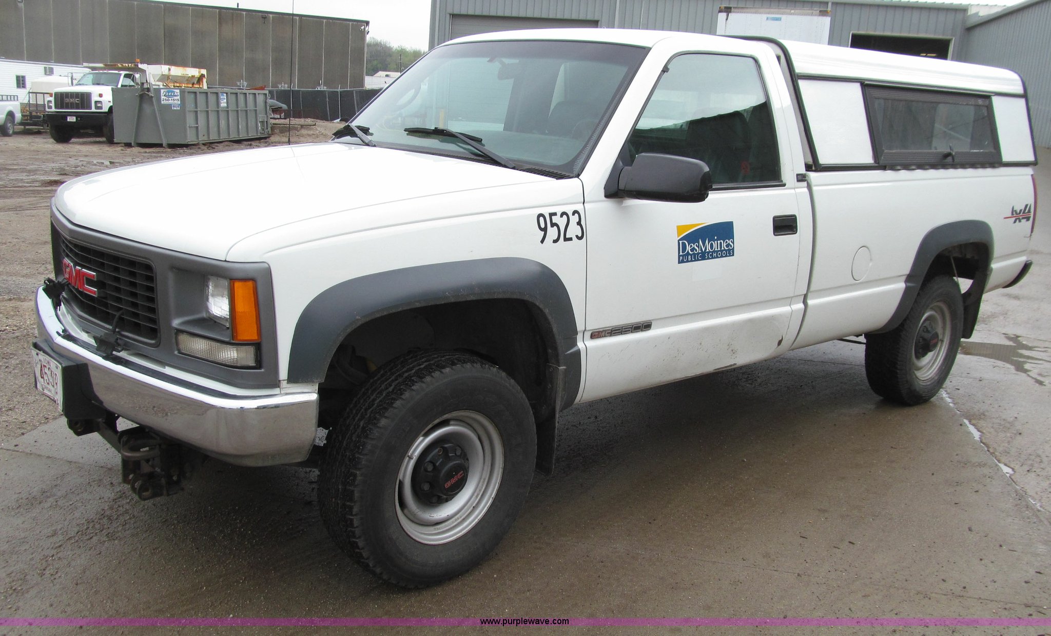 Purple Wave is selling a used Passenger Vehicle in Iowa. This item is a 1995 GMC 2500 SL pickup truck with the following: 92,958 miles on odometer, 5.7L V8 gas engine, Automatic transmission, Four wheel drive, Heat, Tilt, Cruise, AM/FM, Manual windows and locks, Vinyl interior, UniCover aluminum topper, Long bed, Receiver hitch, Trailer wiring, LT245/75R16 tires, Interior/exterior cosmetic damage, Front and rear bumper dented, Driver's door dented, Passenger door gouged, Front fender rust, Brake issues, Unit# 9523