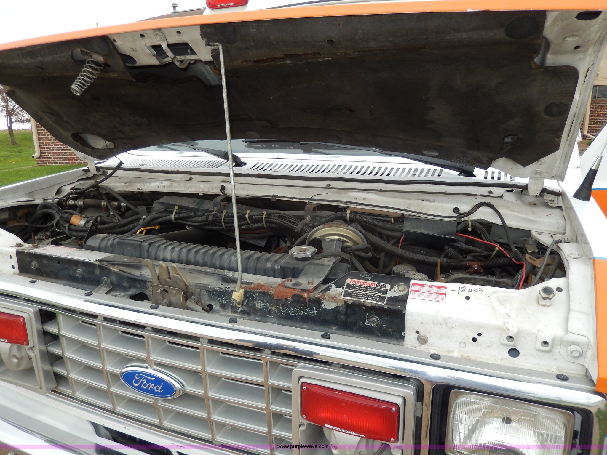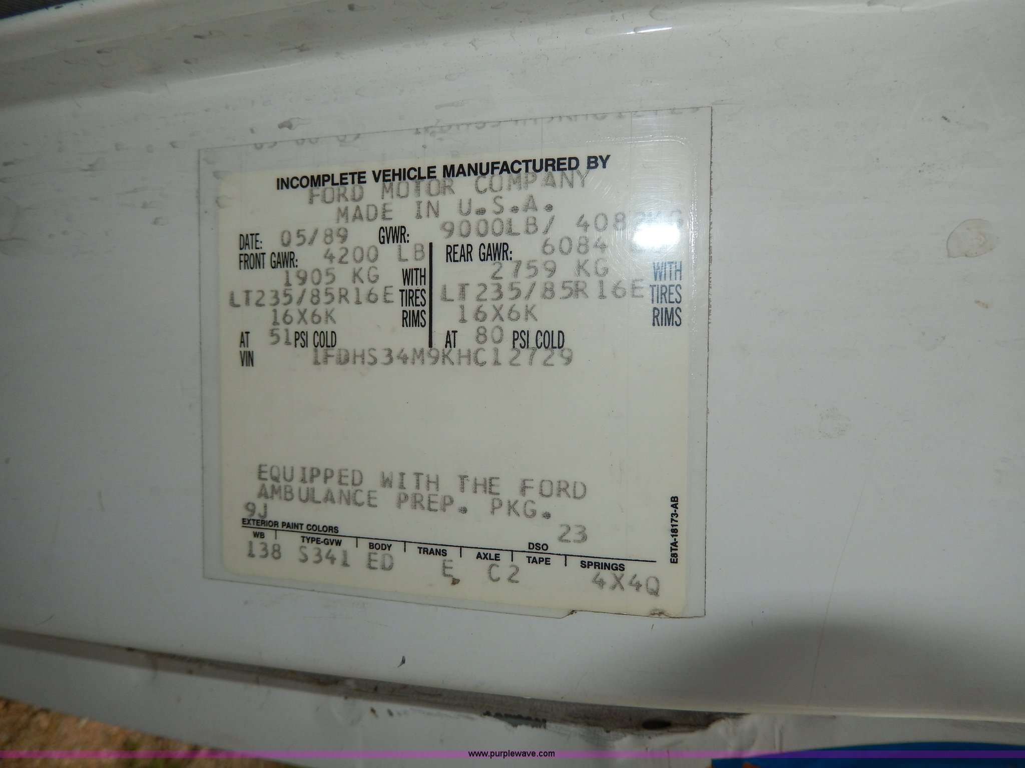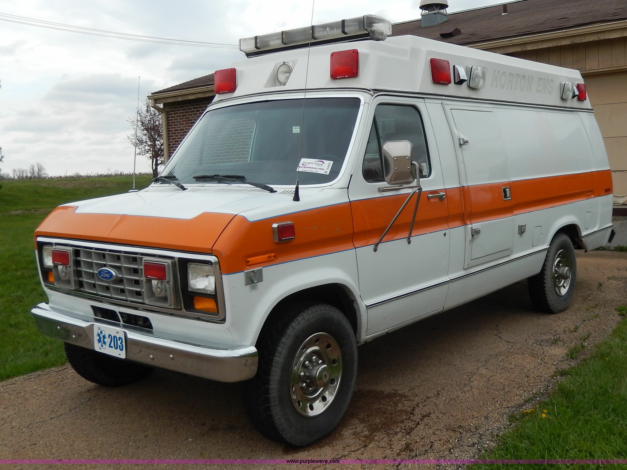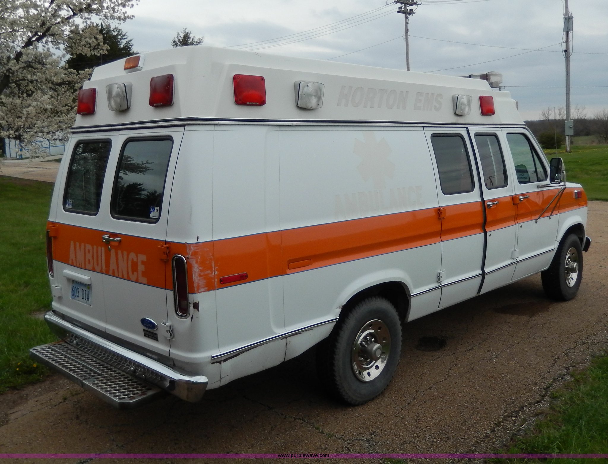 Purple Wave is selling a used Passenger Vehicle in Kansas. This item is a 1989 Ford E350 Econoline XLT ambulance with the following: 27,399 miles on odometer, 7.3L V8 OHV 16V diesel engine, Automatic transmission, AC and heat, Cruise, Inoperable, Manual windows and locks, Vinyl seats, Light/siren control, Power inverter, Interior and exterior power points, Rear vinyl bench, Underside storage, Storage cabinets, Dual temperature controls, Exterior light bar, Vacuum and oxygen hookups, Dual fuel tanks, Block heater, 245/75R16 tires, Interior/exterior cosmetic damage, Weak battery, Left front brake caliper stuck, Vehicle must be towed