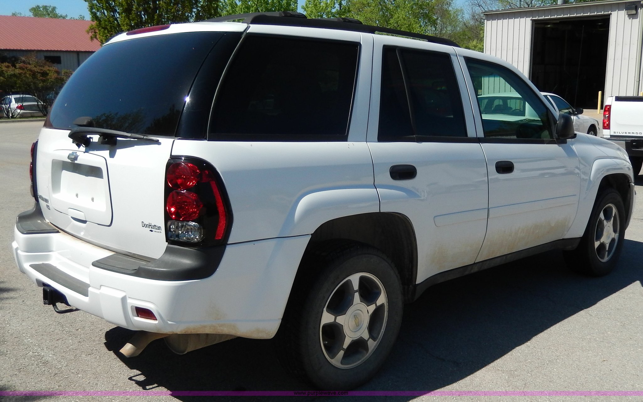 Purple Wave is selling a used Passenger Vehicle in Kansas. This item is a 2007 Chevrolet Trailblazer LS SUV with the following: 105,848 miles on odometer, 4.2L L6 DOHC 24V gas engine, Automatic transmission, Four wheel drive, AC and heat, Tilt, Cruise, AM/FM/CD, Power windows, locks, and mirrors, Cloth interior, Rear window defrost, Receiver hitch, Trailer wiring, 245/65R17 tires