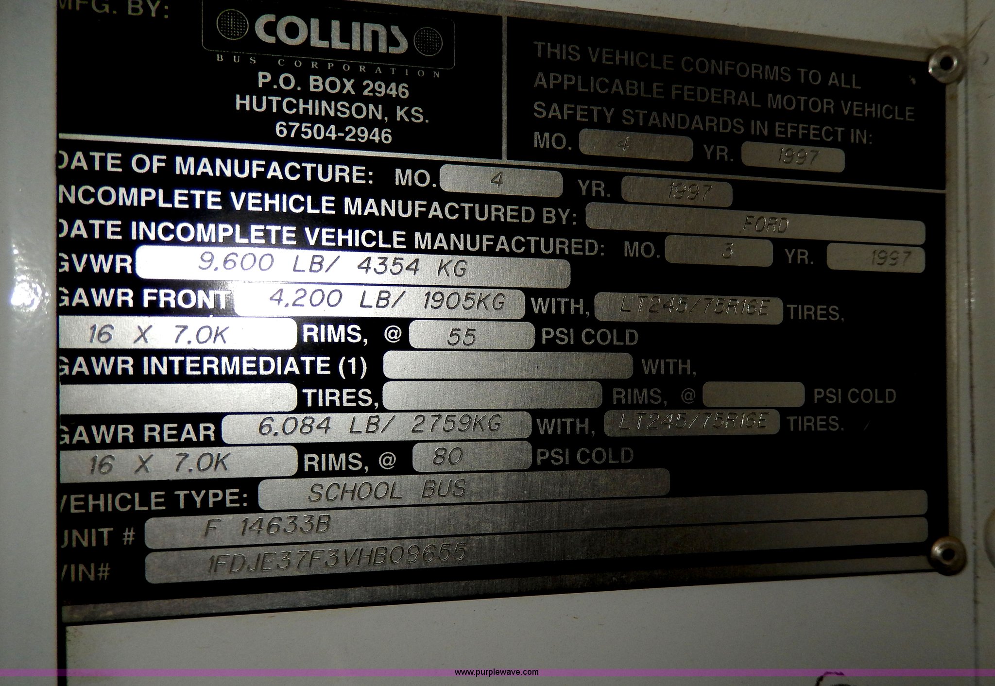 1997 Ford Collins school bus. 166,002 miles on odometer, 18 passenger, 7.3L V8 diesel engine, Automatic transmission, Heat, Manual windows and locks, Vinyl seats, Heated mirrors, Seat belts, Block heater, 245/75R16 tires, GVWR 9,600 lbs, Exterior cosmetic damage, Dents and scratches, Body rust, Stereo missing, Unit# 27. 1FDJE37F3VHB09655. Shipping quotes available. USD 473. 320 E 4th. Chapman, KS 67431