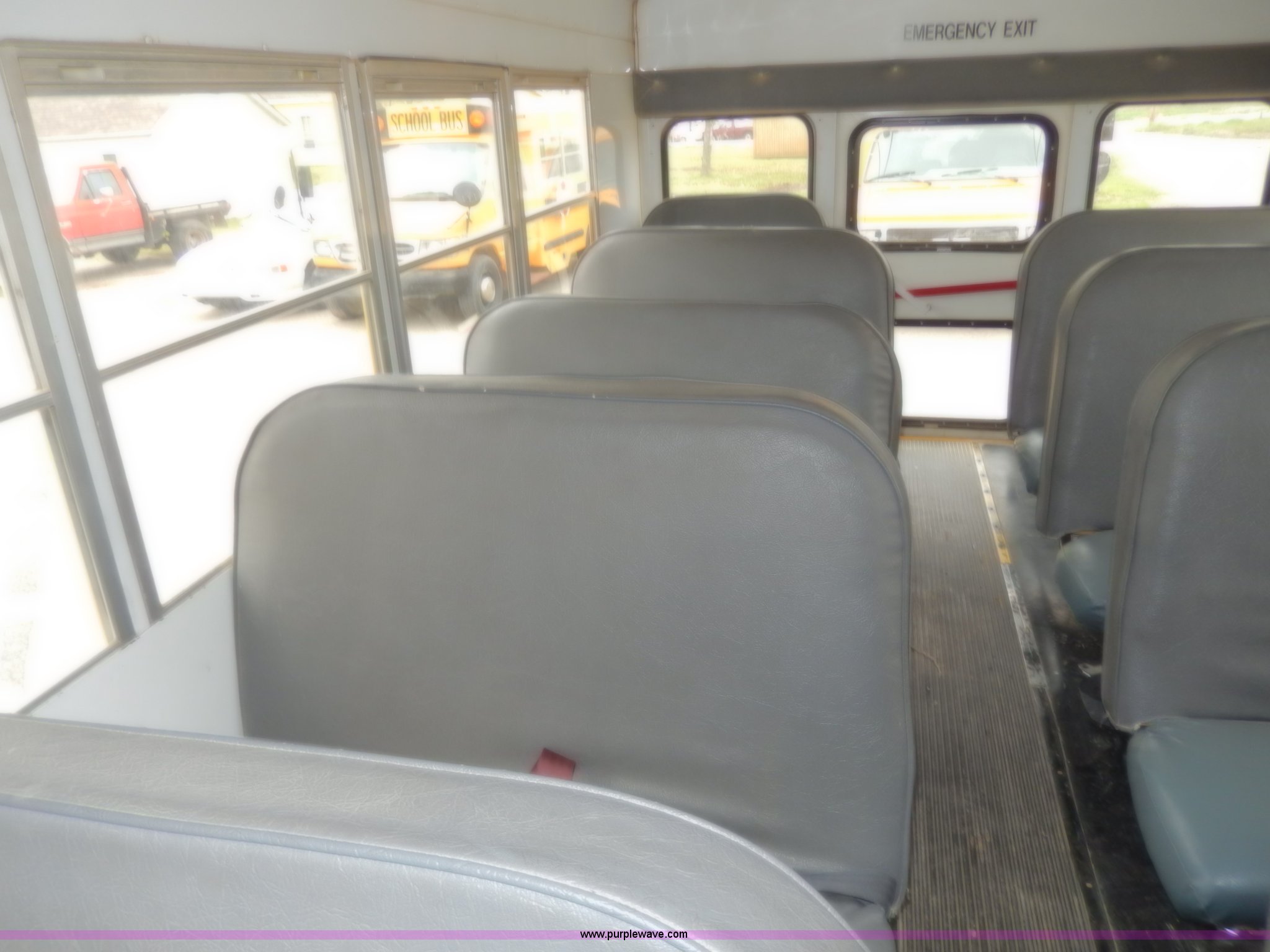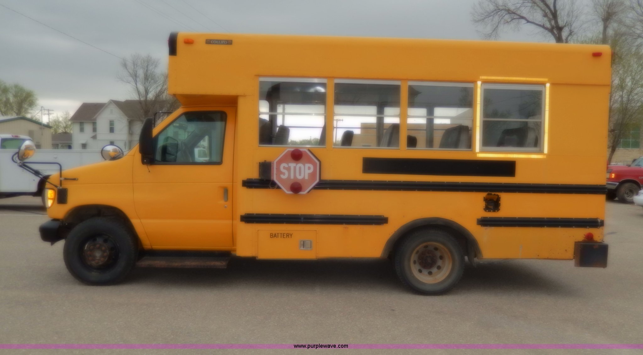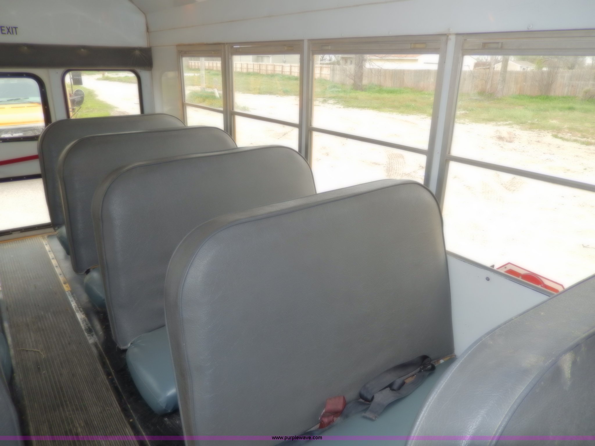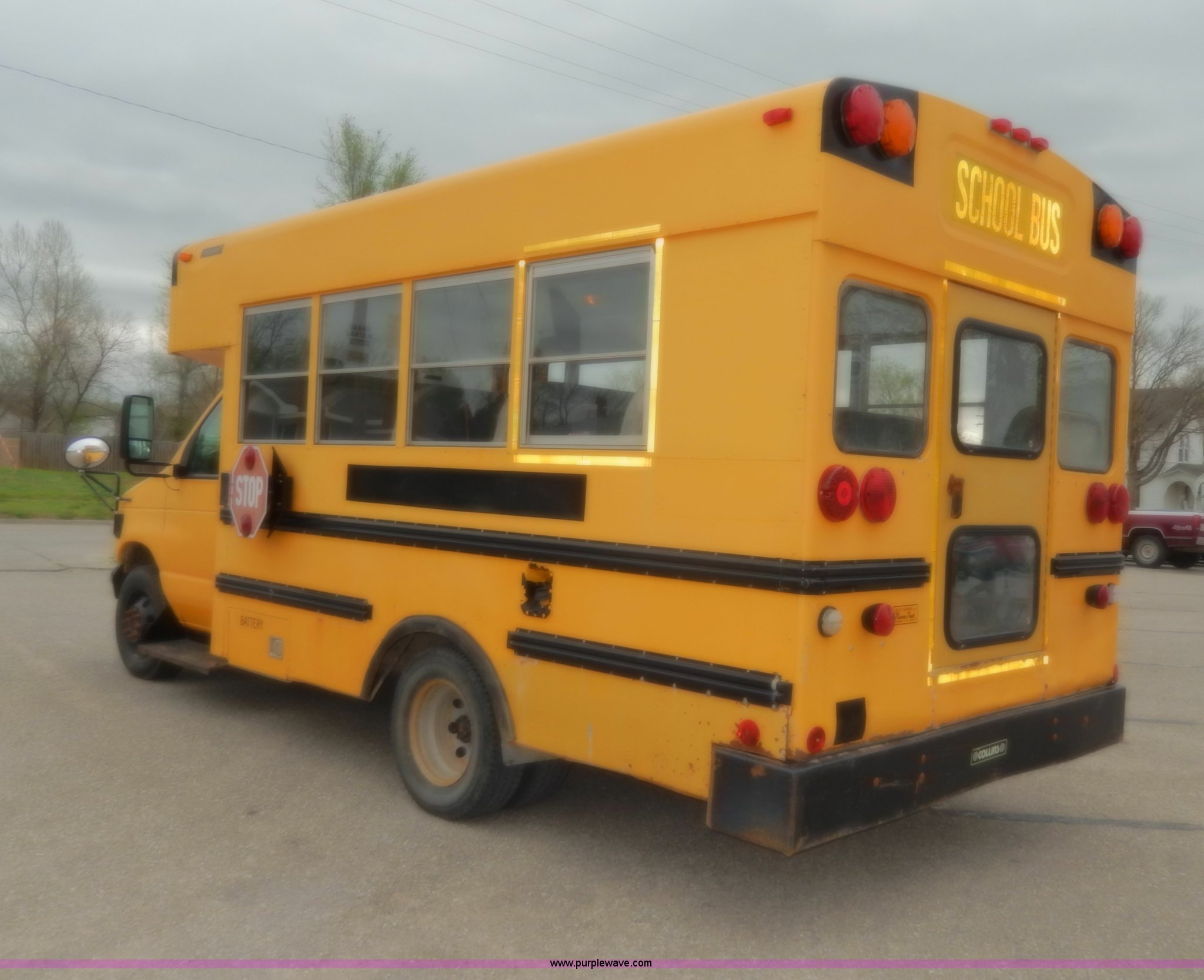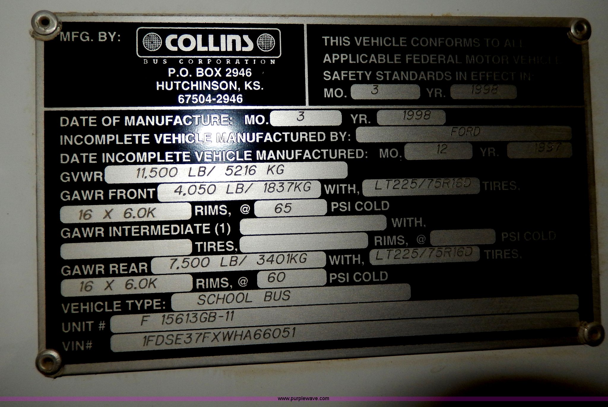 Purple Wave is selling a used Bus in Kansas. This item is a 1998 Ford Collins school bus with the following: 160,880 miles on odometer, 23 passenger, 7.3L V8 OHV 16V turbo diesel engine, Automatic transmission, Heat, AM/FM, Manual windows and locks, Vinyl seats, Block heater, Seat belts, Heated mirrors, 225/75R16 tires, GVWR 11,500 lbs, Exterior cosmetic damage, Body rust, Dents and scratches, Needs front end work, Unit# 37