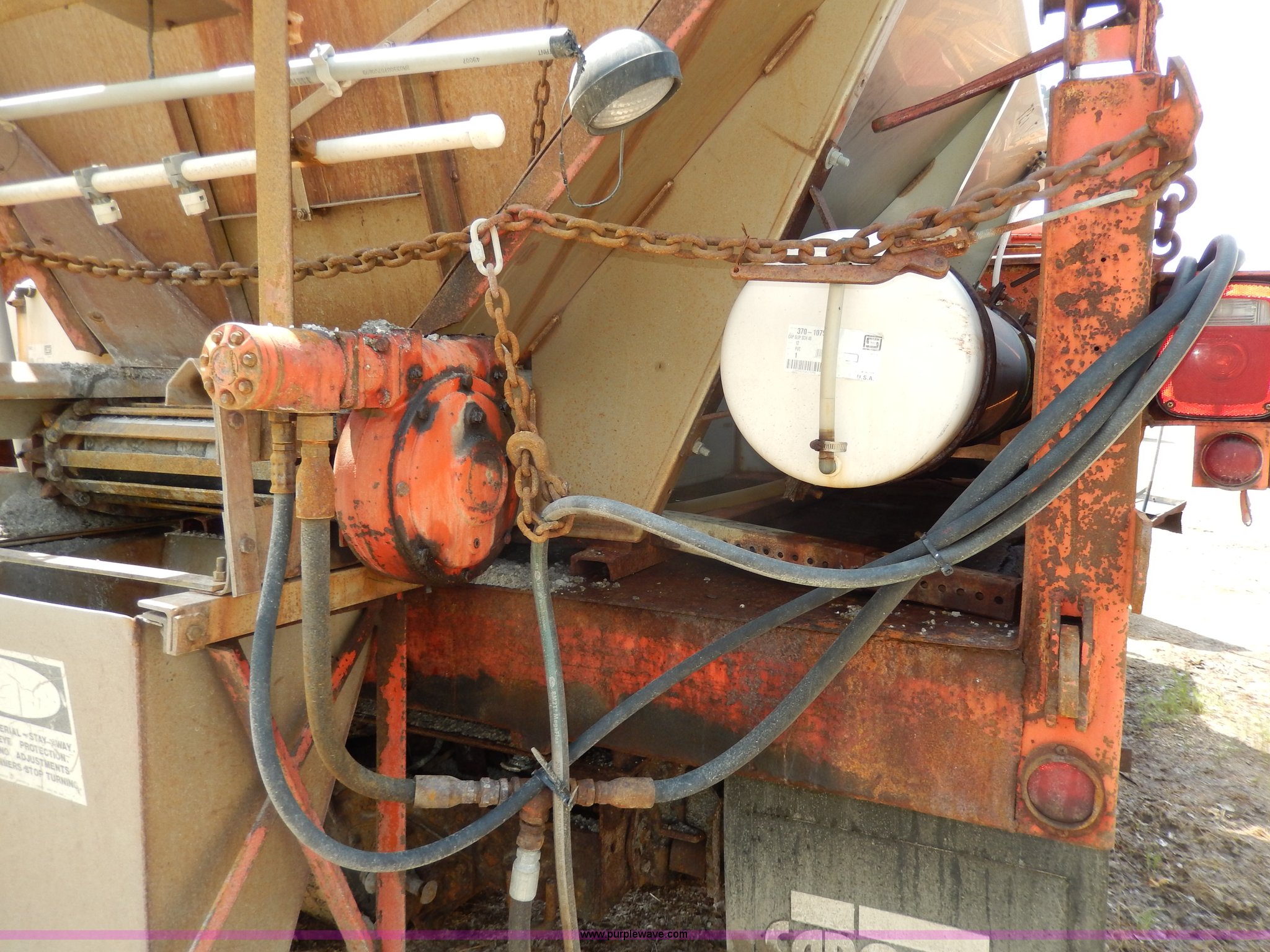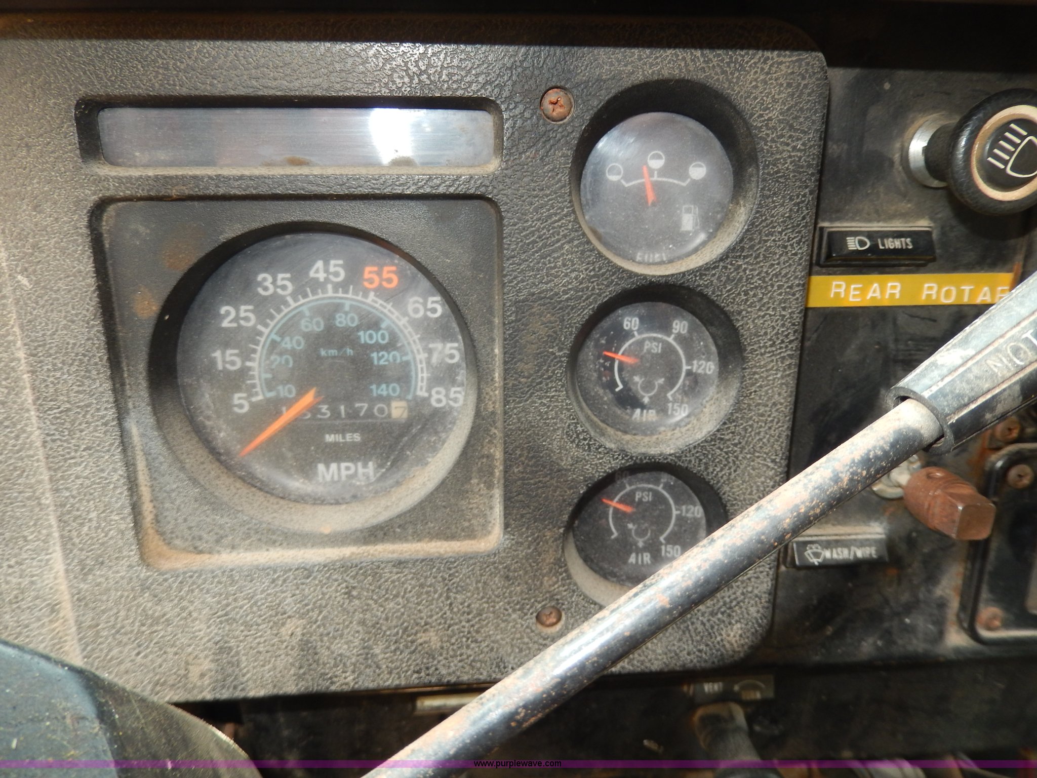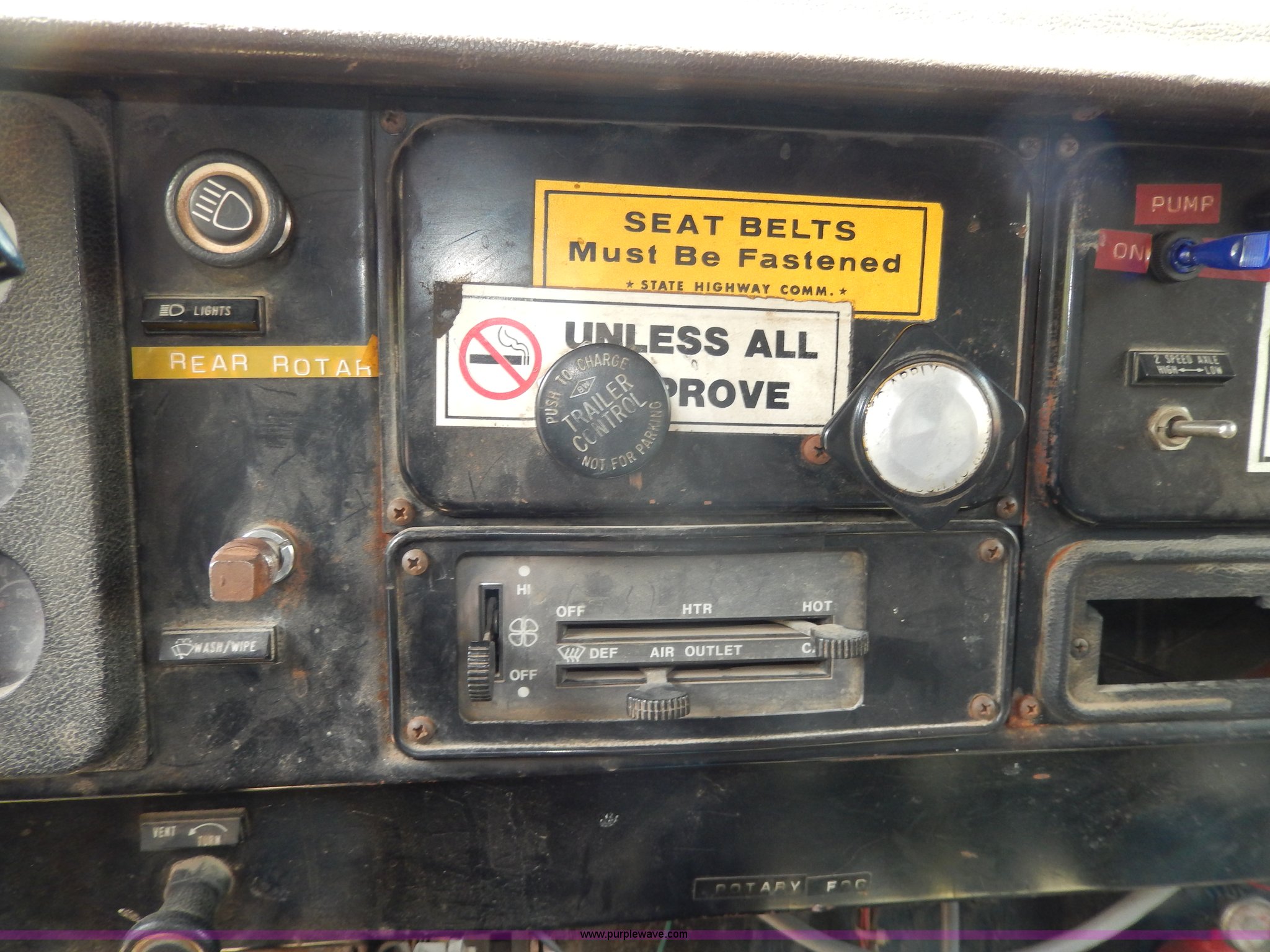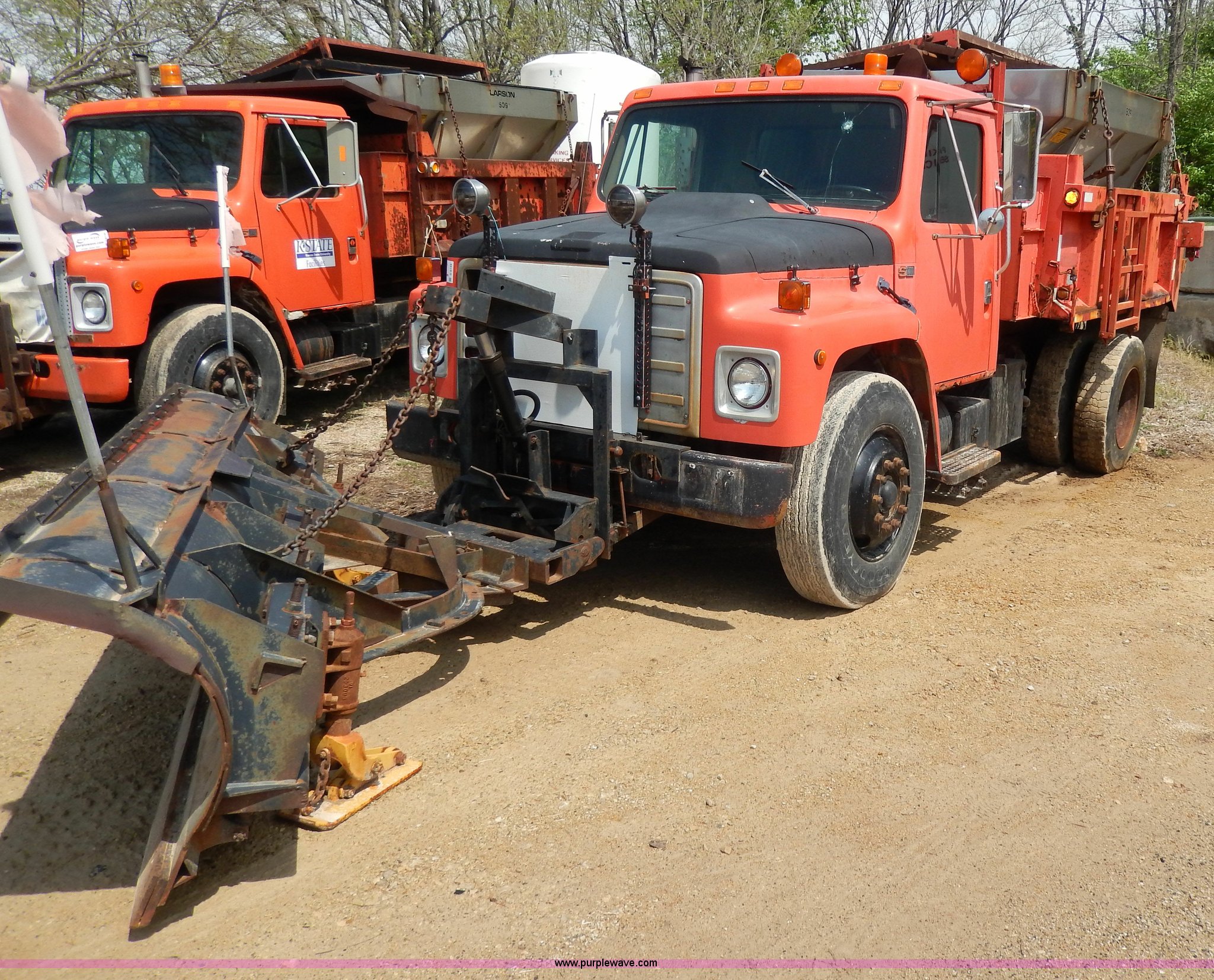 Purple Wave is selling a used Construction Dump Truck in Kansas. This item is a 1984 International 1754 dump truck with the following: 153,171 miles on odometer, 1,225 hours on meter, Diesel engine, Automatic transmission, Heat, Spreader and plow controls, Vinyl seat, Smith 9' x 8' bed, Baker 459CS plow, 11'W, Larson 509 spreader, 9' x 8', 50 gallon fuel tank, Air brakes, Air brake hookups, 11R22.5 tires, GVWR 30,000 lbs, Cracked windshield, Stereo missing, Body rust