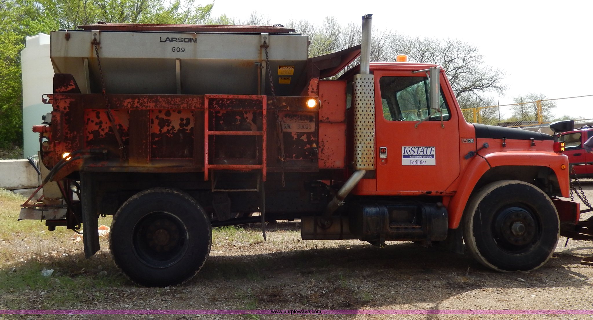 1985 International 1754 dump truck. 210,085 miles on odometer, 1,499 hours on meter, International DV550 9.0L V8 diesel engine, Automatic transmission, Heat, Spreader and plow controls, Vinyl seats, Smith 9' x 8' bed, Baker 459CS plow 11'W, Larson 509 spreader 9' x 8', Block heater, Pintle hitch, 50 gallon fuel tank, 11R22.5 tires, GVWR 30,000 lbs, Body rust. 1HTLCHYNXFHA56658. Shipping quotes available. KSU Facilities. 226 Dykstra Hall. Manhattan, KS 66506