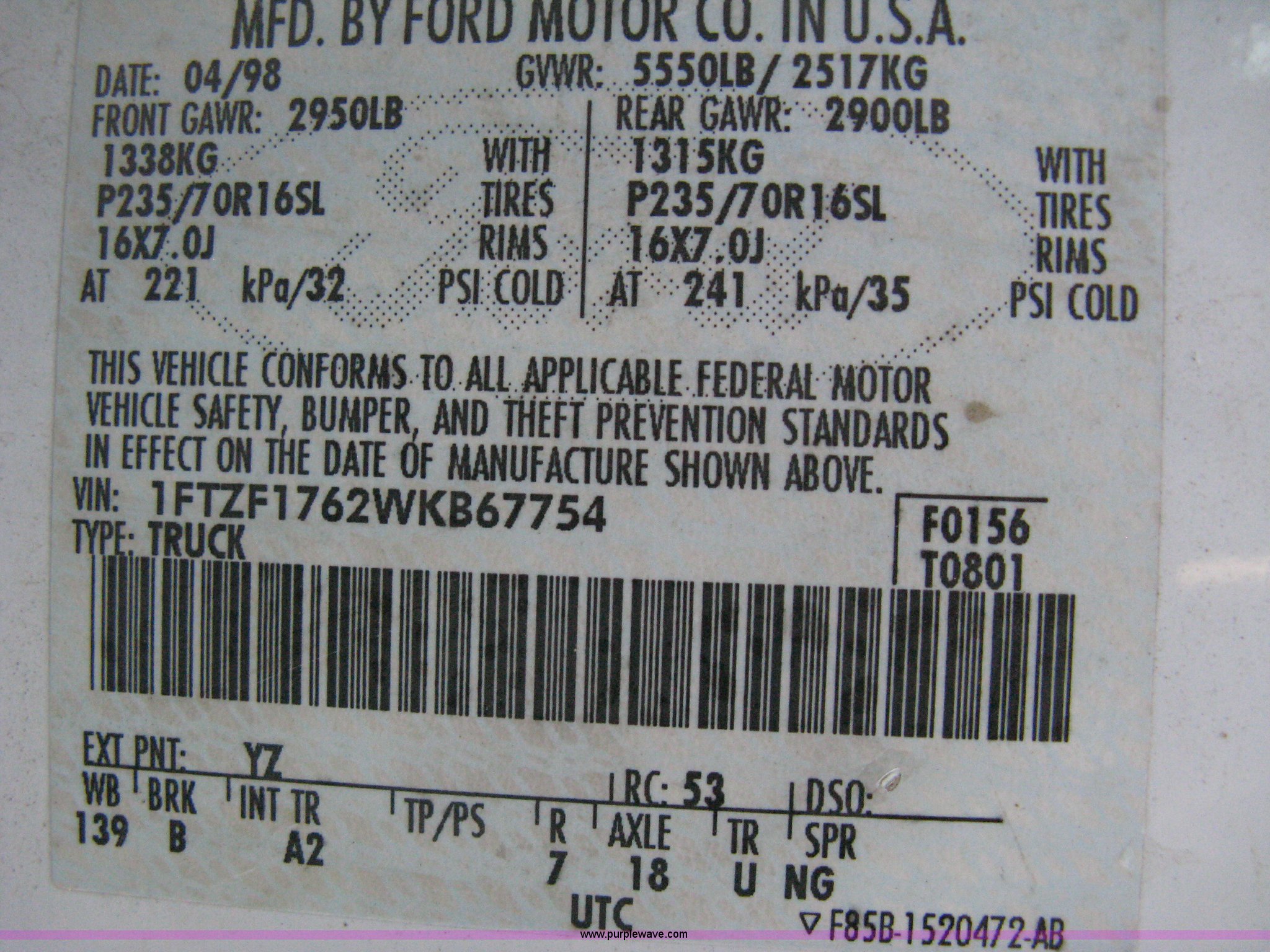 1998 Ford F150 XL Pickup truck. 116,927 miles on odometer, AC and heat, AM/FM, Manual windows and locks, Vinyl interior, Headache rack, TSC diamond plate single lid toolbox Damaged, Rubber bed mat, Receiver hitch, Trailer wiring, P235/70R16 tires, Glove box is sprung, Headliner separating , Rust, Spare tire, Unit# 104. 1FTZF1762WKB67754. Shipping quotes available. City of Hutchinson. 1500 S Plum. Hutchinson, KS 67504