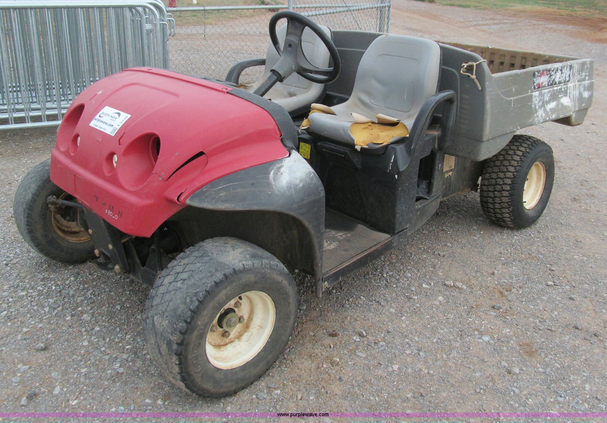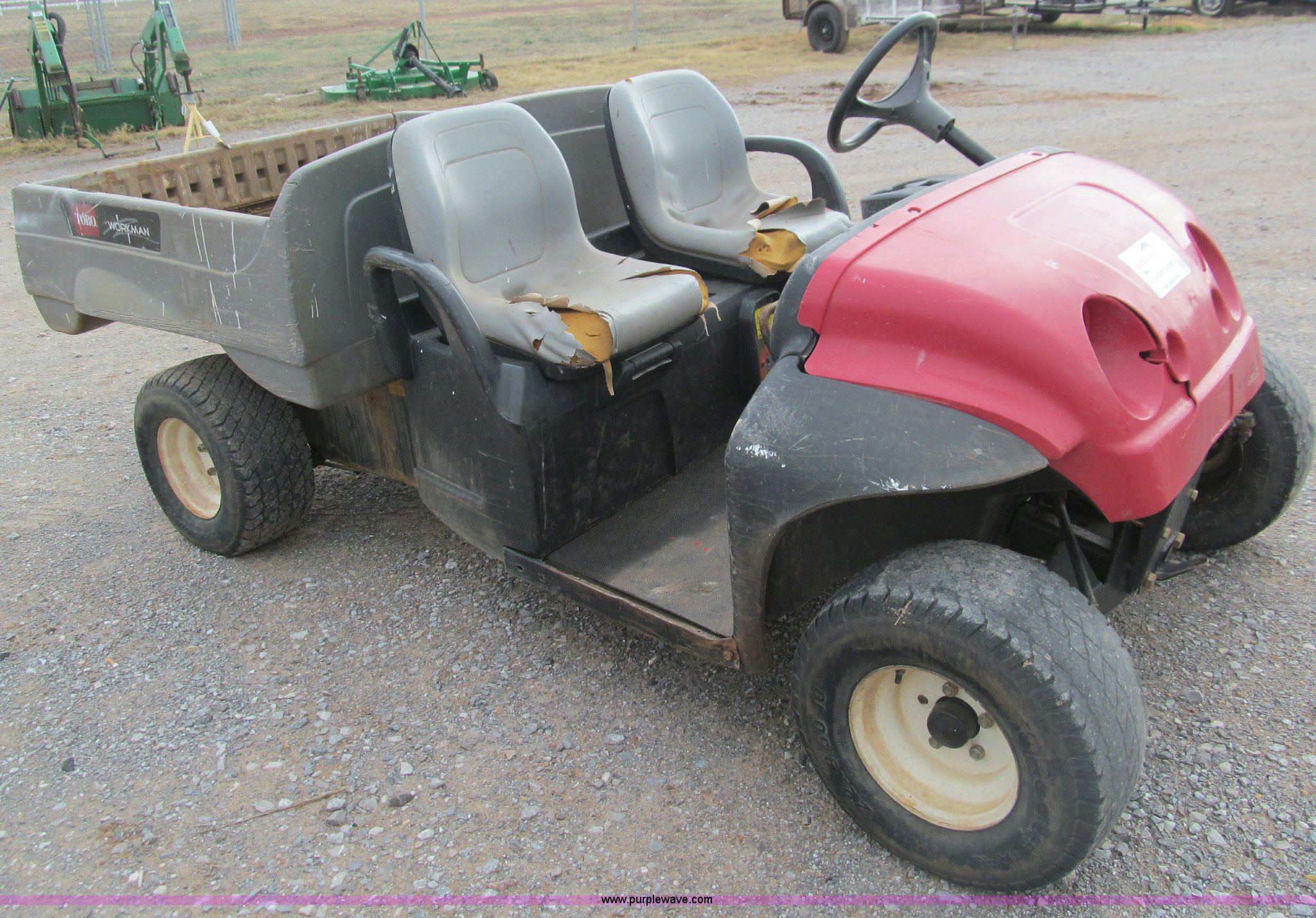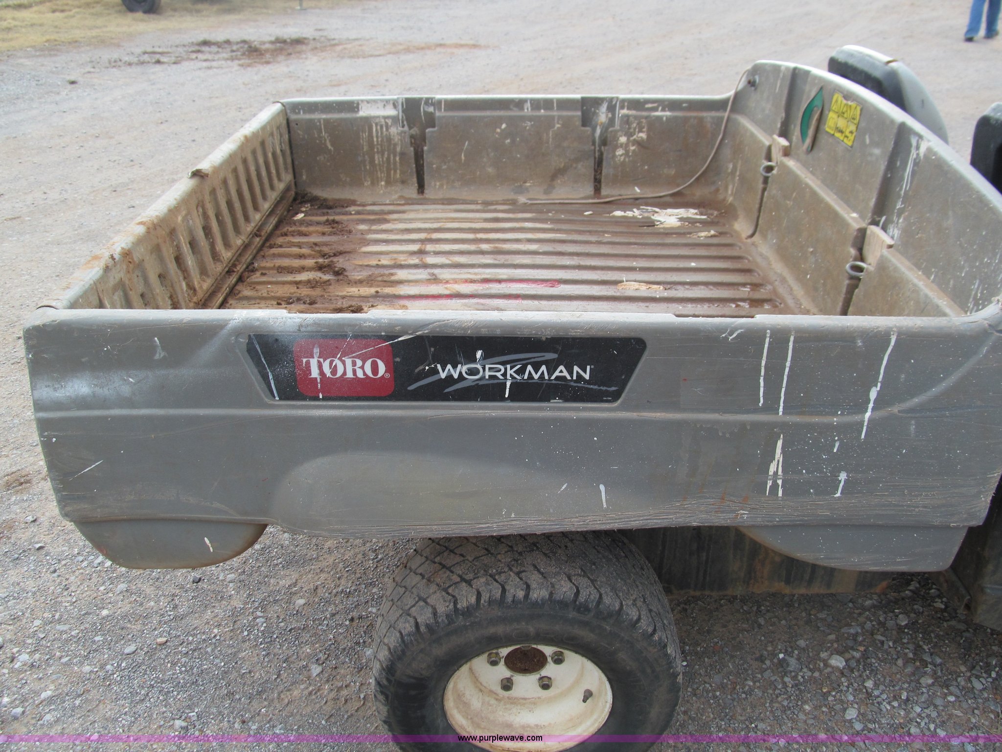 Purple Wave is selling a used Utility Vehicle in Oklahoma. This item is a 2006 Toro Workman utility vehicle with the following: Miles/hours unknown, Dump bed, 22 x 9.50-10 tires, Lift cylinder broken, Missing lights