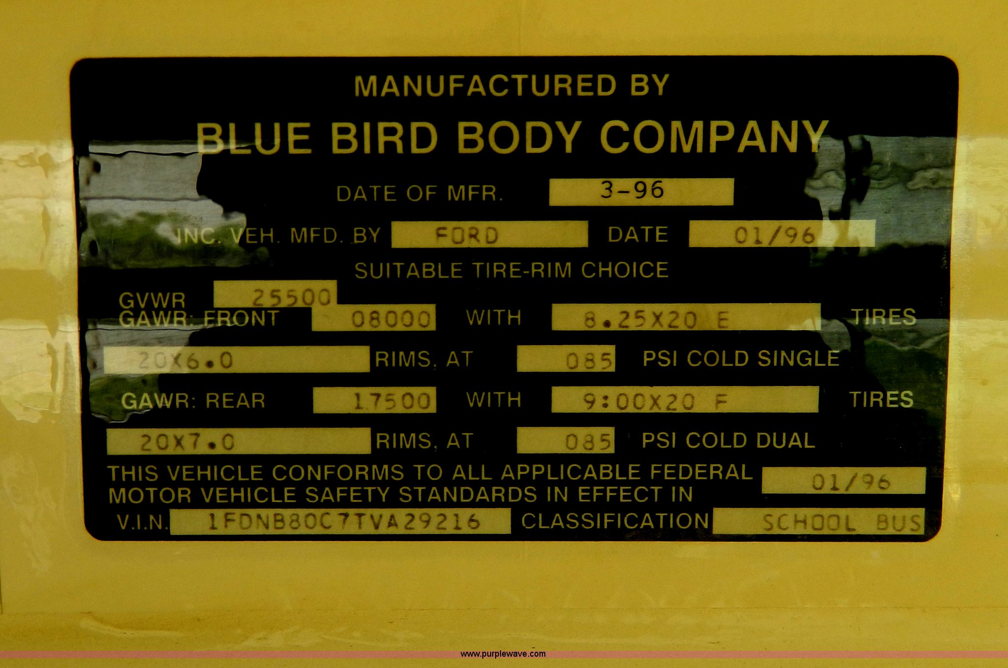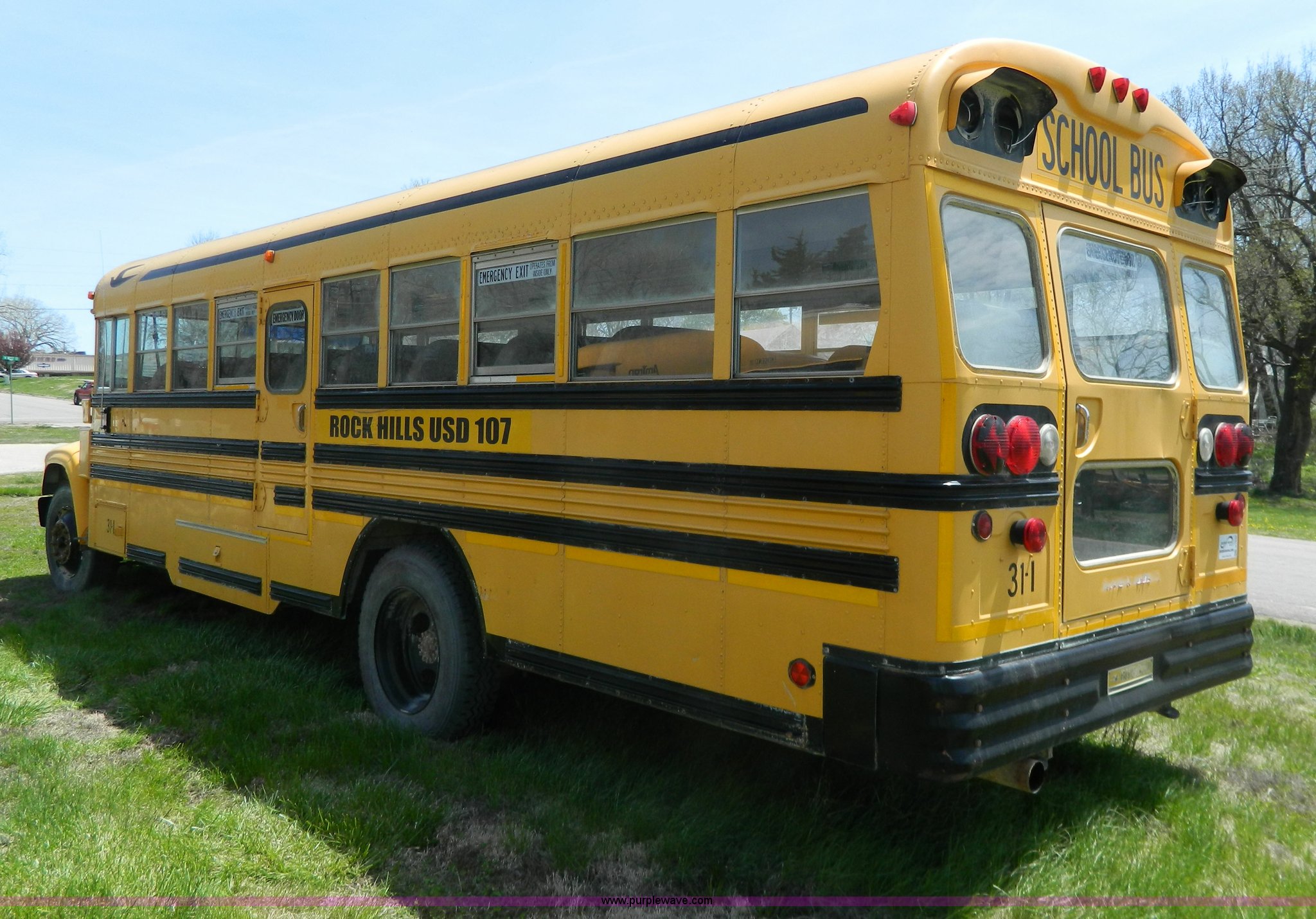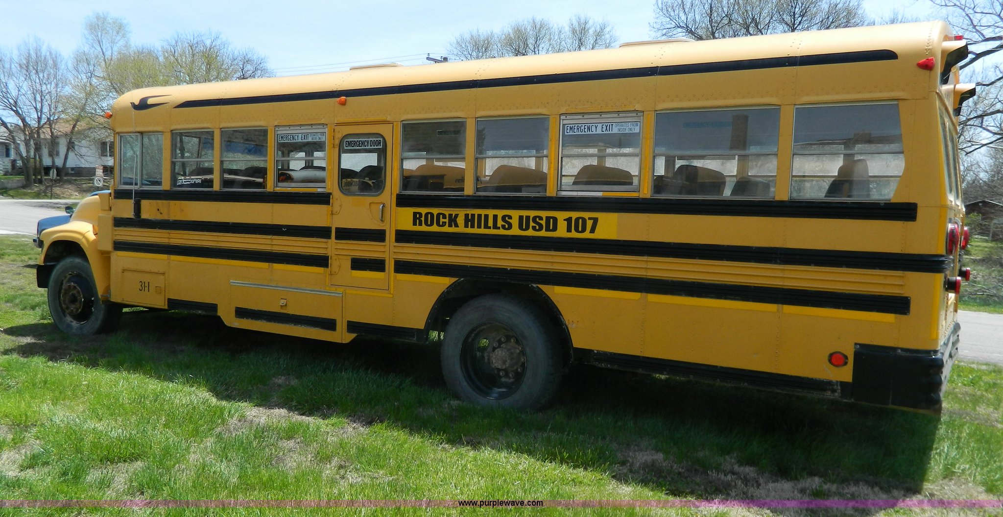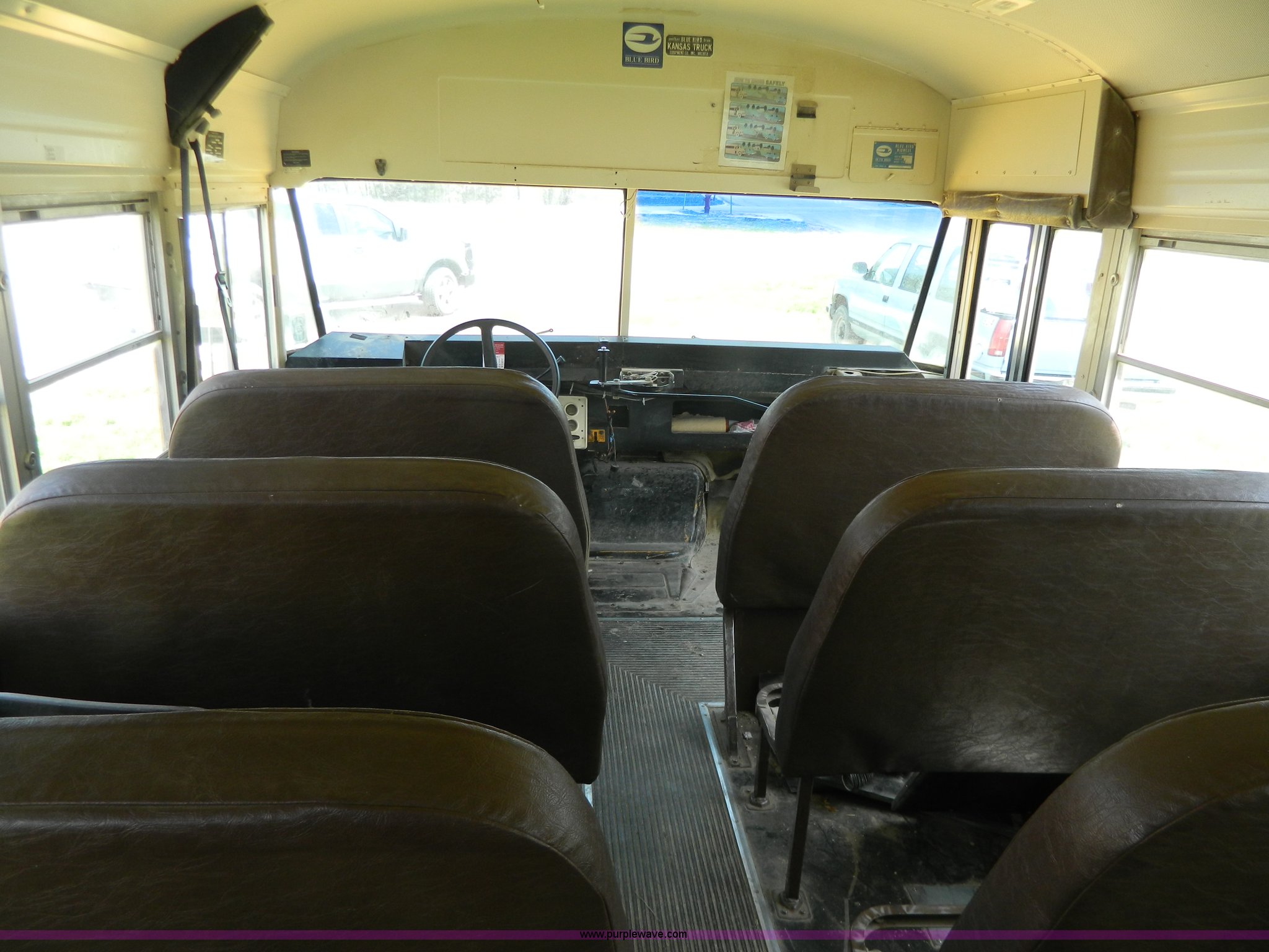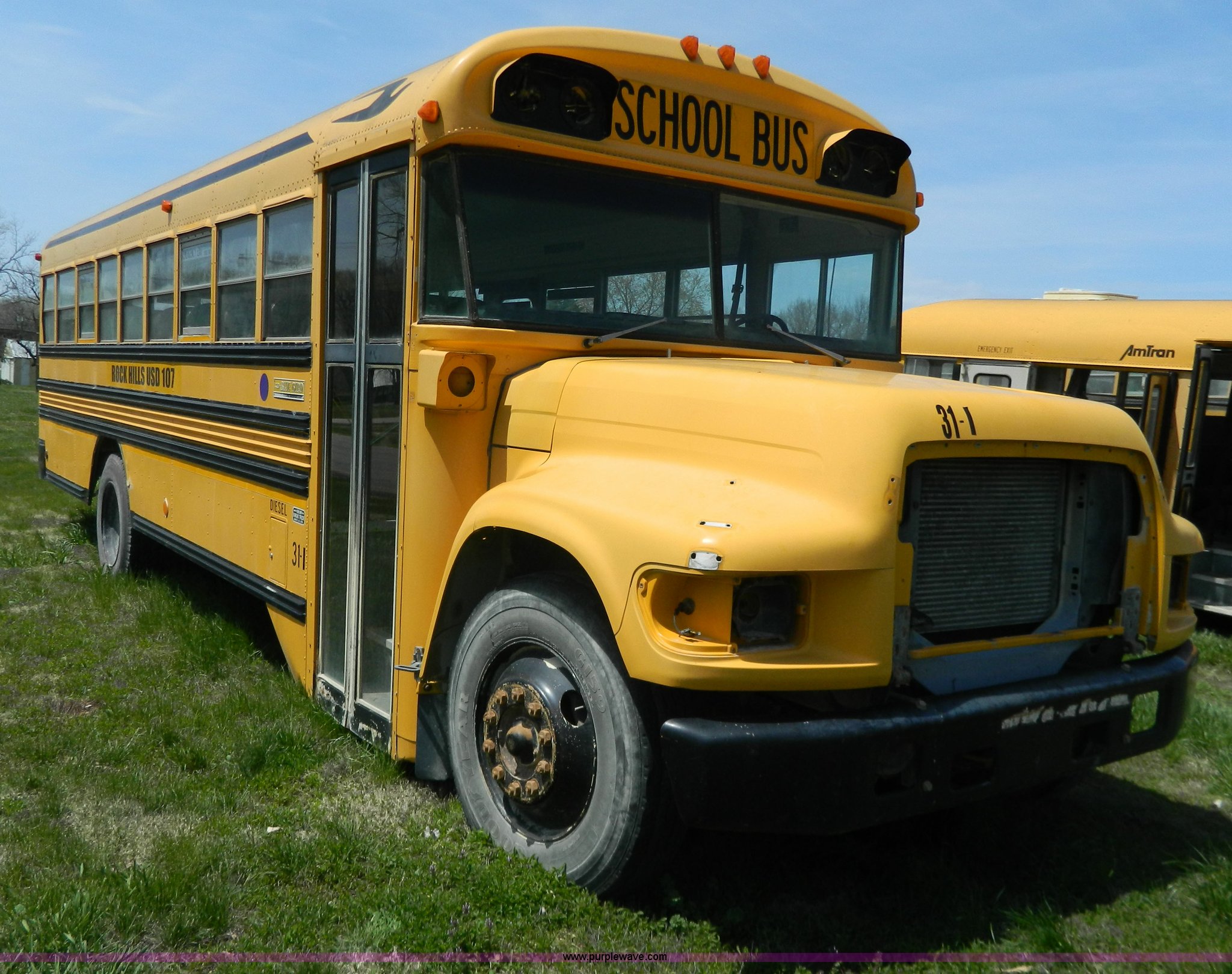 Purple Wave is selling a used Bus in Kansas. This item is a 1996 Ford Blue Bird school bus with the following: 187,421 miles on odometer, 50 passenger, 5.9L L6 diesel engine, Hole in engine block, Automatic transmission, 10R22.5 tires, GVWR 17,500 lbs, Parts have been removed, Frame has been cut, Rear tires missing, Unit will need to be towed