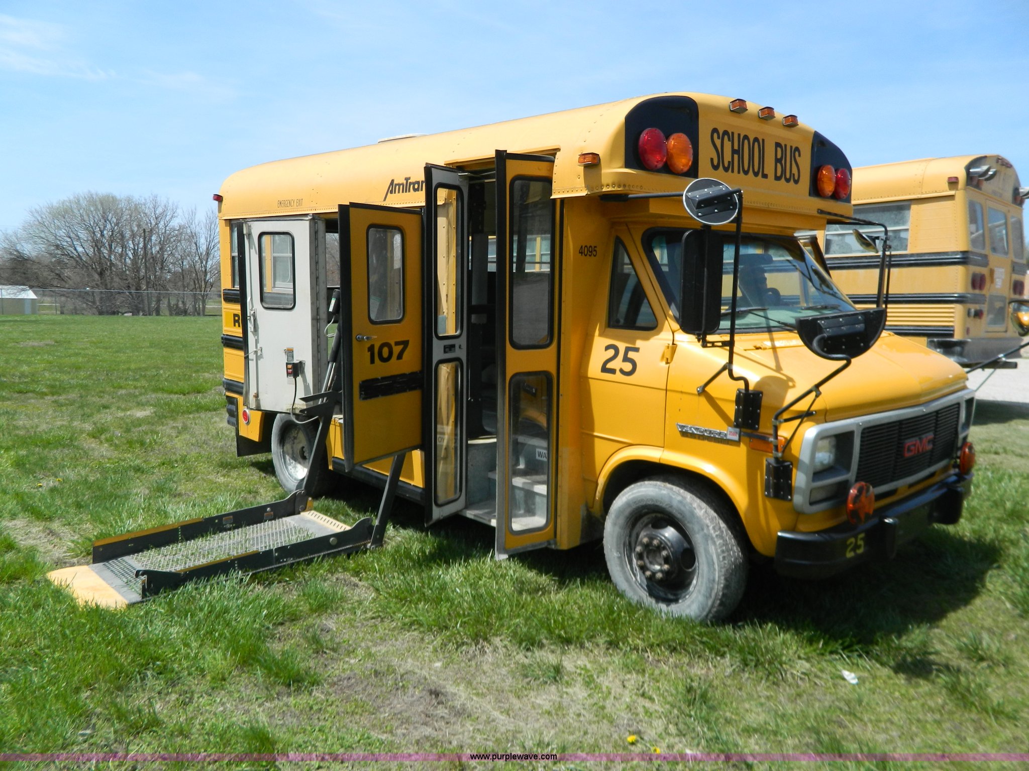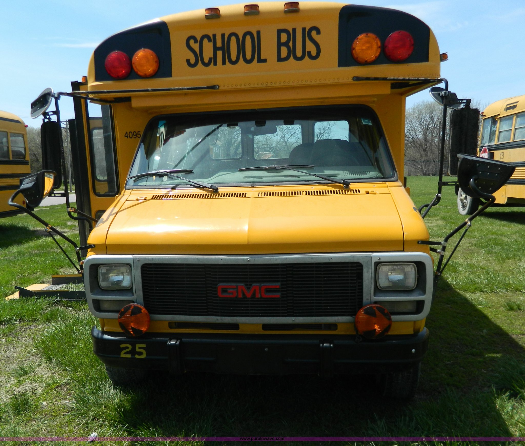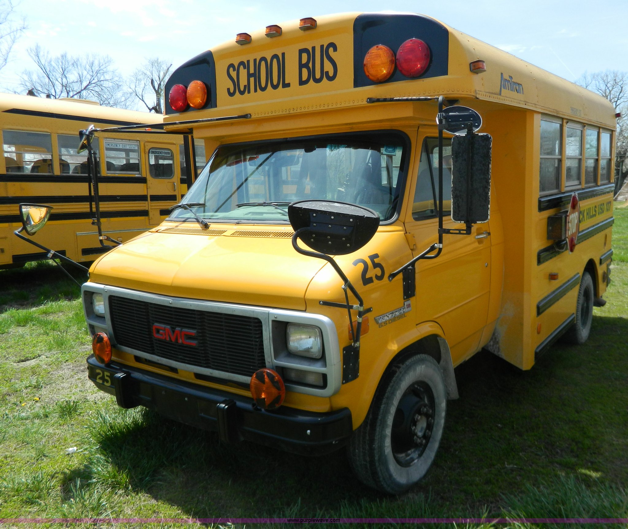 Purple Wave is selling a used Bus in Kansas. This item is a 1994 GMC 3500 school bus with the following: 125,806 miles on odometer, 10 passenger, 6.5L V8 diesel engine, Automatic transmission, Heat, Wheel chair lift, LT225/75R16 tires, Interior/exterior cosmetic damage