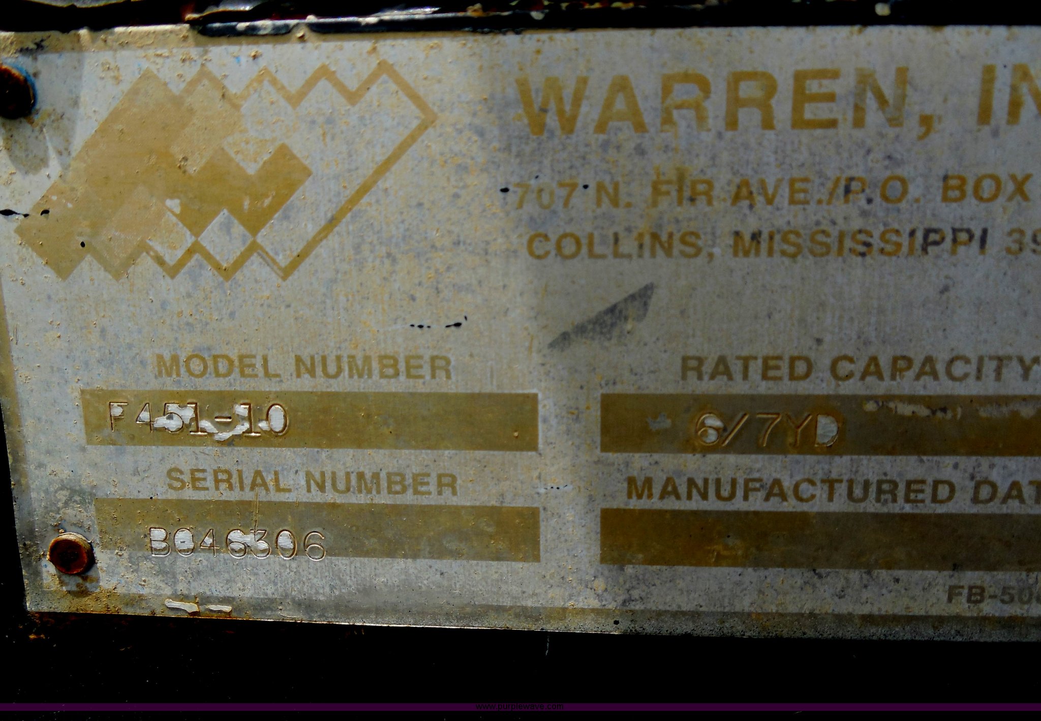 Purple Wave is selling a used Construction Dump Truck in Kansas. This item is a 2000 Sterling L7500 dump truck with the following: 77,835 miles on odometer, 506 hours on meter, Caterpillar 3126 7.2L L6 diesel engine, Warren F451-10 dump bed, 10'L x 8'W, 6 cu. yd. capacity, Warren T10 hoist, Serial HC66027, Manual end gate, Serial B046306, 60 gallon fuel tank, PTO, GVWR 35,000 lbs, FAWR 12,000 lbs, RAWR 23,000 lbs, Driver's seat missing, Unit is inoperable, Parts only