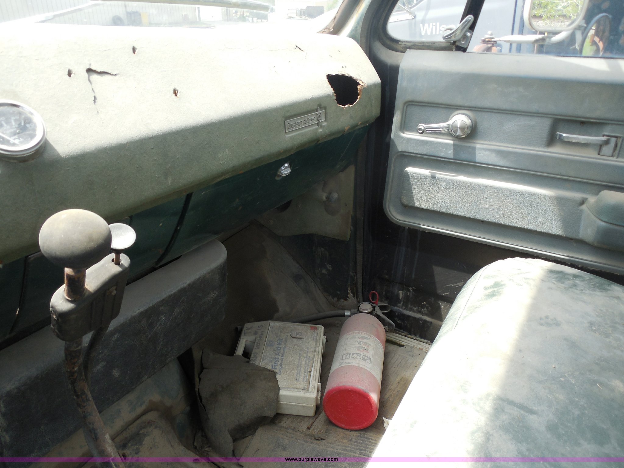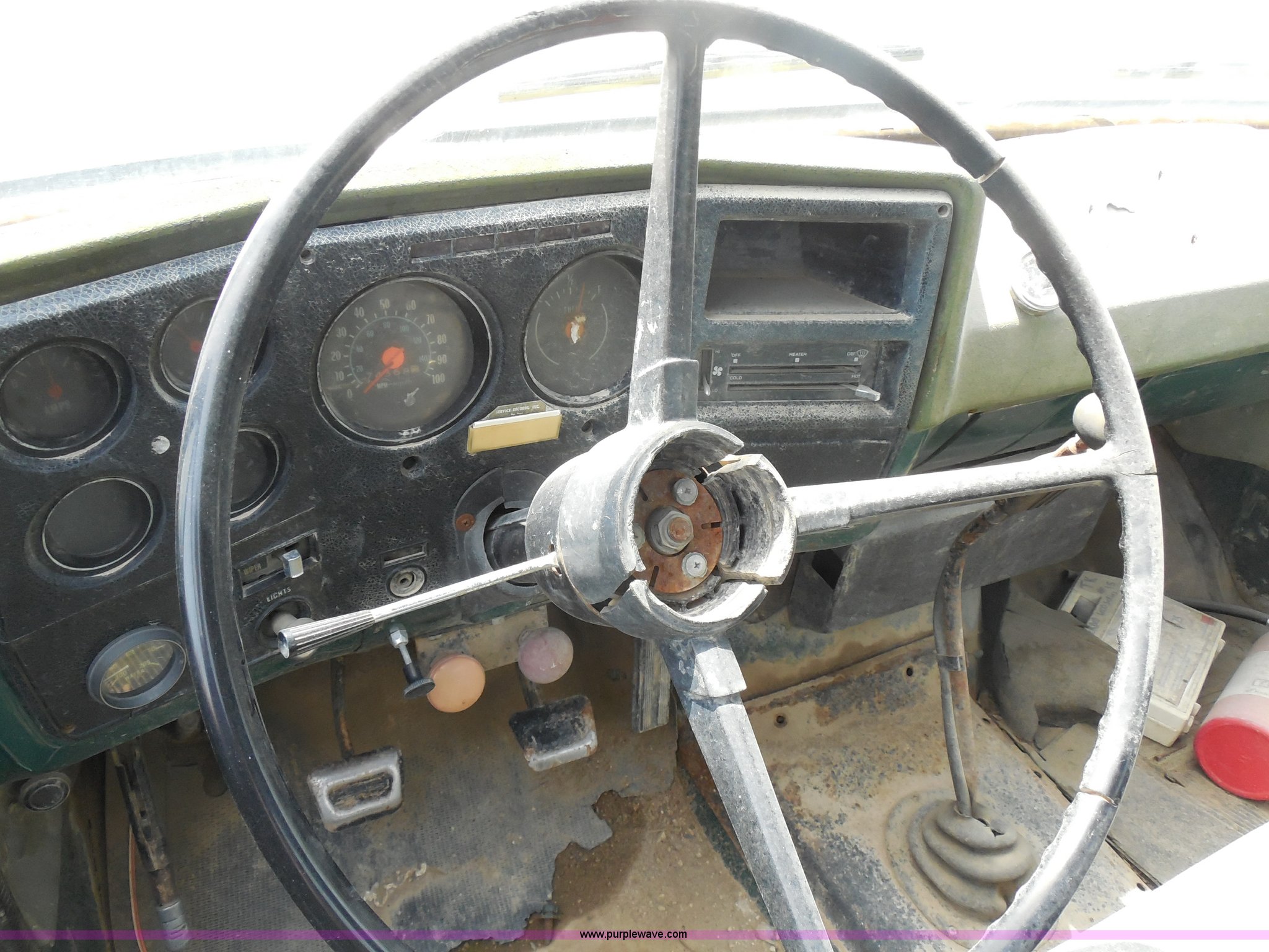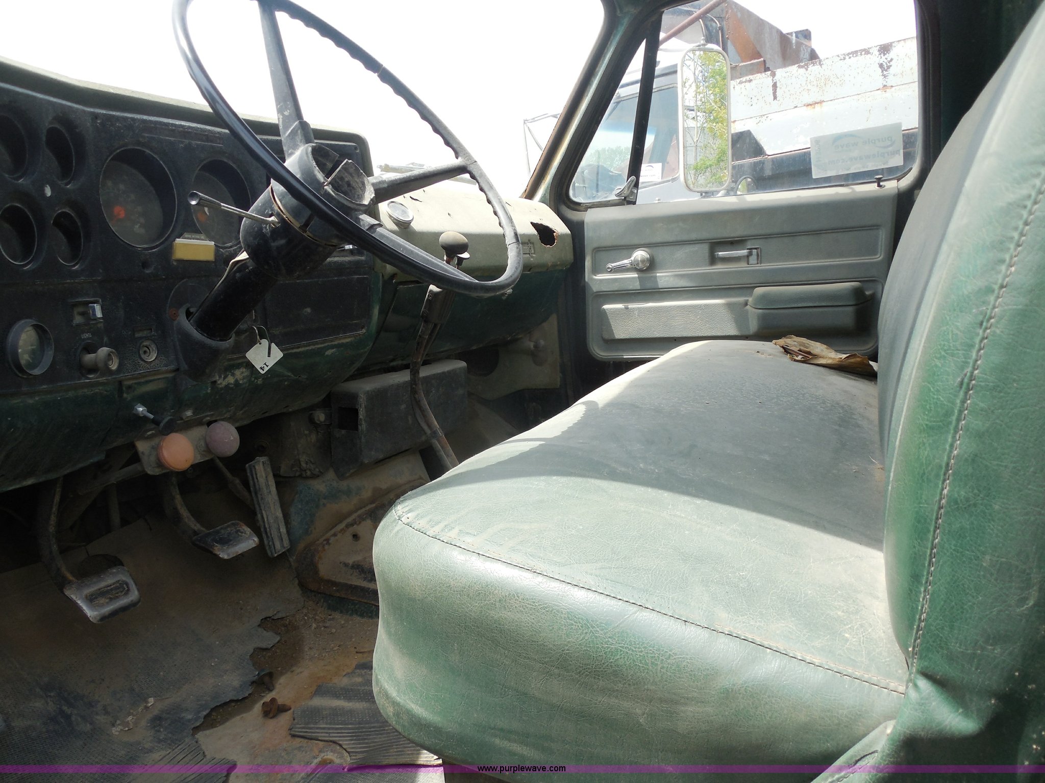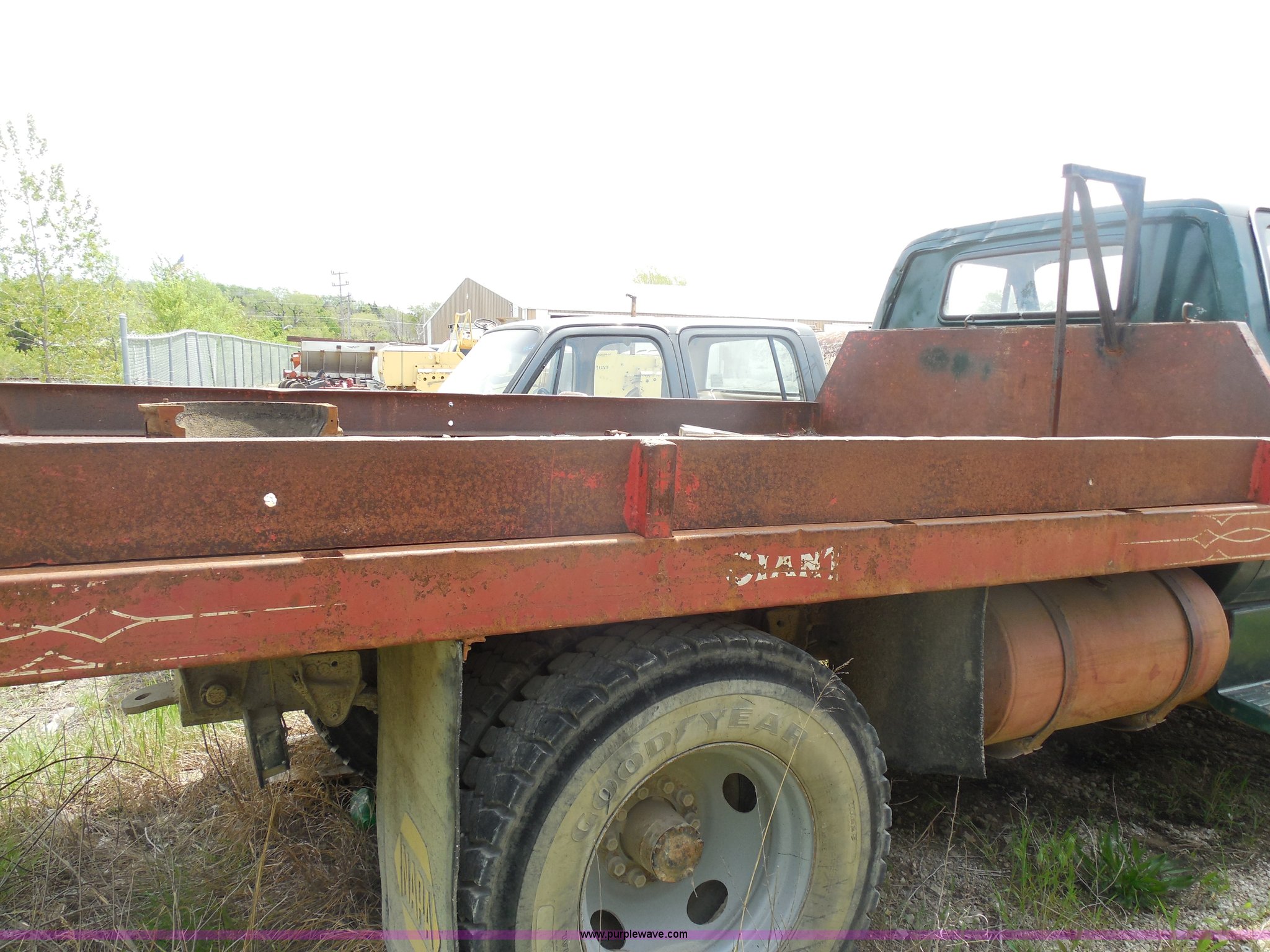 Purple Wave is selling a used Flat Bed Truck in Kansas. This item is a 1975 Chevrolet C60 flatbed truck with the following: 74,368 miles on odometer, V8 gas engine, Four speed transmission, Two speed rear end, AC and heat, Spring suspension seat, 68 gallon fuel tank, PTO, Spring suspension, 8.25R20 front tires, 11R22.5 rear tires, Flatbed, GVWR 19,200 lbs, FAWR 5,000 lbs, RAWR 14,200 lbs, Interior damage