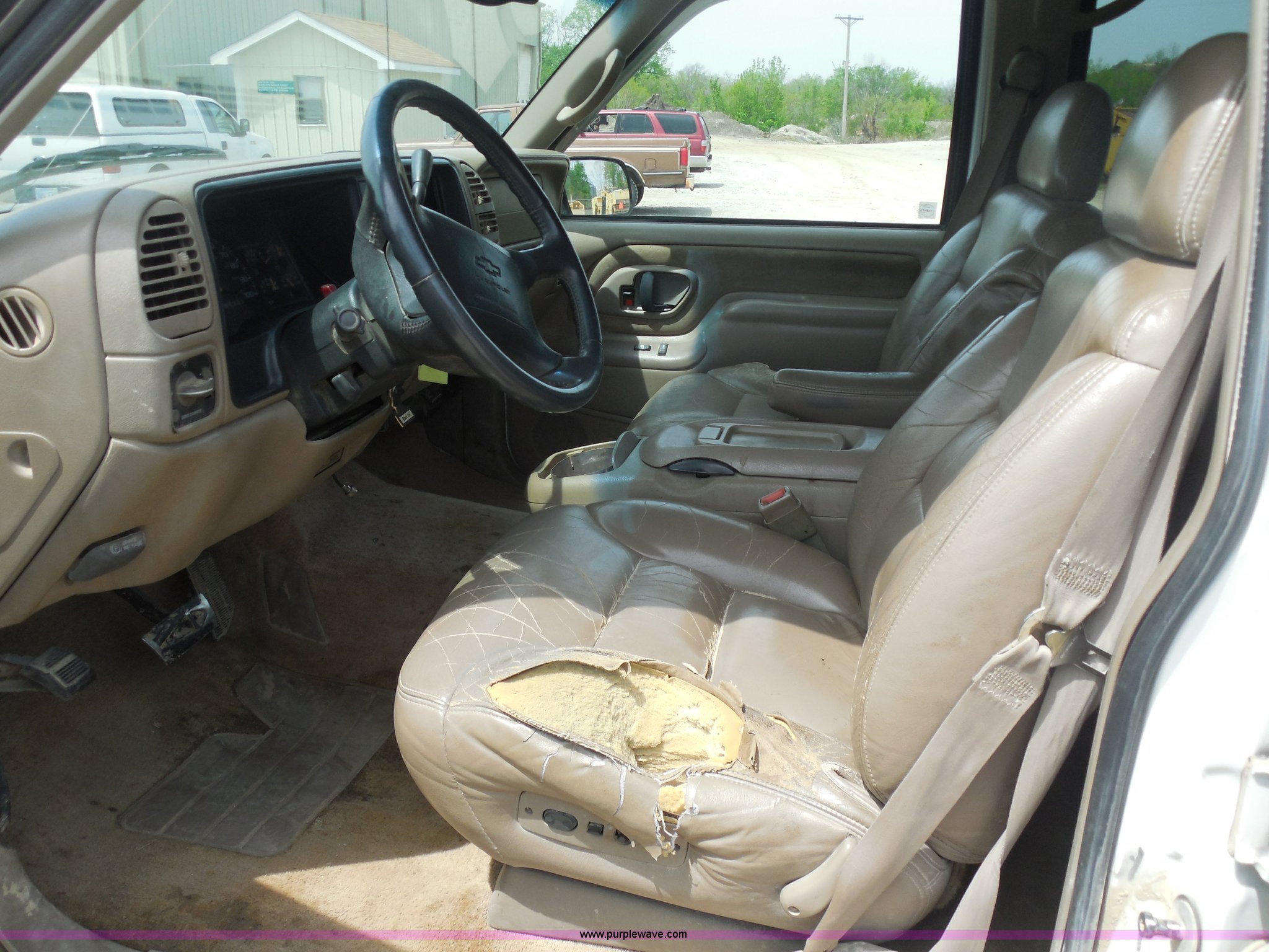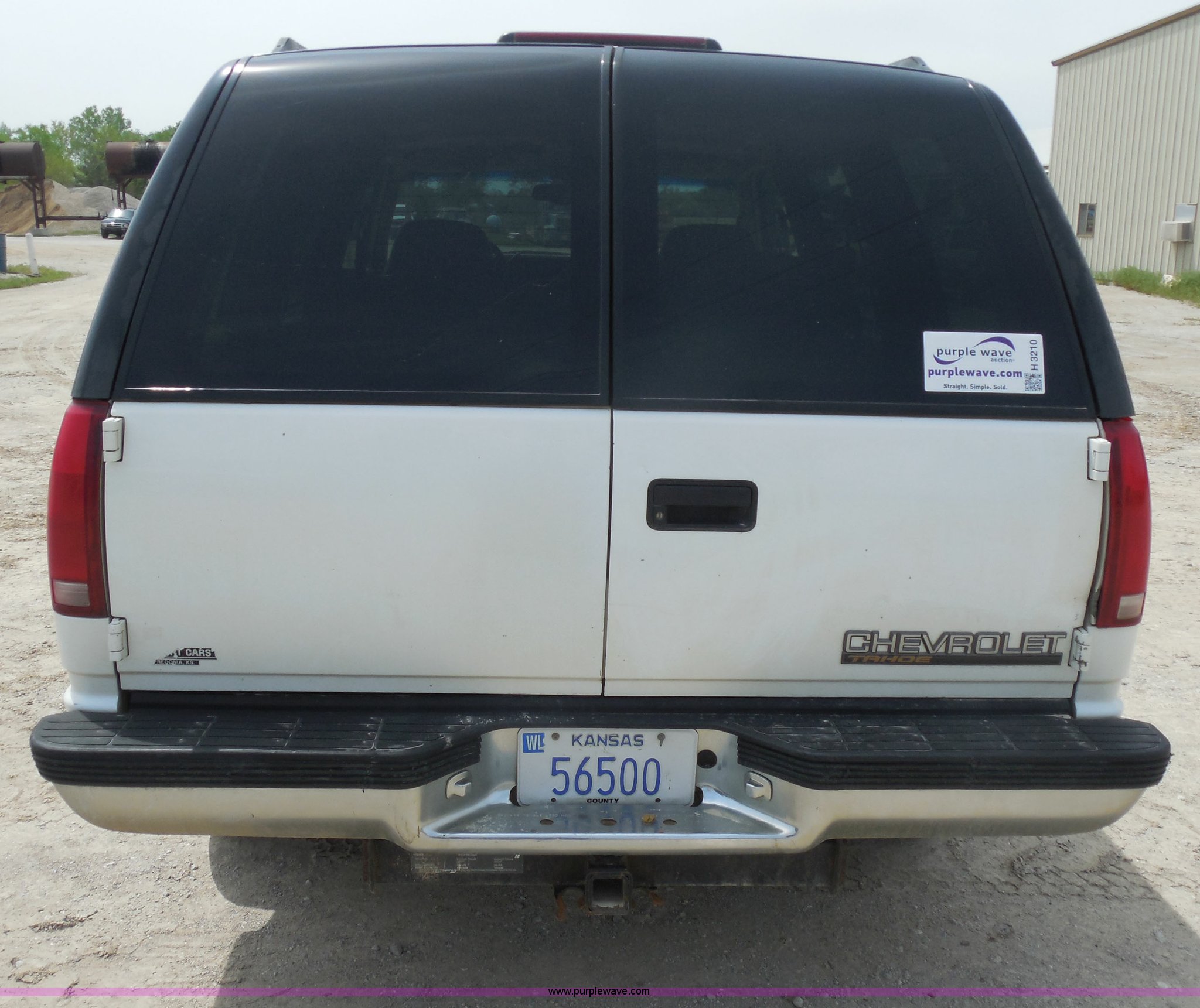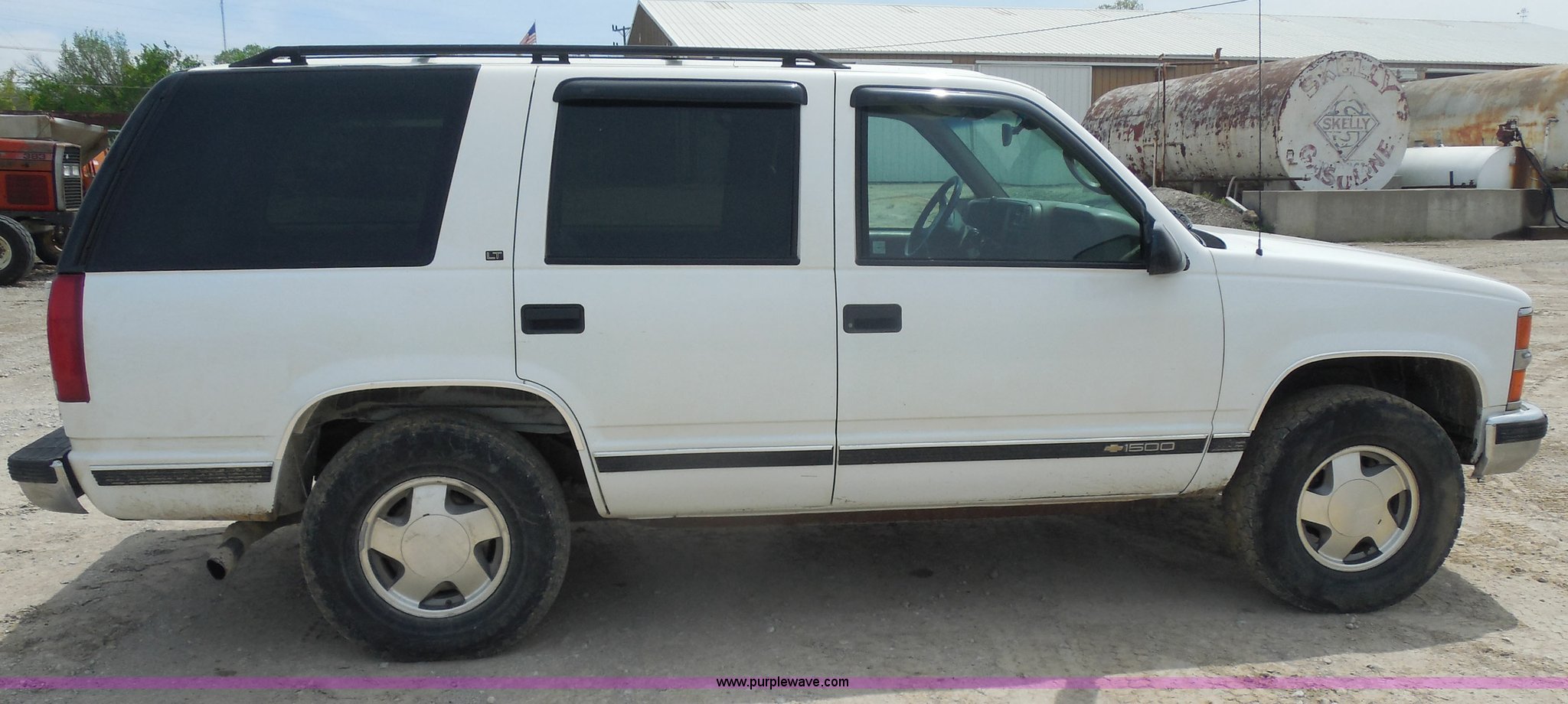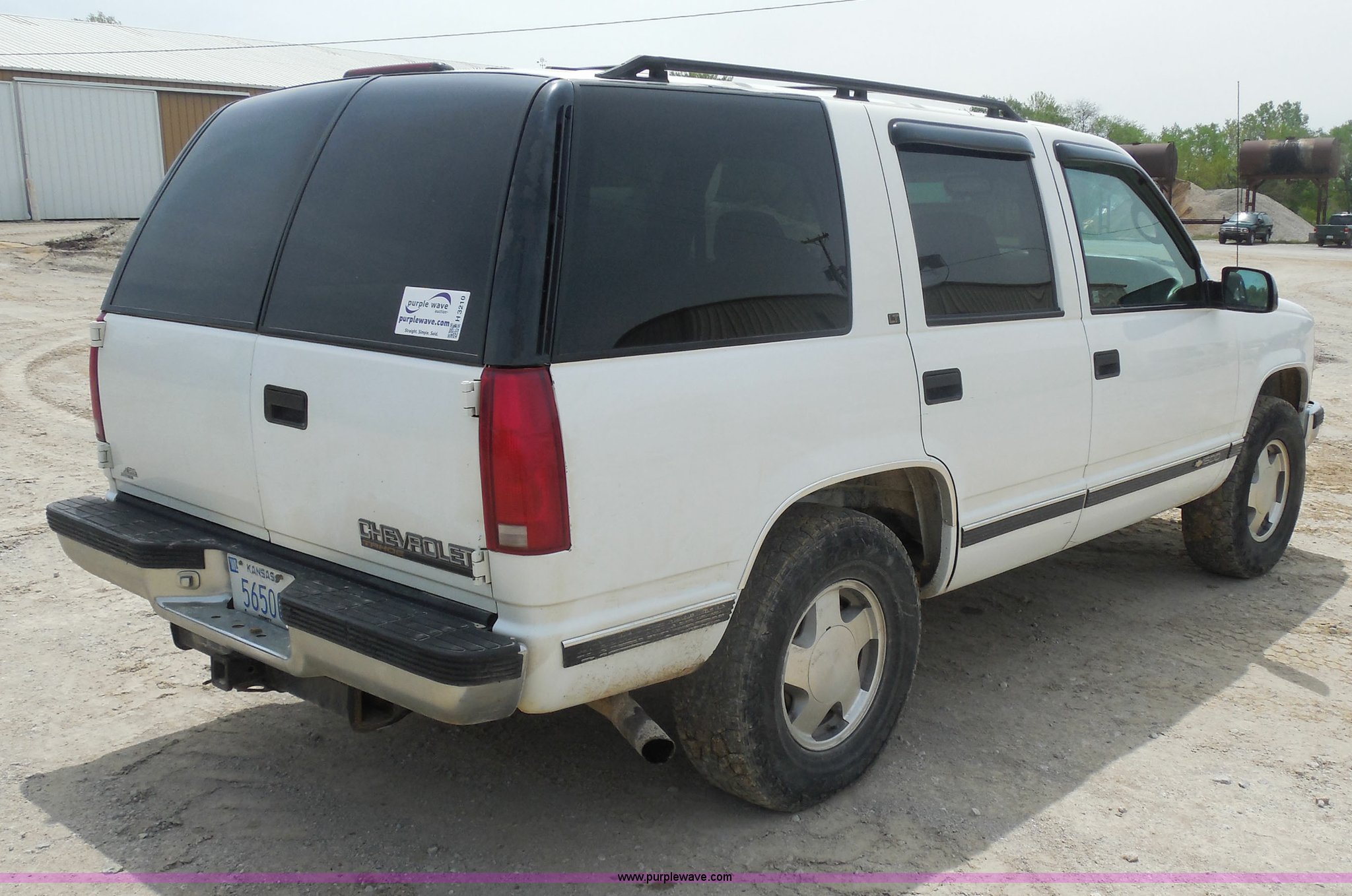 Purple Wave is selling a used Passenger Vehicle in Kansas. This item is a 1997 Chevrolet Tahoe SUV with the following: 226,397 miles on odometer, 5.7L V8 OHV 16V gas engine, Automatic transmission, Four wheel drive, AC and heat, Tilt, Cruise, AM/FM/CD/cassette, Power windows, locks, and mirrors, Leather interior, Front tow hooks, Receiver hitch, LT265/75R16 tires, Windshield cracked, Interior/exterior cosmetic damage, Driver's side locks inoperable, Driver's side trunk gate will not open, Service engine light is on, Starts rough