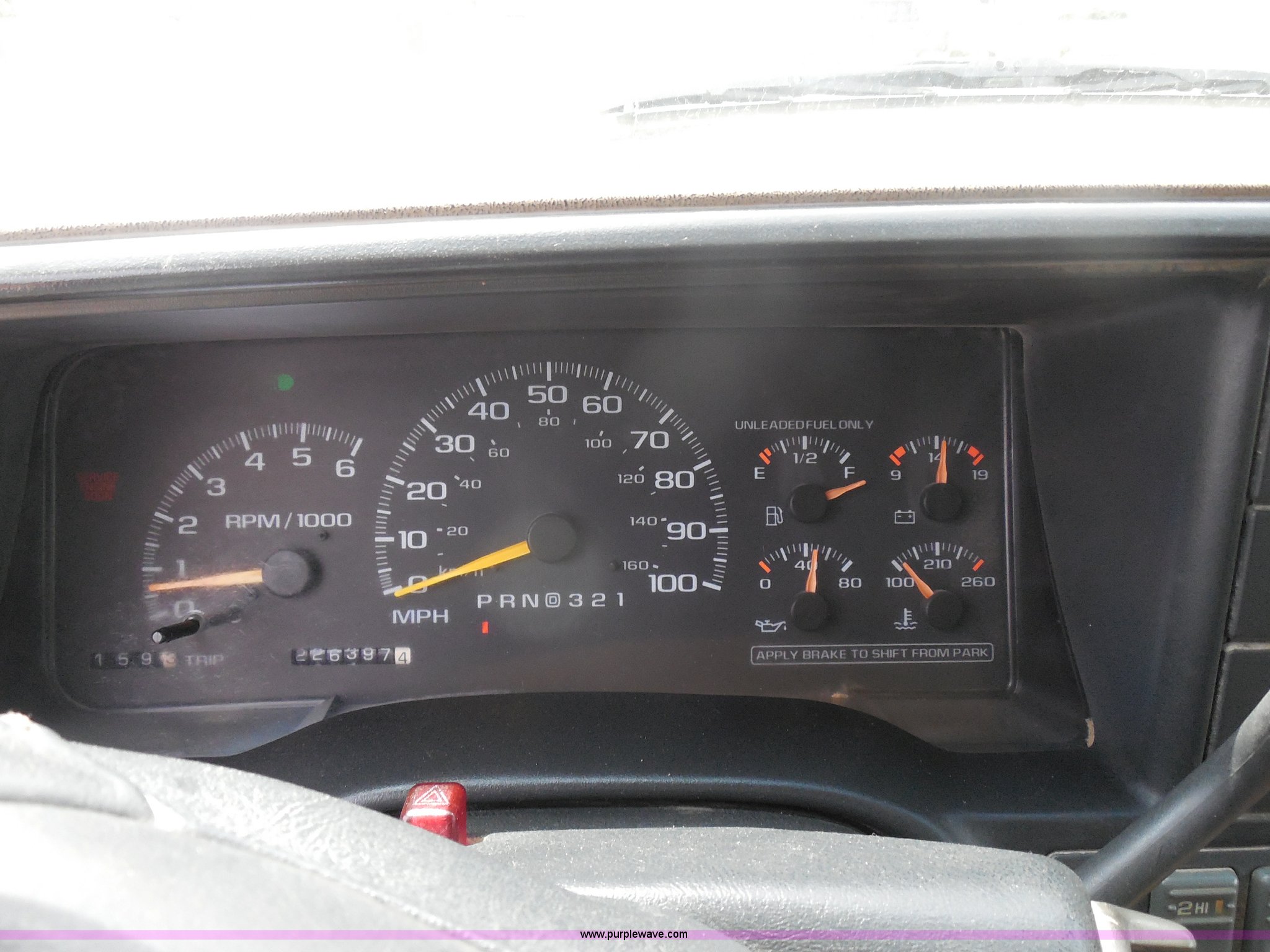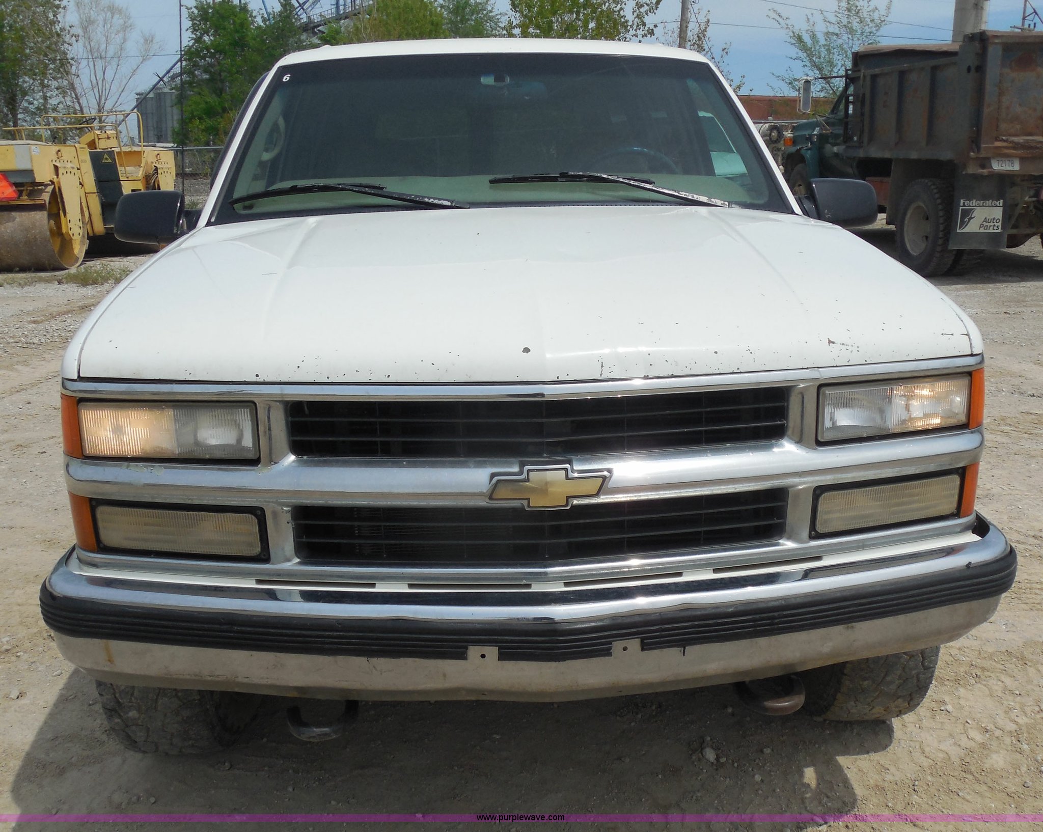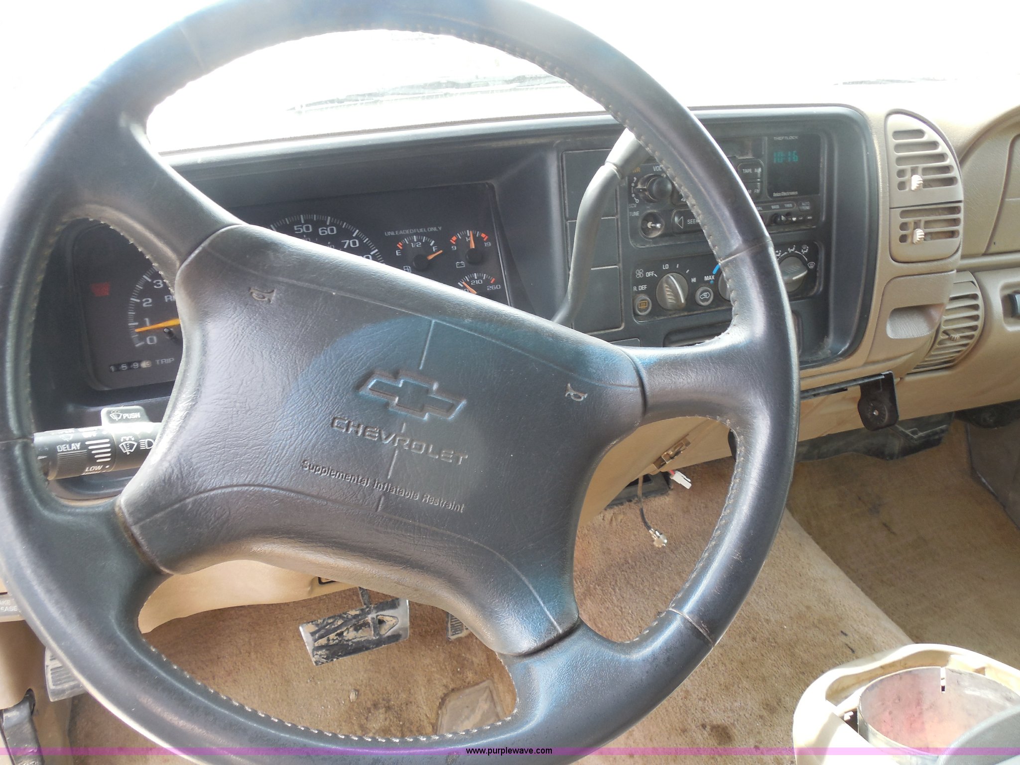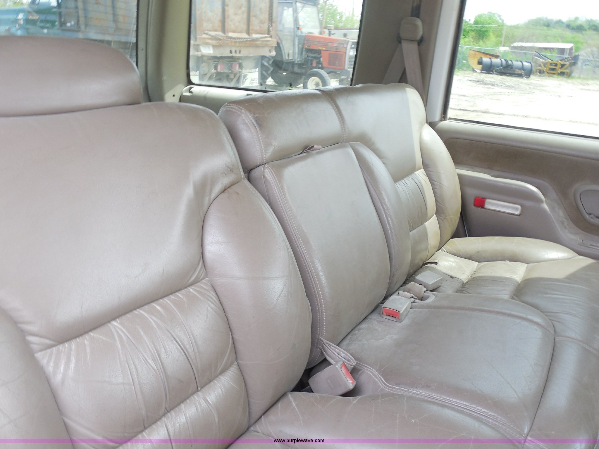 Purple Wave is selling a used Passenger Vehicle in Kansas. This item is a 1997 Chevrolet Tahoe SUV with the following: 226,397 miles on odometer, 5.7L V8 OHV 16V gas engine, Automatic transmission, Four wheel drive, AC and heat, Tilt, Cruise, AM/FM/CD/cassette, Power windows, locks, and mirrors, Leather interior, Front tow hooks, Receiver hitch, LT265/75R16 tires, Windshield cracked, Interior/exterior cosmetic damage, Driver's side locks inoperable, Driver's side trunk gate will not open, Service engine light is on, Starts rough