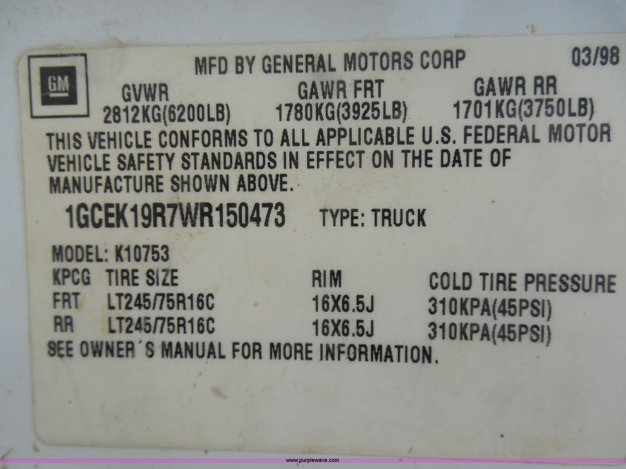 1998 Chevrolet Silverado 1500 Extended Cab pickup truck. 225,909 miles on odometer, 5.7L V8 OHV 16V gas engine, Automatic transmission, Four wheel drive, AC and heat, Tilt, Cruise, AM/FM/cassette, Power windows and locks, Cloth interior, Receiver hitch, LT245/75R16 tires, Interior/exterior cosmetic damage, Front bumper bent. 1GCEK19R7WR150473. Shipping quotes available. Wilson County. 10990 Harper Road. Fredonia, KS 66736