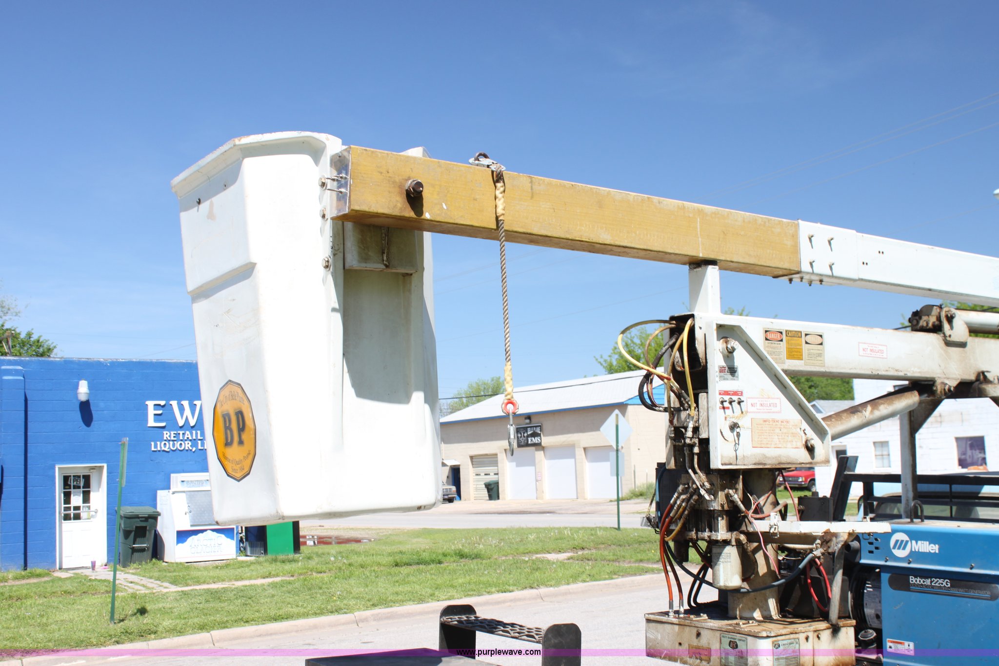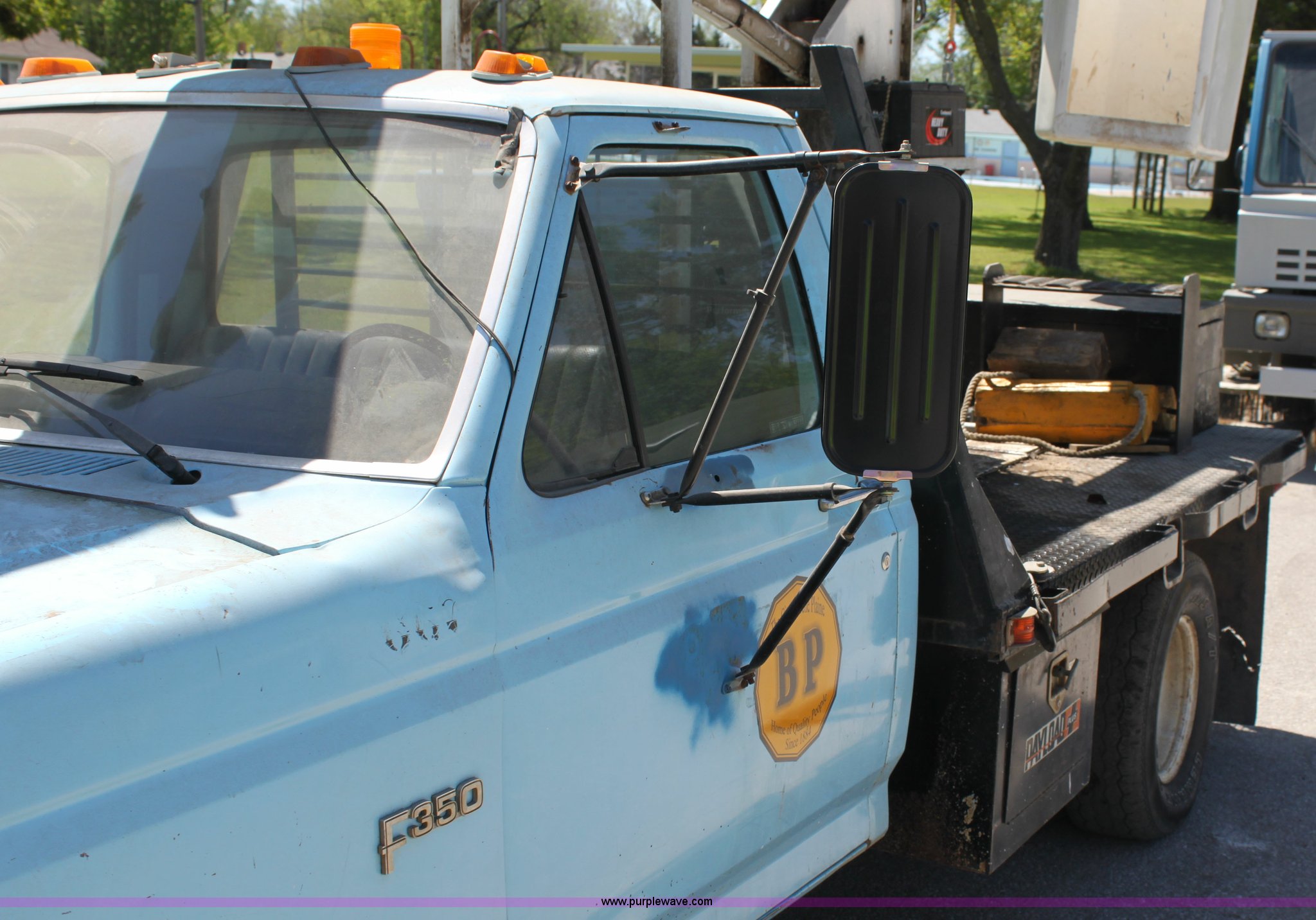 Purple Wave is selling a used Passenger Vehicle in Kansas. This item is a 1982 Ford F350 bucket truck with the following: 2,411 miles on odometer, 6.6L V8 OHV 16V gas engine, Four speed manual transmission, Flatbed, Grill guard, Skyjacker 28' bucket boom, Electric over hydraulic, 235/85R16 tires, Miller Bobcat welder not included, Drivers side rear dual tires leak air