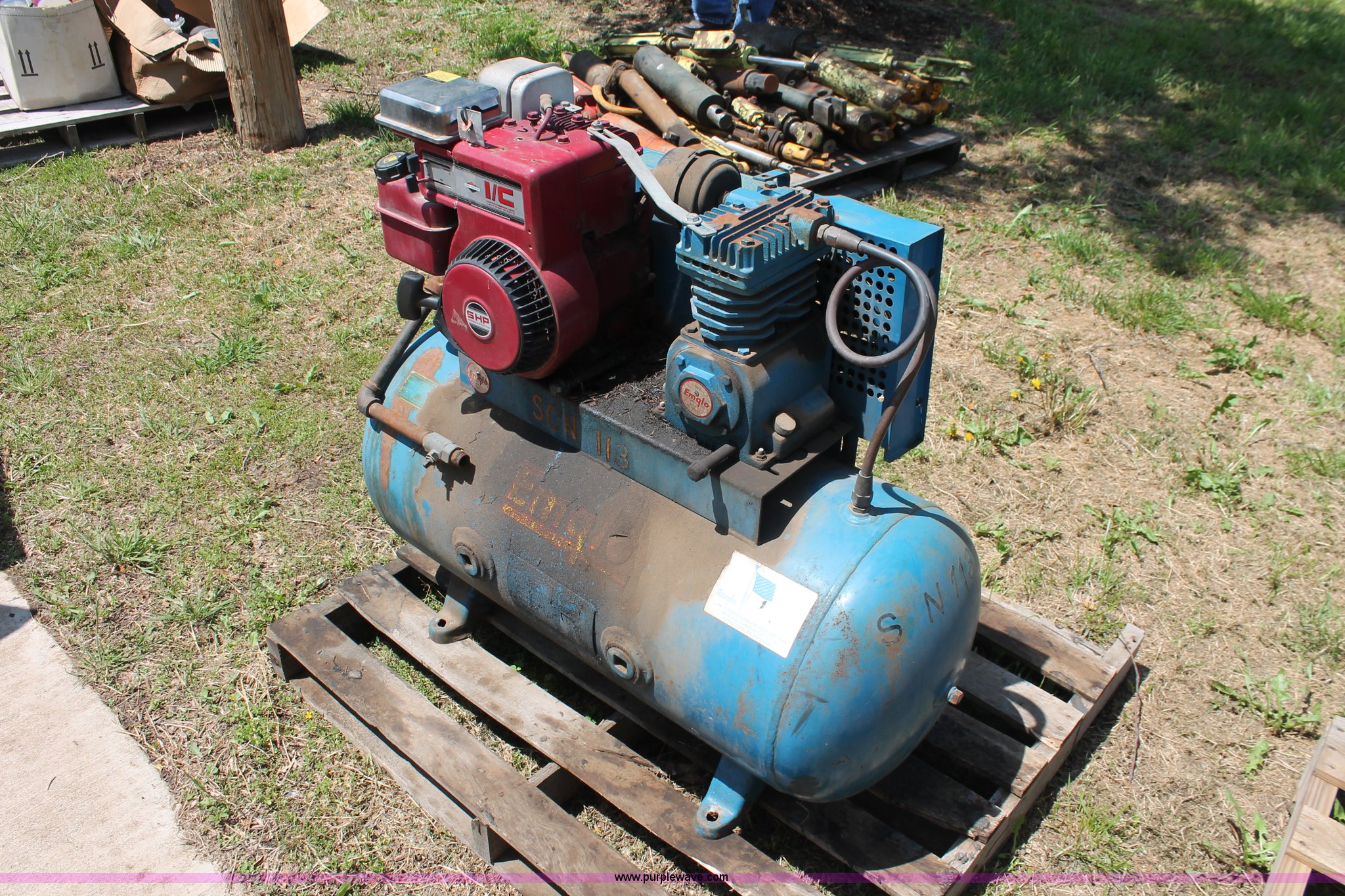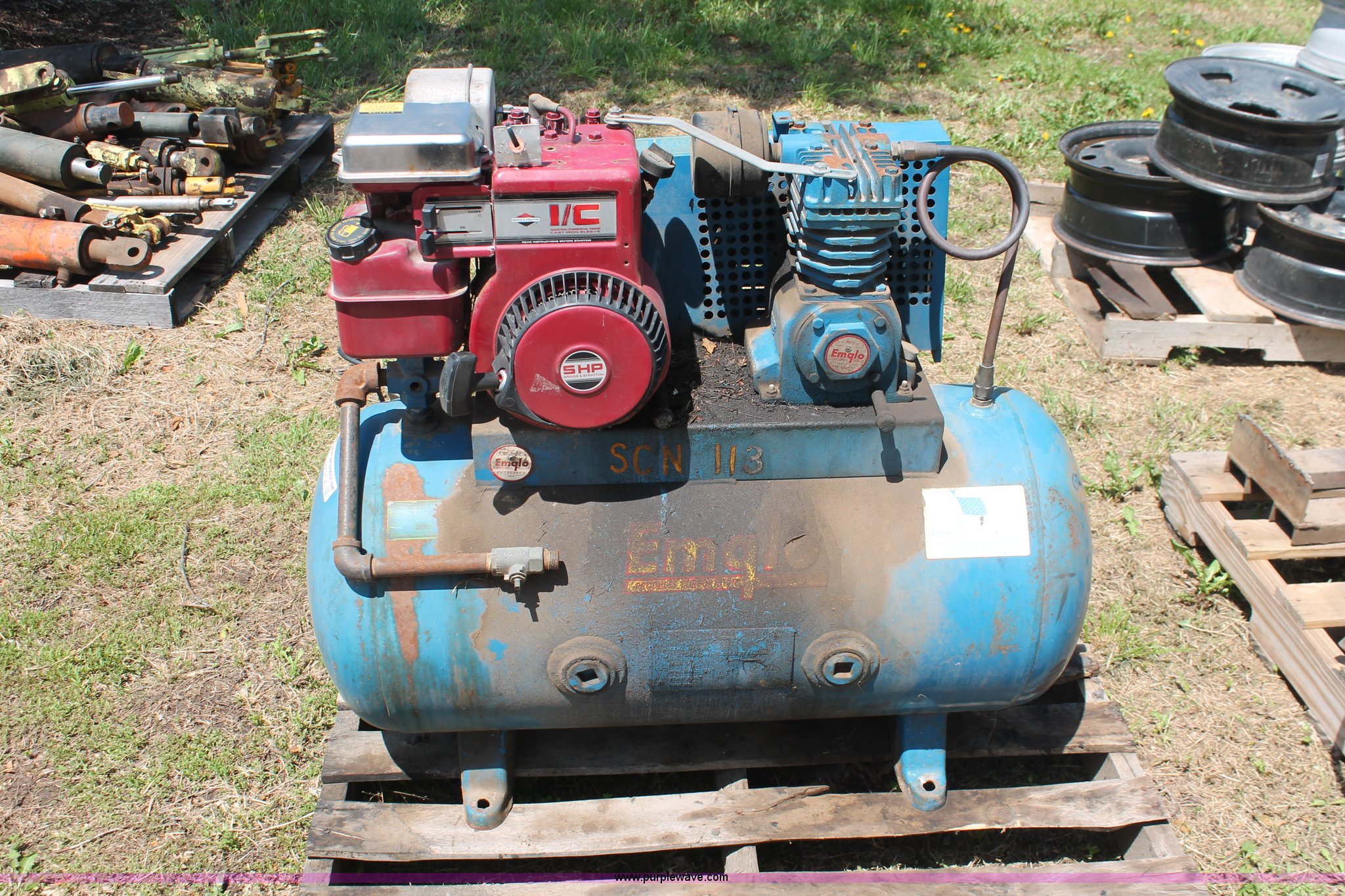 Purple Wave is selling a used Air Compressor in Kansas. This item is a Emglo gas powered air compressor with the following: Model K5CGA-30, 20 gallon tank, Engine does not work properly