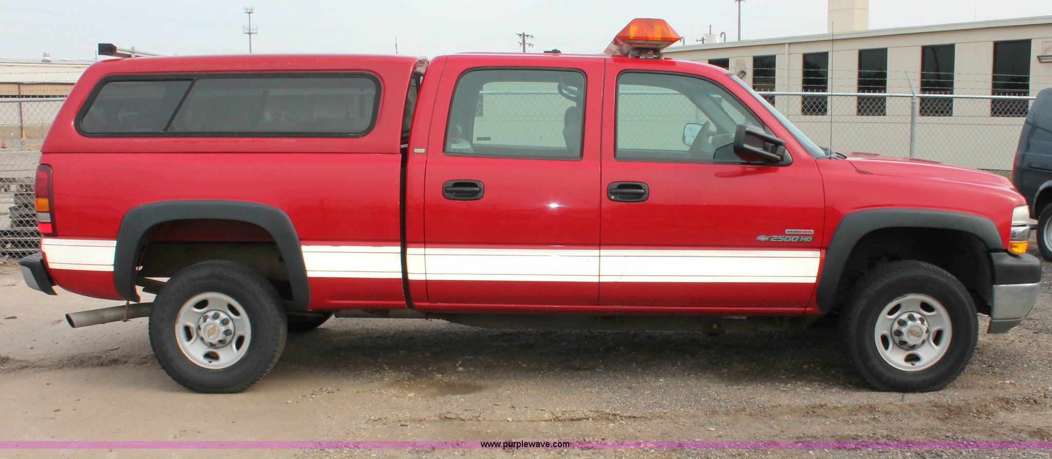 Purple Wave is selling a used 3/4 or 1 Ton Pickup or Van in Kansas. This item is a 2001 Chevrolet Silverado 2500HD Crew Cab pickup truck with the following: 124,994 miles on odometer, 6.6L V8 OHV 32V turbo diesel engine, Automatic transmission, Four wheel drive, AC and heat, Tilt, AM/FM, Power windows and locks, Vinyl interior, Aftermarket switch, Code 3 emergency light bar, Rear caution light bar, Continental fiberglass topper, Full length slide out tool tray, LT245/75R16 tires, Hail damage, Alternator inoperable, Battery dead, Emergency service gear wiring harness, Unit# 2-1477