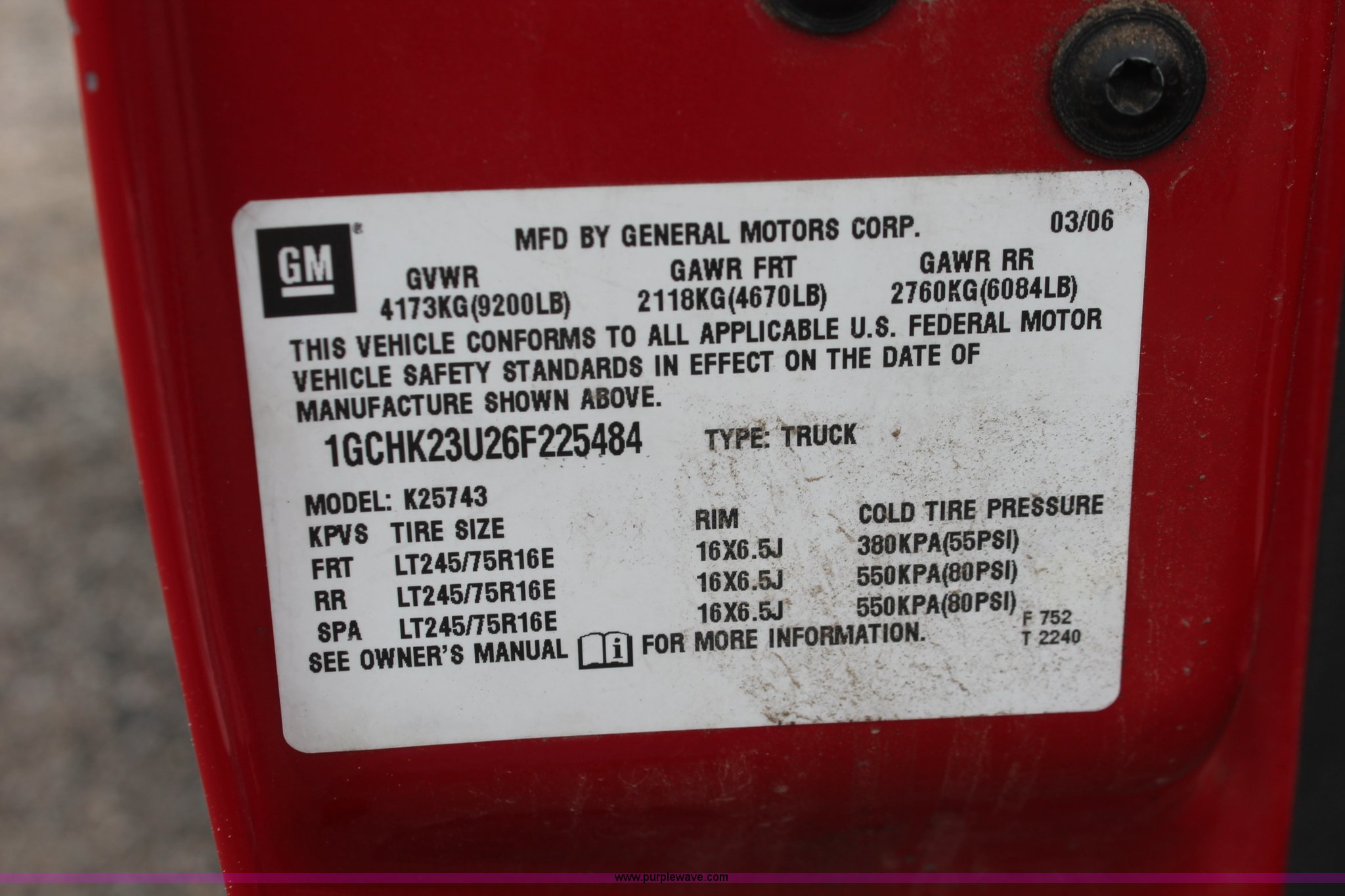 2006 Chevrolet Silverado 2500HD Crew Cab pickup truck. 99,332 miles on odometer, 6.0L V8 SFI gas engine, Automatic transmission, Four wheel drive, AC and heat, Tilt, Cruise, AM/FM, Power windows, locks, and mirrors, Vinyl interior, Ranch fiberglass topper Full reach in side doors, Emergency service wiring harness, Receiver hitch, Trailer wiring, LT245/75R16 tires, Spare tire, Unit# 001177. 1GCHK23U26F225484. Shipping quotes available. Central Maintenance Facility. 1801 S McLean. Wichita, KS 67213