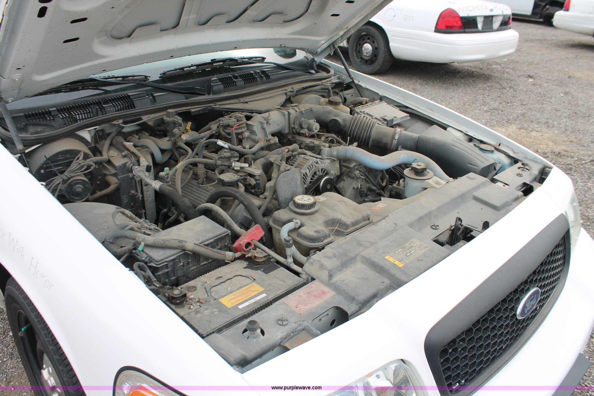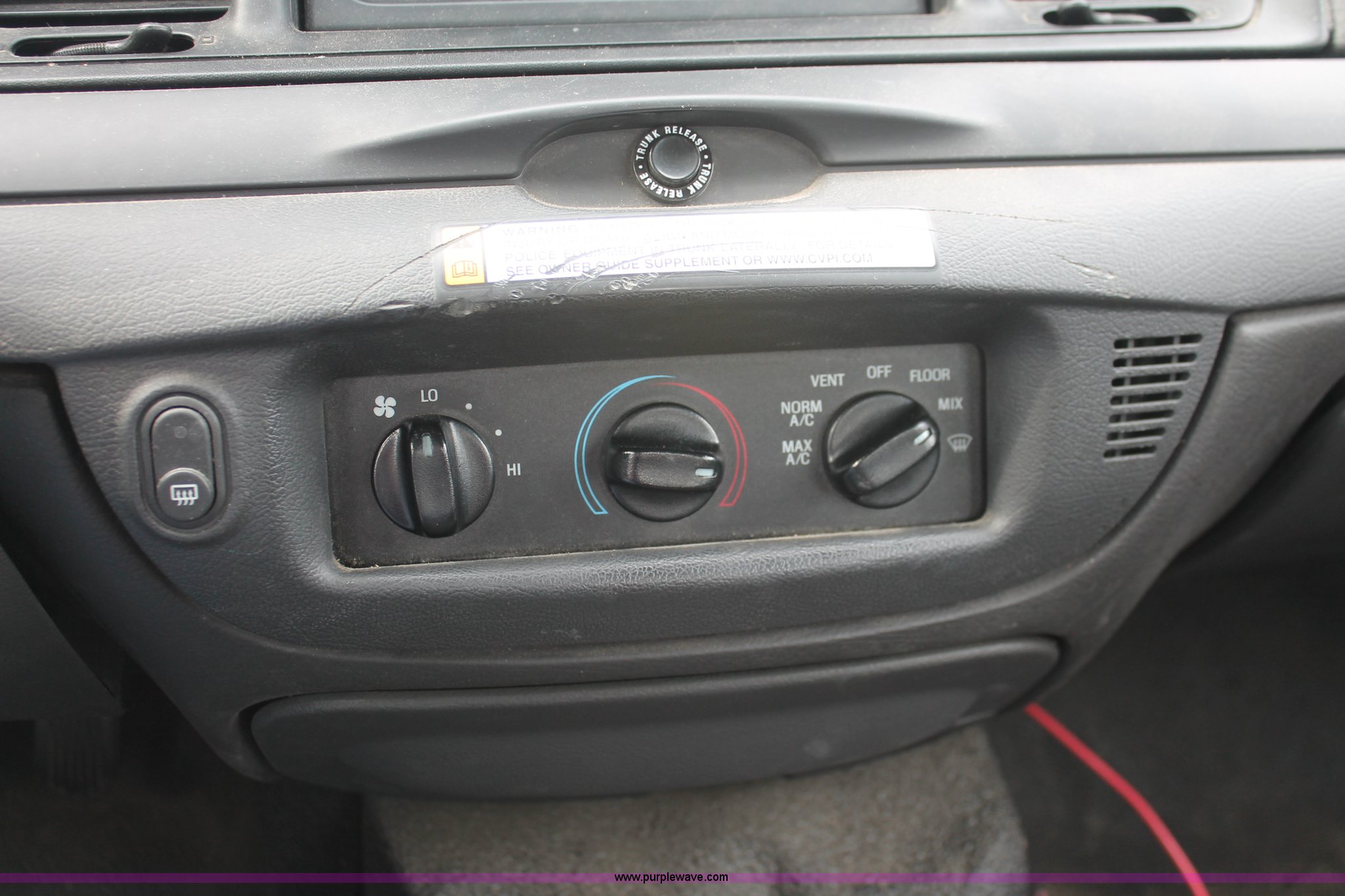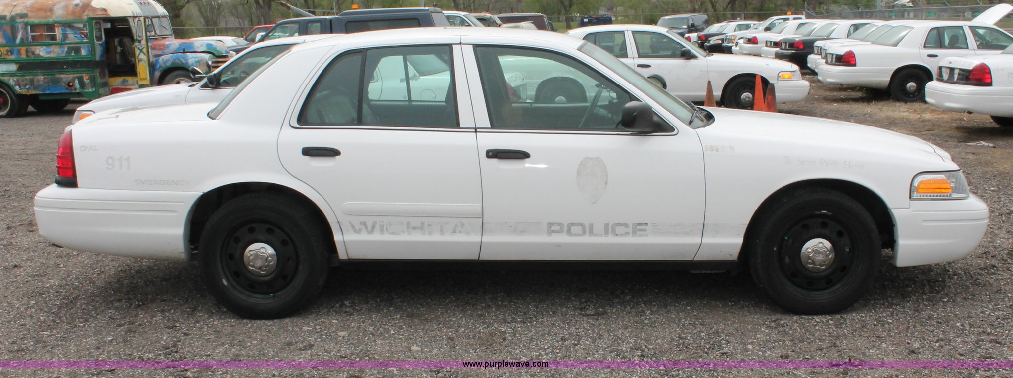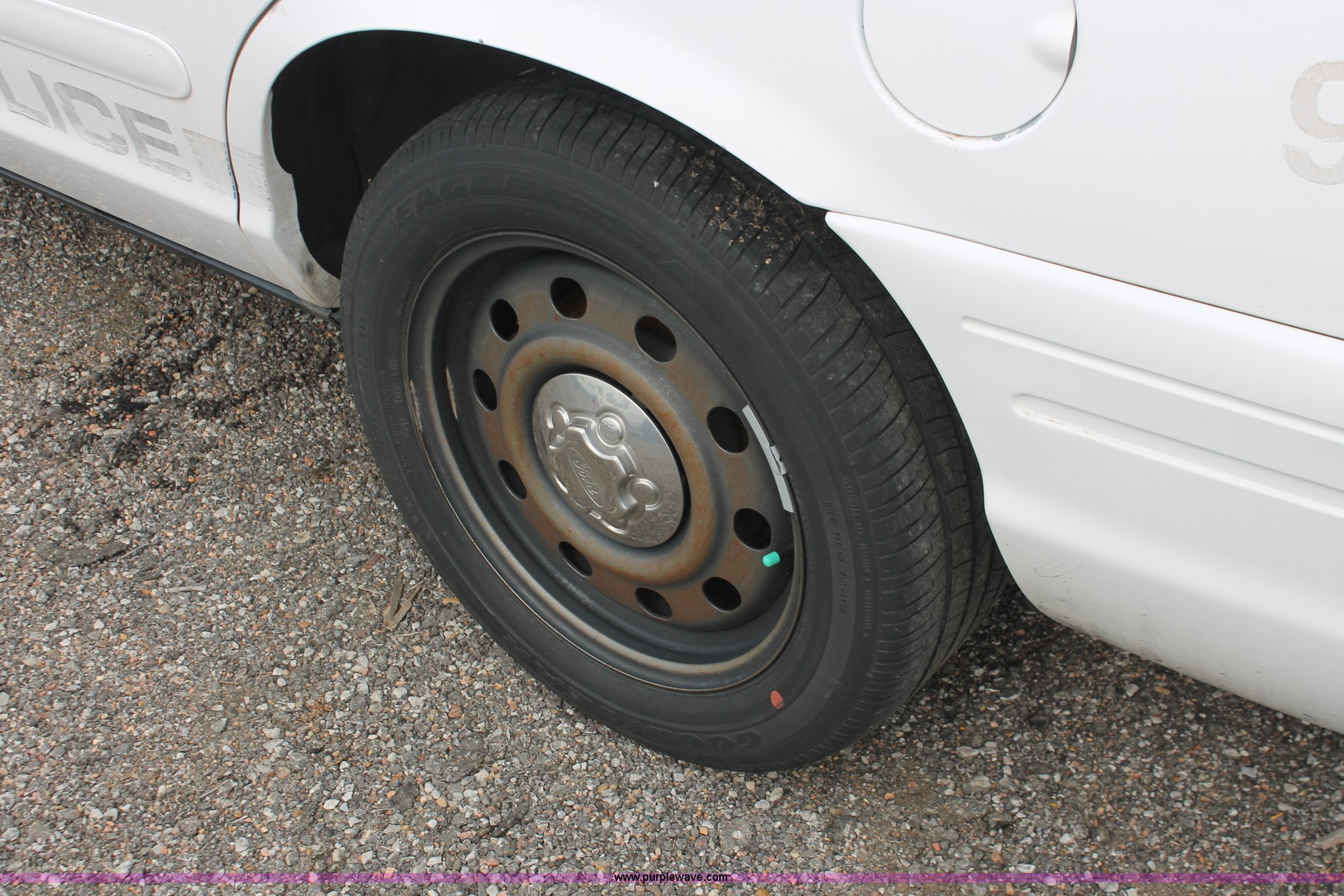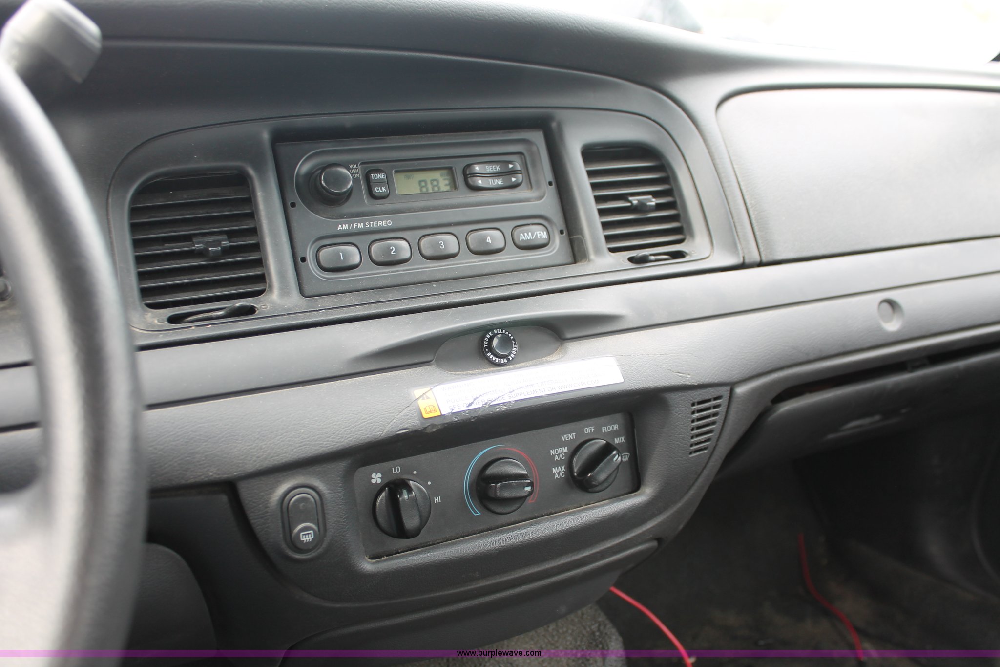 Purple Wave is selling a used Passenger Vehicle in Kansas. This item is a 2006 Ford Crown Victoria Police Interceptor with the following: 86,710 miles on odometer, 4.6L V8 SOHC 16V gas engine, Automatic transmission, AC and heat, Tilt, AM/FM, Power windows, locks, and seats, Cloth front interior, Vinyl rear interior, P235/55R17 tires, Battery dead, Hail damage, Holes in roof and trunk, Unit# 000898