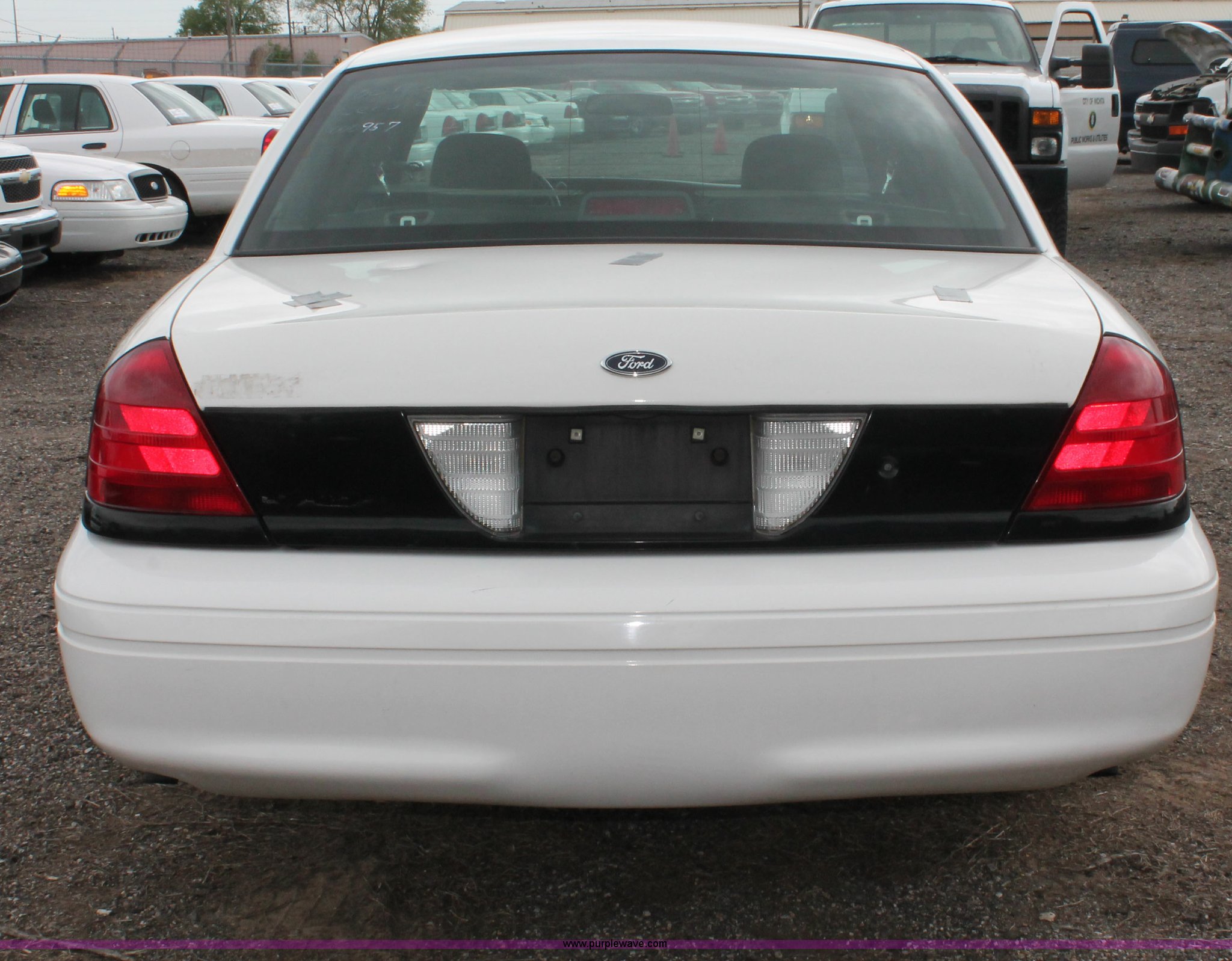 2006 Ford Crown Victoria Police Interceptor. 93,822 miles on odometer, 4.6L V8 SOHC 16V gas engine, Automatic transmission, AC and heat, Tilt, AM/FM, Power windows, locks, mirrors, and seats, Cloth front interior, Vinyl rear interior, P235/55R17 tires, Hail damage, Paint peeling, Passenger seat bolts broken, Holes in trunk, Unit# 000957. 2FAFP71W56X133869. Shipping quotes available. Central Maintenance Facility. 1801 S McLean. Wichita, KS 67213