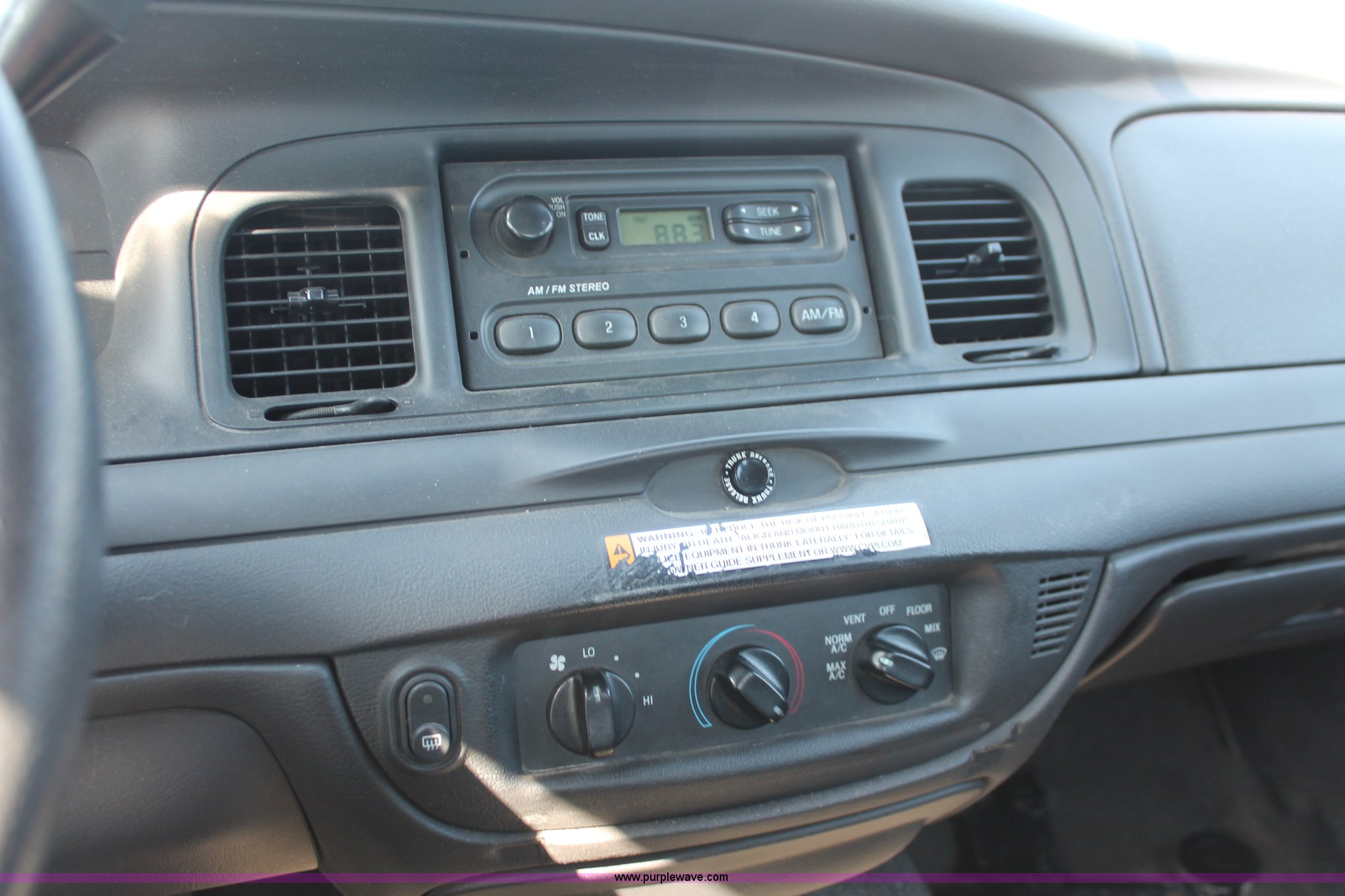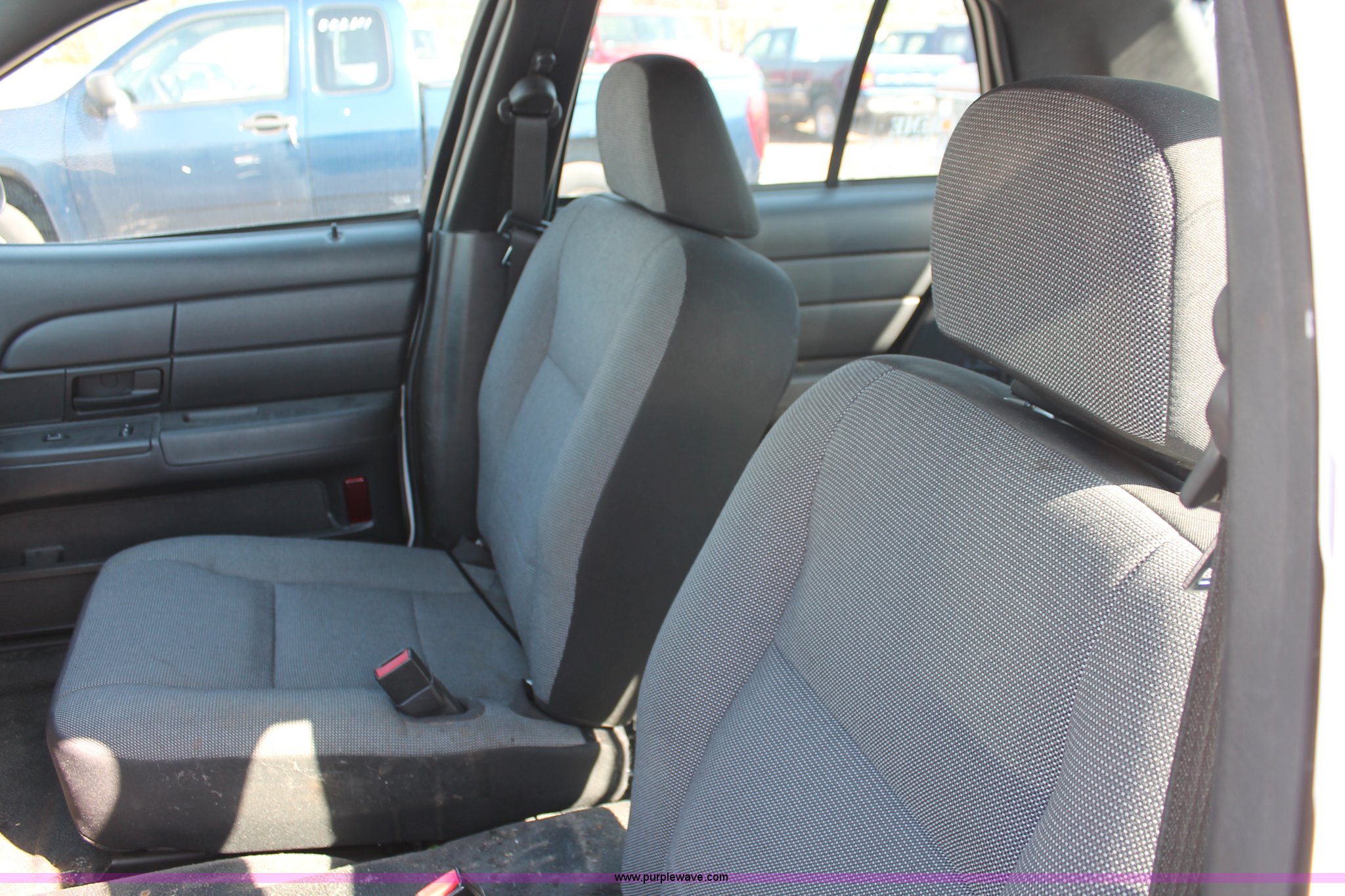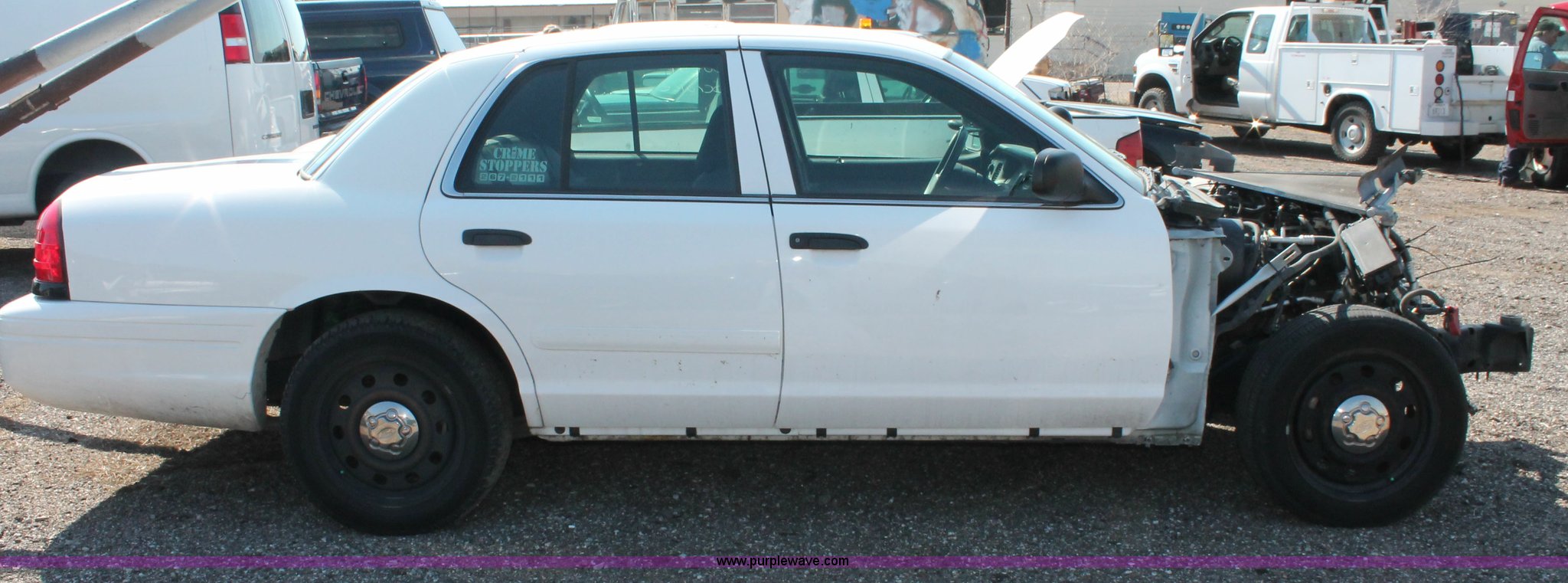 Purple Wave is selling a used Passenger Vehicle in Kansas. This item is a 2006 Ford Crown Victoria Police Interceptor with the following: 80,312 miles on odometer, 4.6L V8 SOHC 16V gas engine, Automatic transmission, AC and heat, Tilt, AM/FM, Power windows, locks, mirrors, and seats, Cloth front interior, Vinyl rear interior, P235/55R17 tires, Holes in roof and trunk, Front end damage, Engine parts missing, Front end body parts missing, Unit# 000960