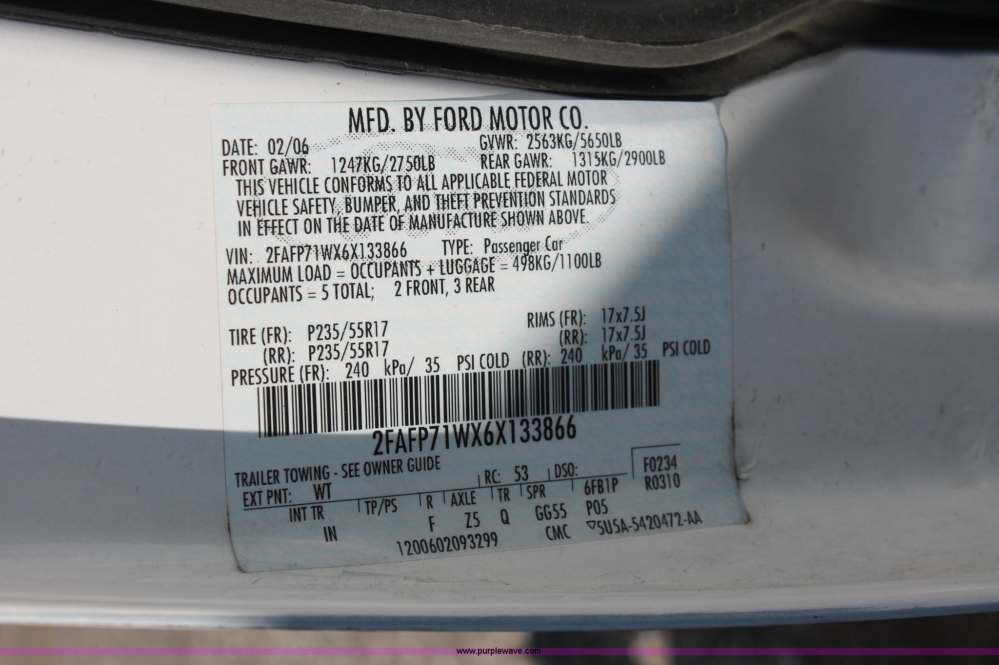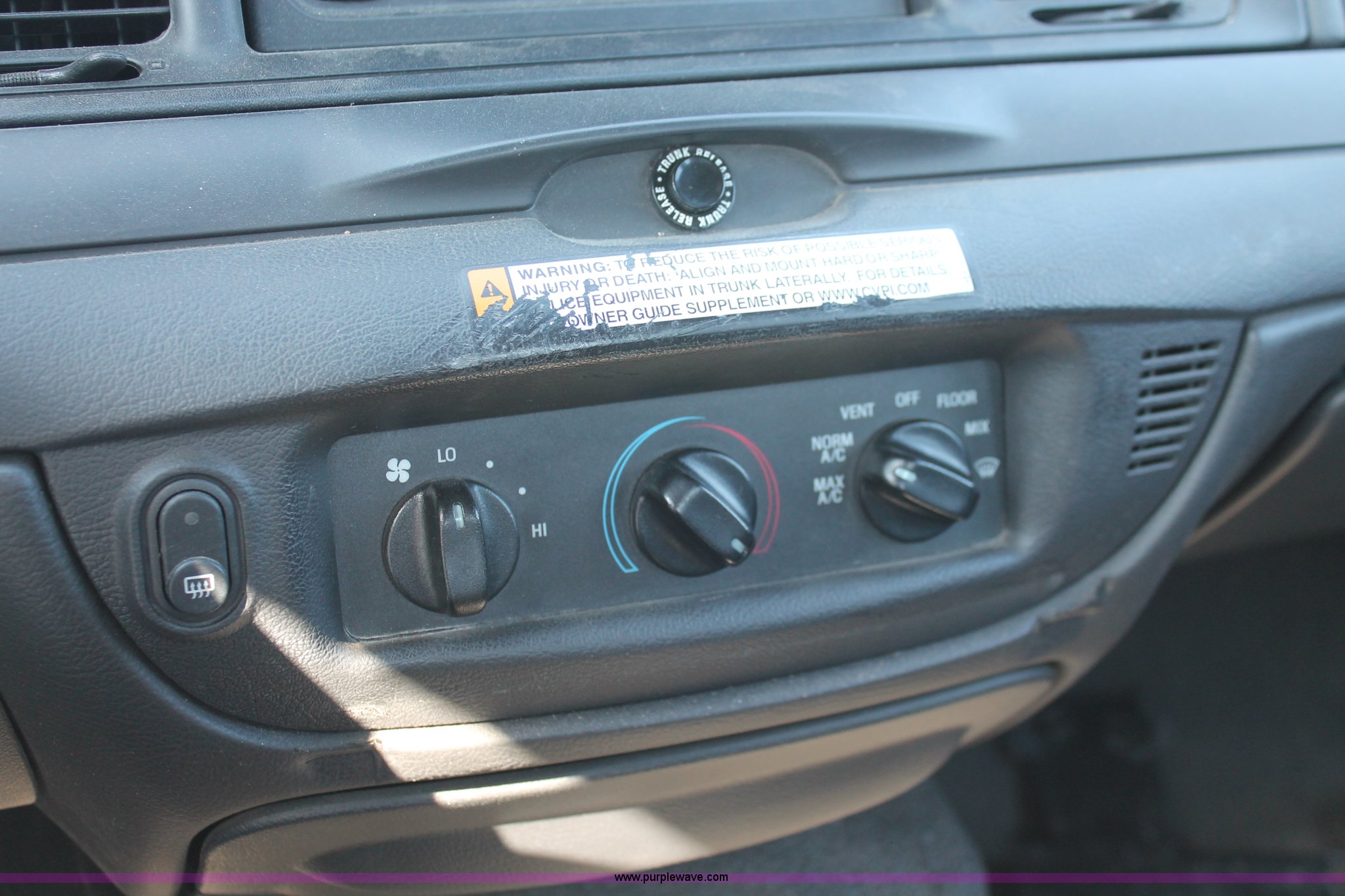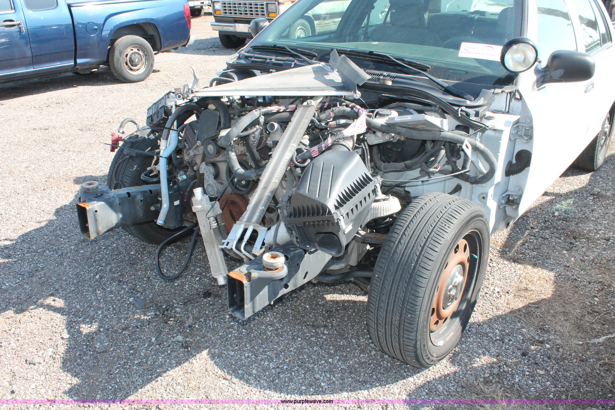 Purple Wave is selling a used Passenger Vehicle in Kansas. This item is a 2006 Ford Crown Victoria Police Interceptor with the following: 80,312 miles on odometer, 4.6L V8 SOHC 16V gas engine, Automatic transmission, AC and heat, Tilt, AM/FM, Power windows, locks, mirrors, and seats, Cloth front interior, Vinyl rear interior, P235/55R17 tires, Holes in roof and trunk, Front end damage, Engine parts missing, Front end body parts missing, Unit# 000960