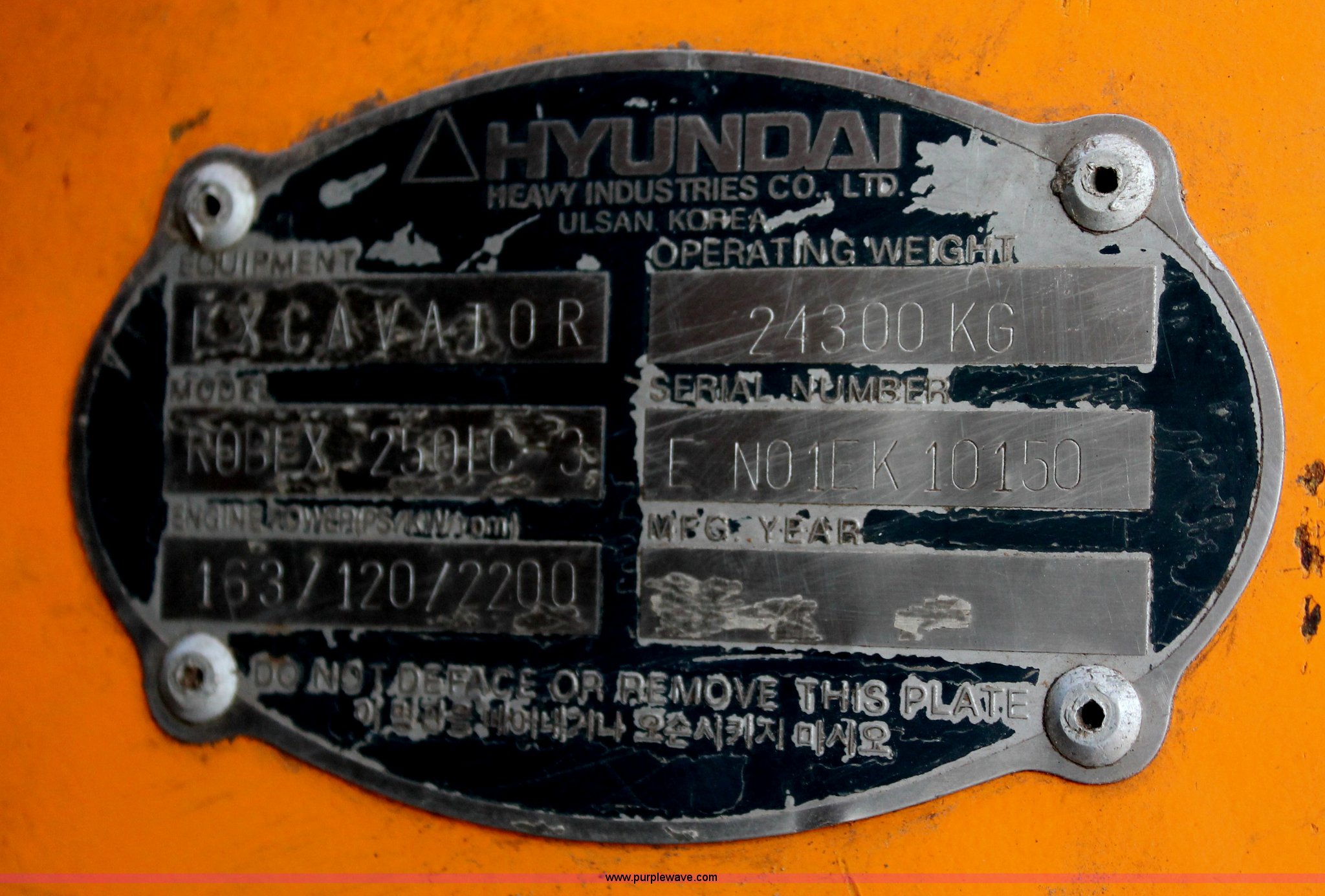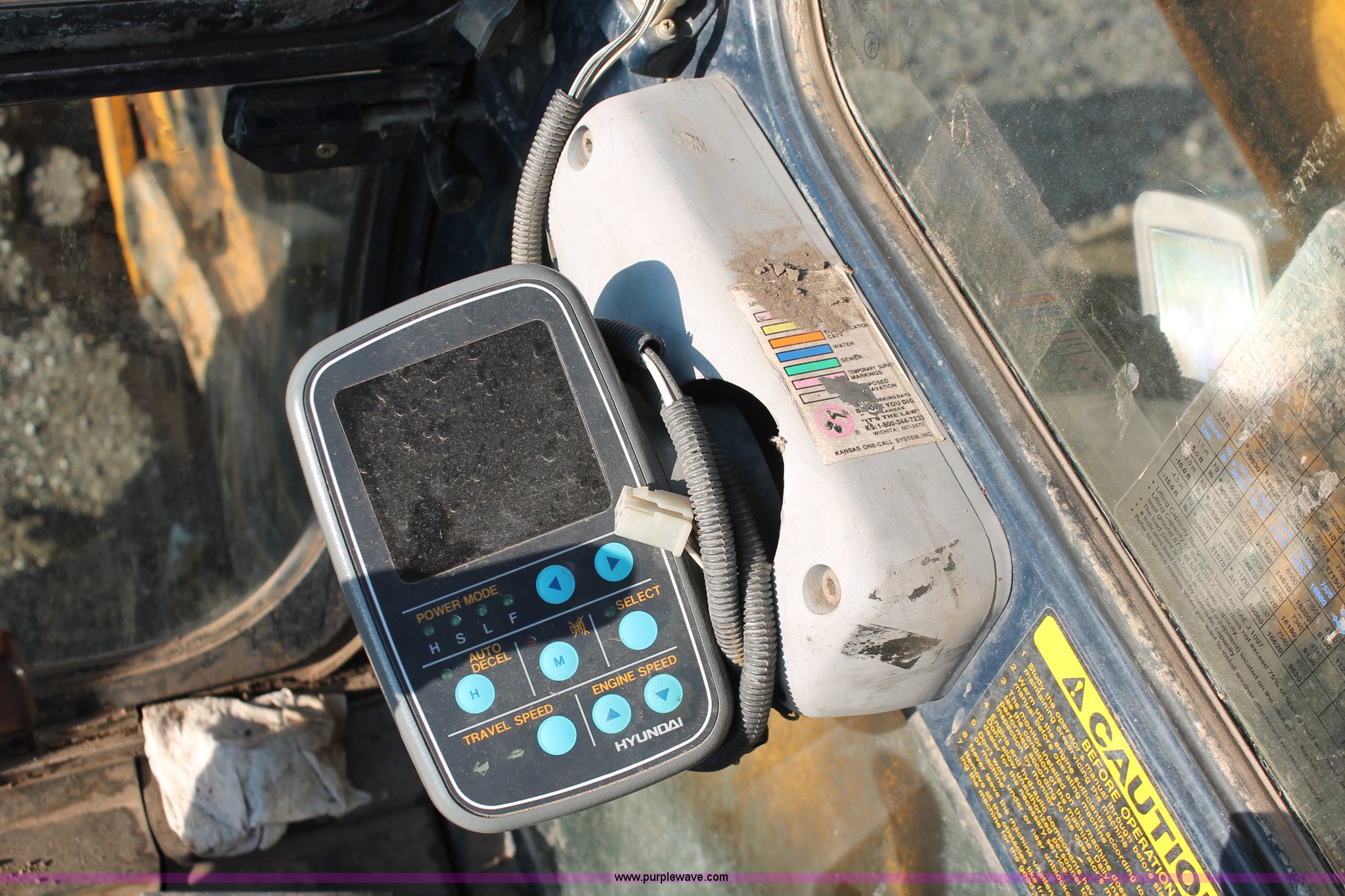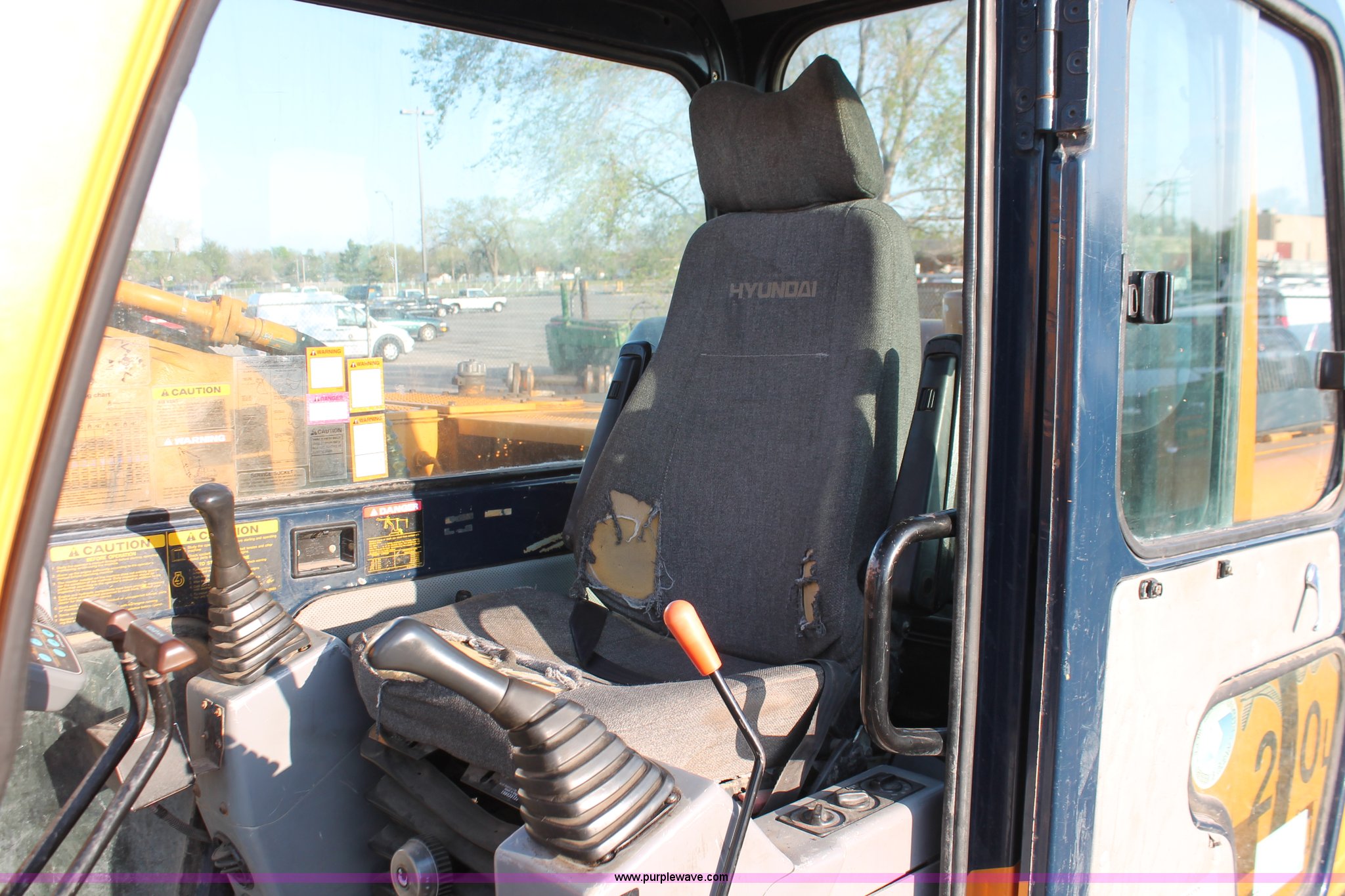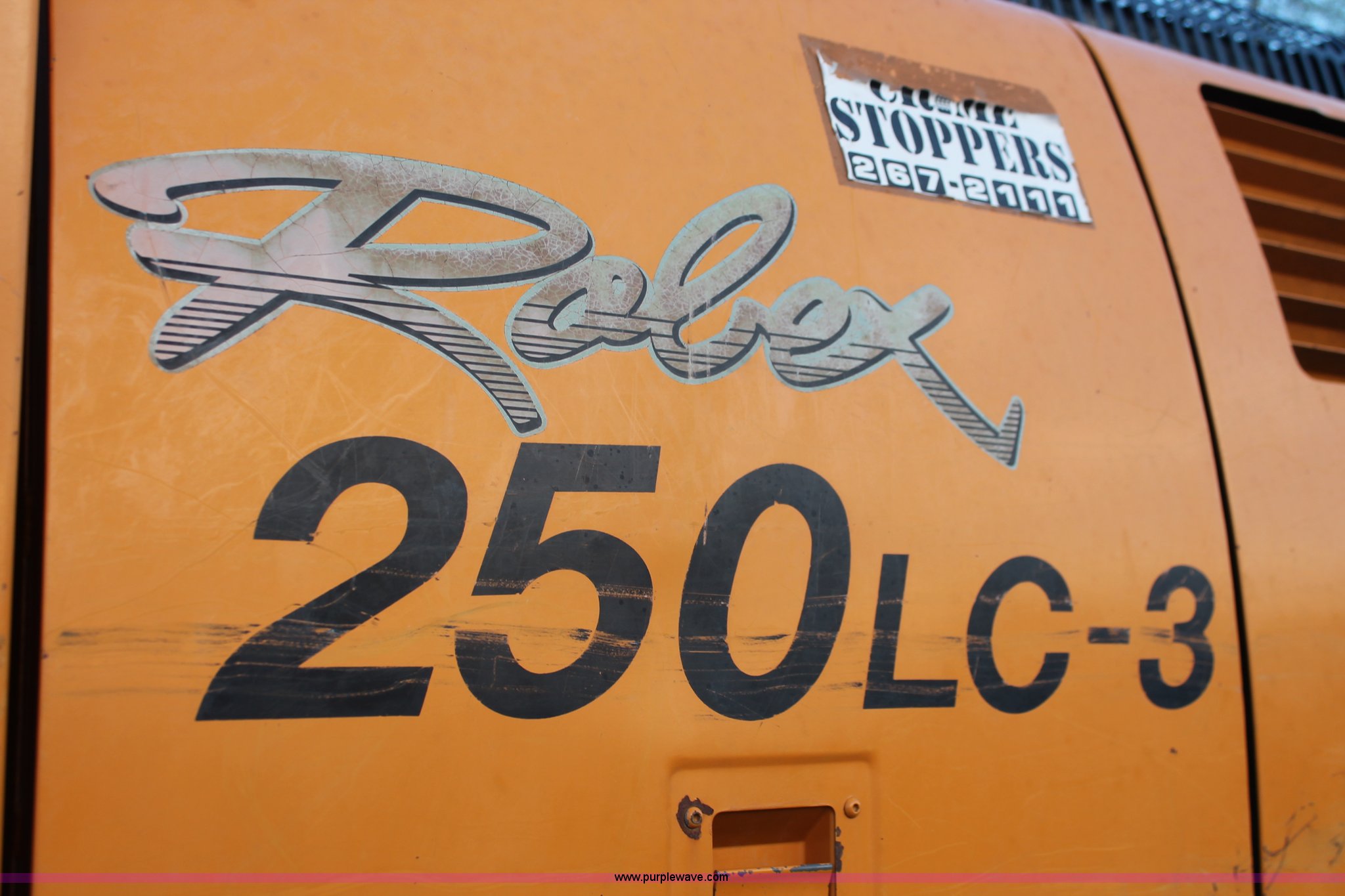 Purple Wave is selling a used Hydraulic Excavator in Kansas. This item is a 1999 Hyundai Robex 250LC-3 excavator with the following: 6,025 hours on meter, Six cylinder diesel engine, Holes in block, Enclosed cab, AC and heat, Suspension seat, Digital systems monitor, Quick coupler toggle, Sun shade, Roll up front windshield, 10' stick, 31.5"W triple grouser track pads, Body damage, Parts only, Unit inoperable, Frame leg cut from undercarriage, (2) undercarriage sprockets, Unused, JRB quick attach coupler is not included, Serial EN01EK10150