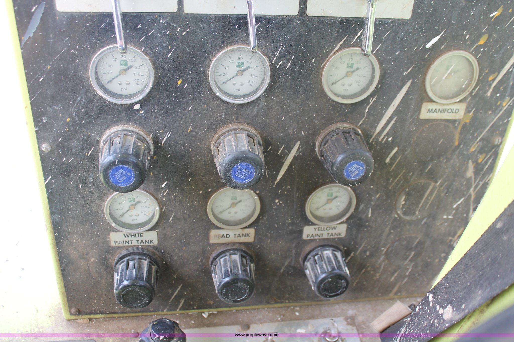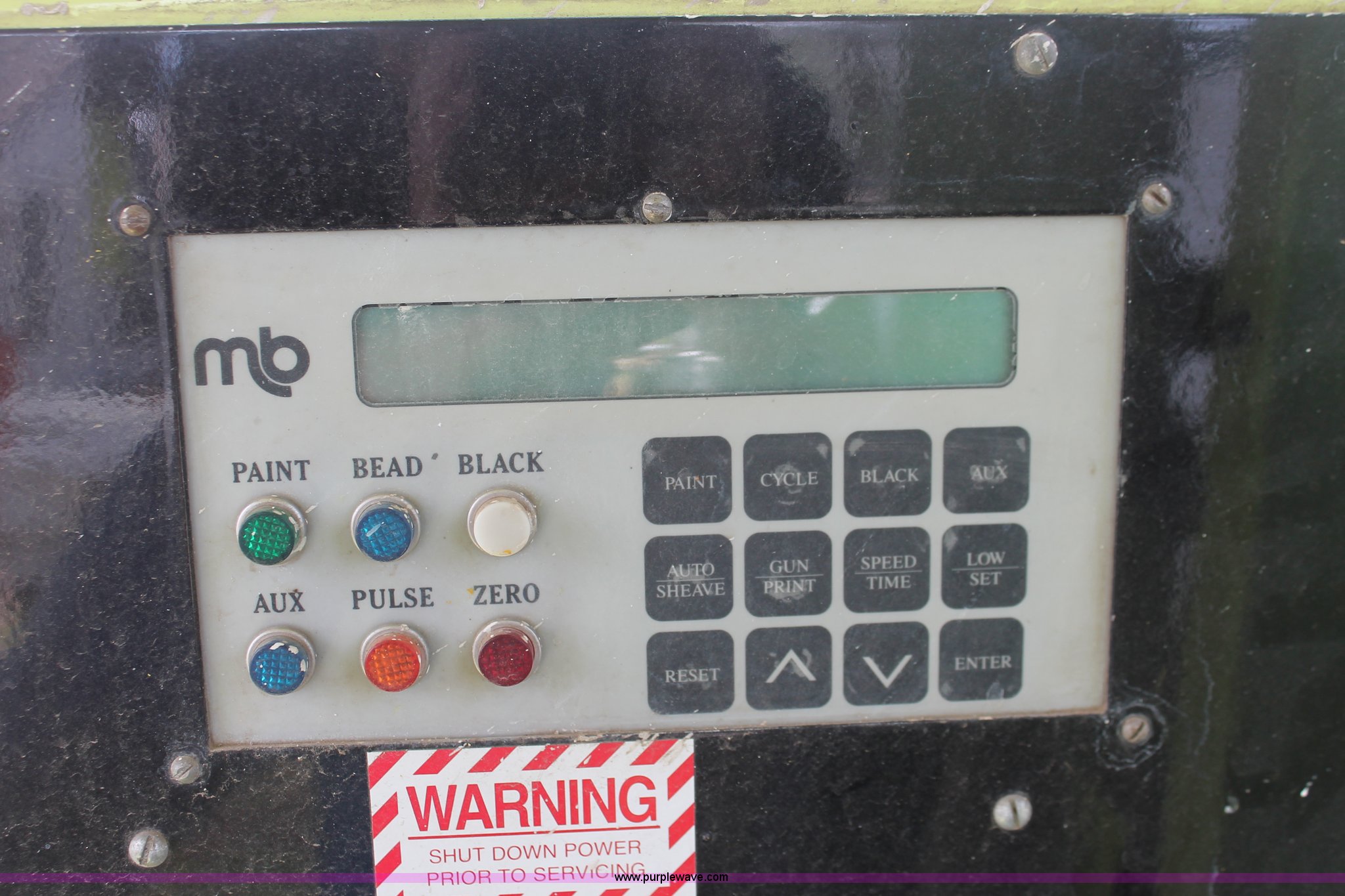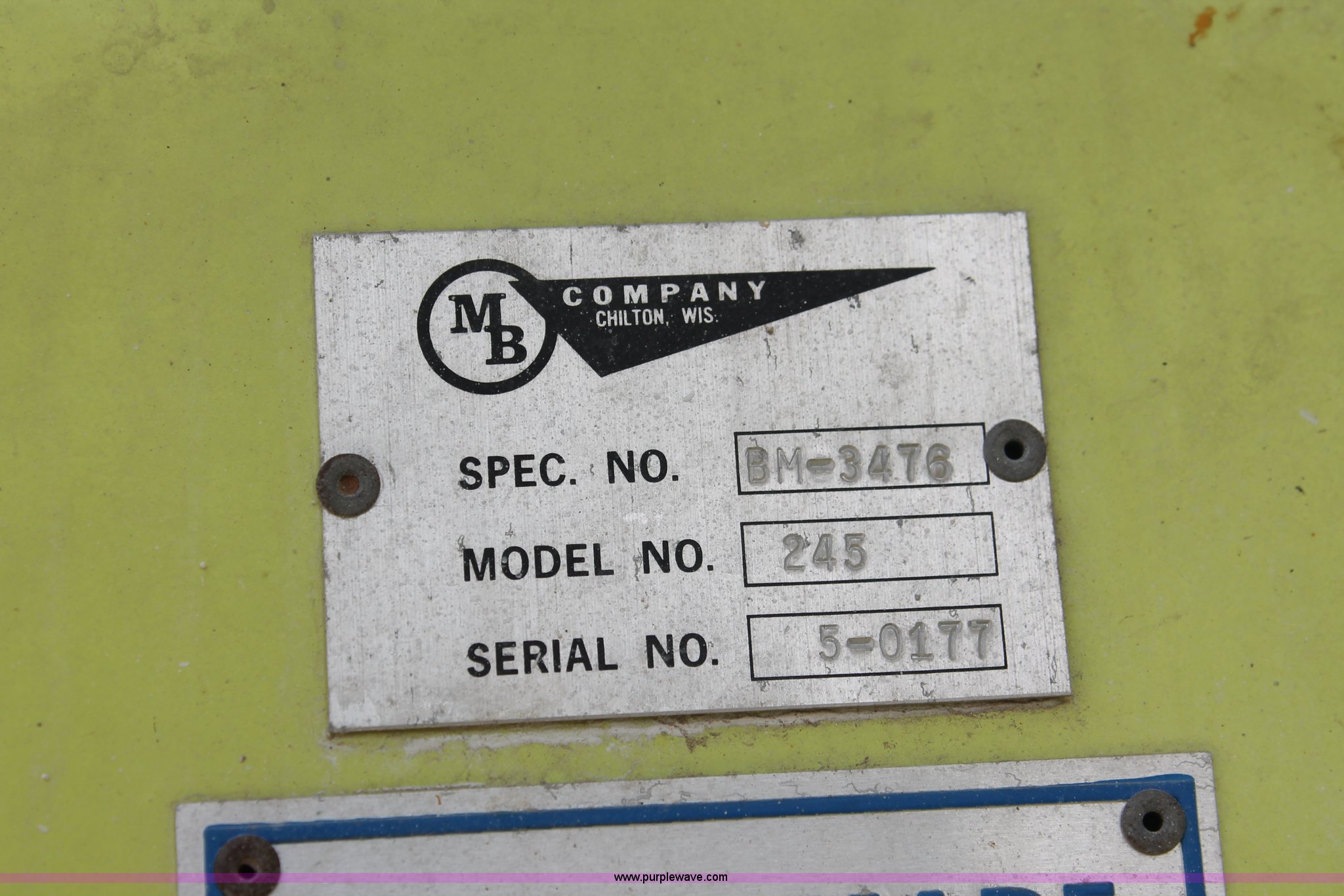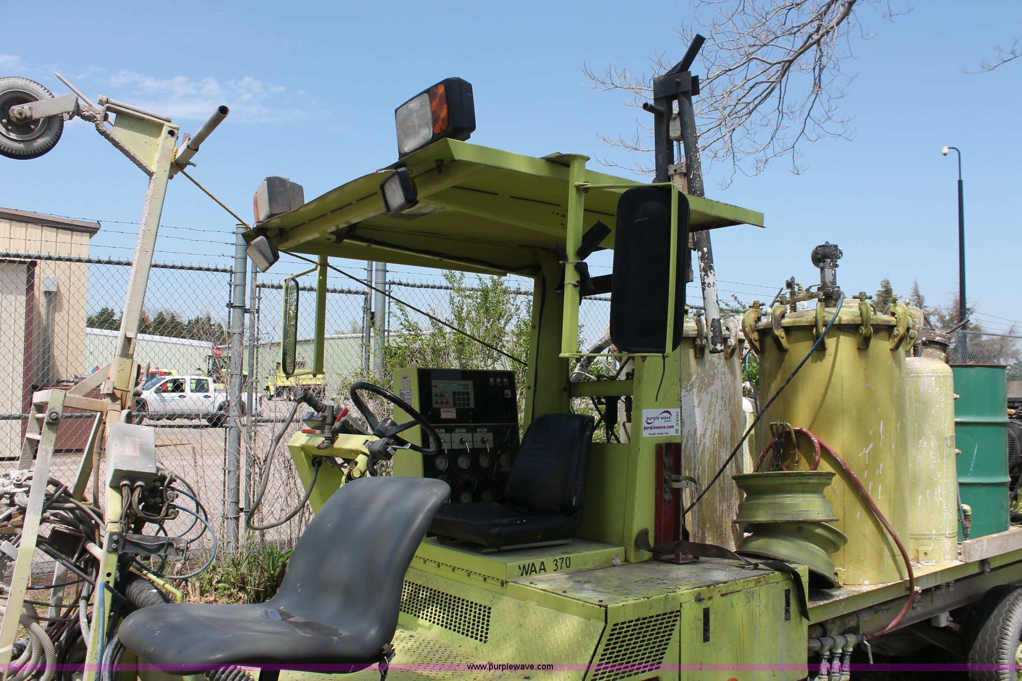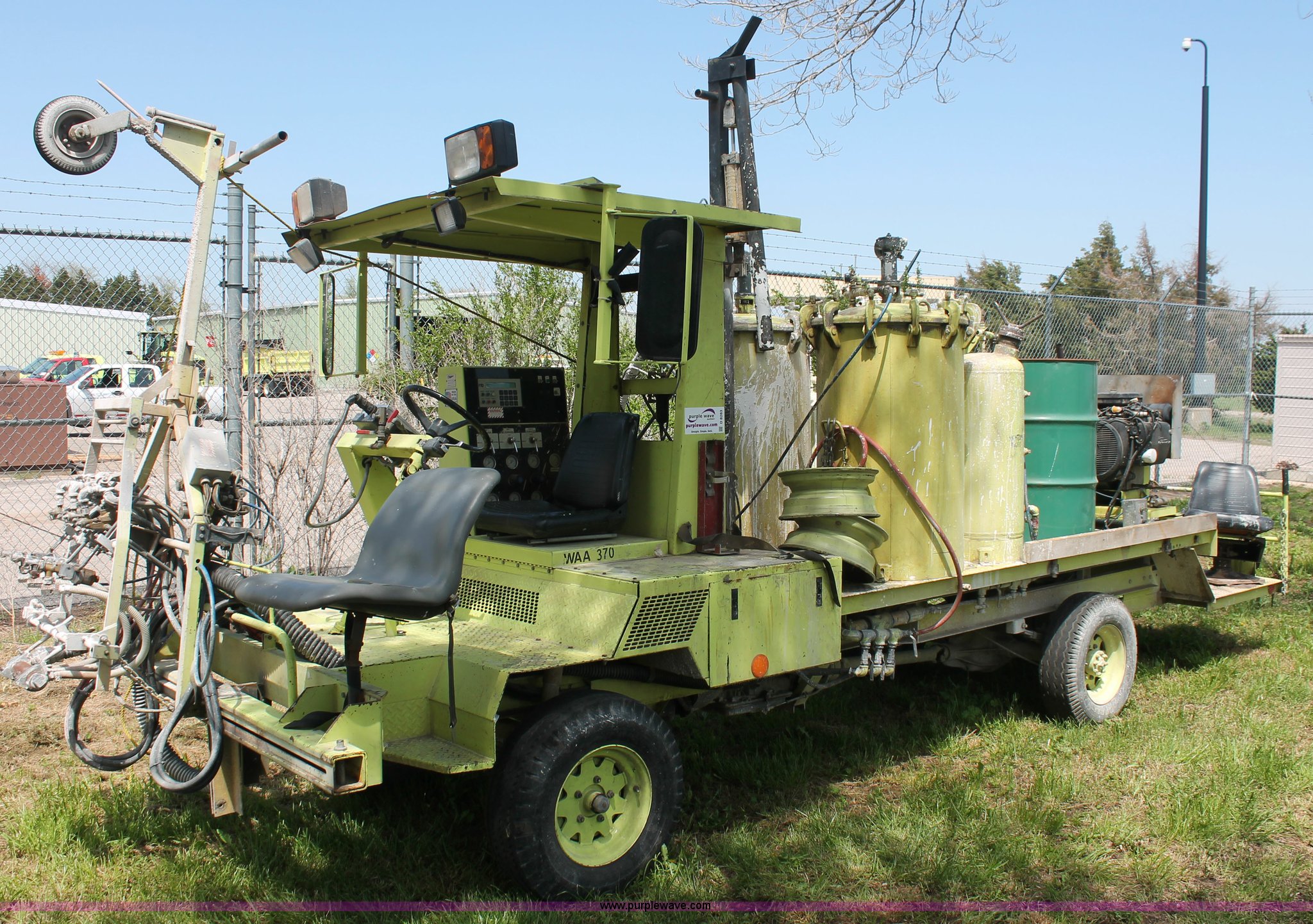 Purple Wave is selling a used Road Safety Equip. in Kansas. This item is a 1996 MB ride-on paint striper with the following: 855 hours on meter, Model MB245, Spec No. BM-3476, Four cylinder gas engine, Automatic transmission, Canopy, Paint control monitor, Operator assistant seat, Three gun system, Fold up guide wheels, Onan Performer 24 gas engine, Atlas Copco twin cylinder compressor, (3) Approx. 55 gallon paint drums, (2) pressure tanks, Rear platform, Observation seat, Work lights, 8-14.5 tires, Serial 5-0177