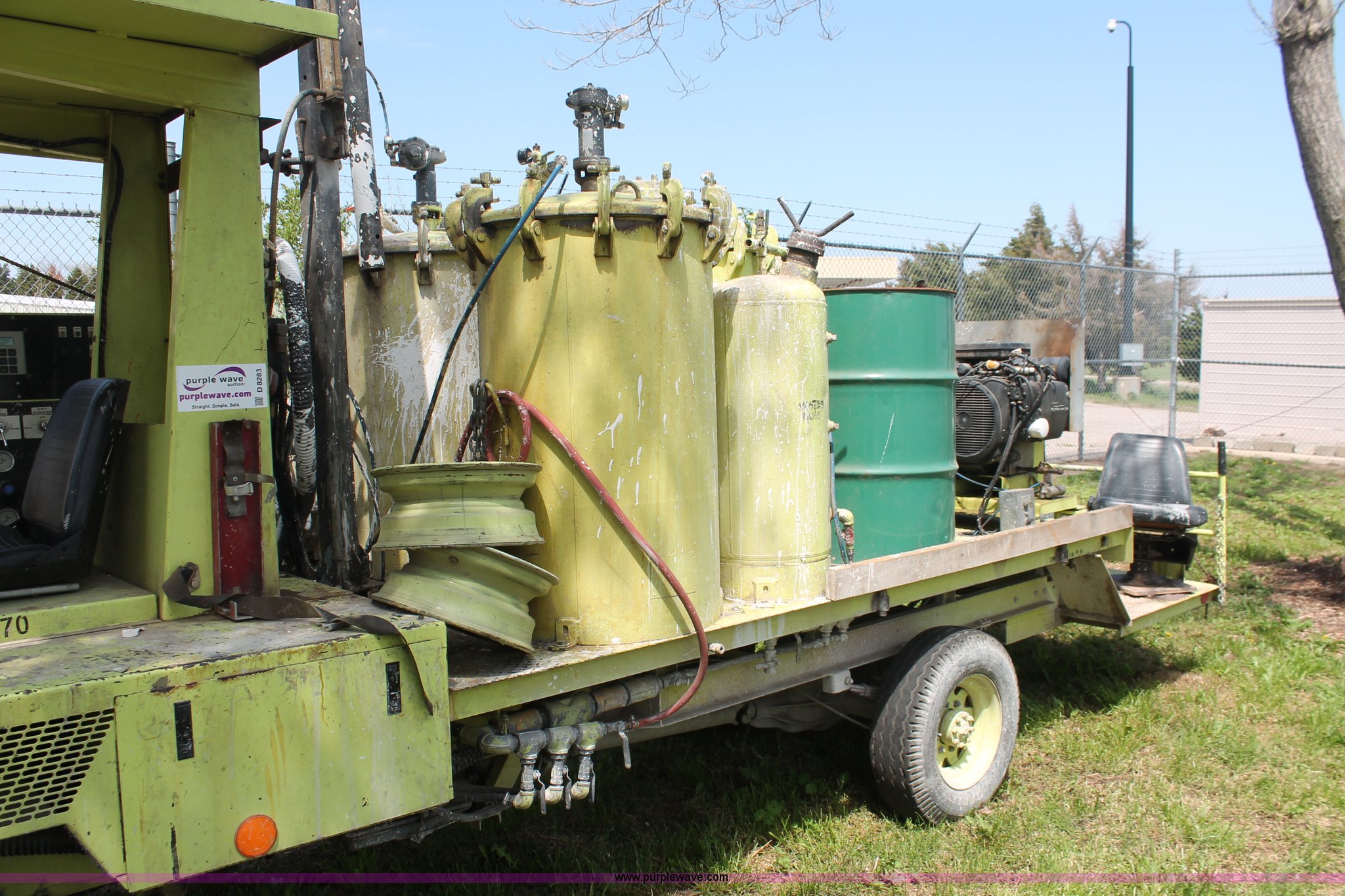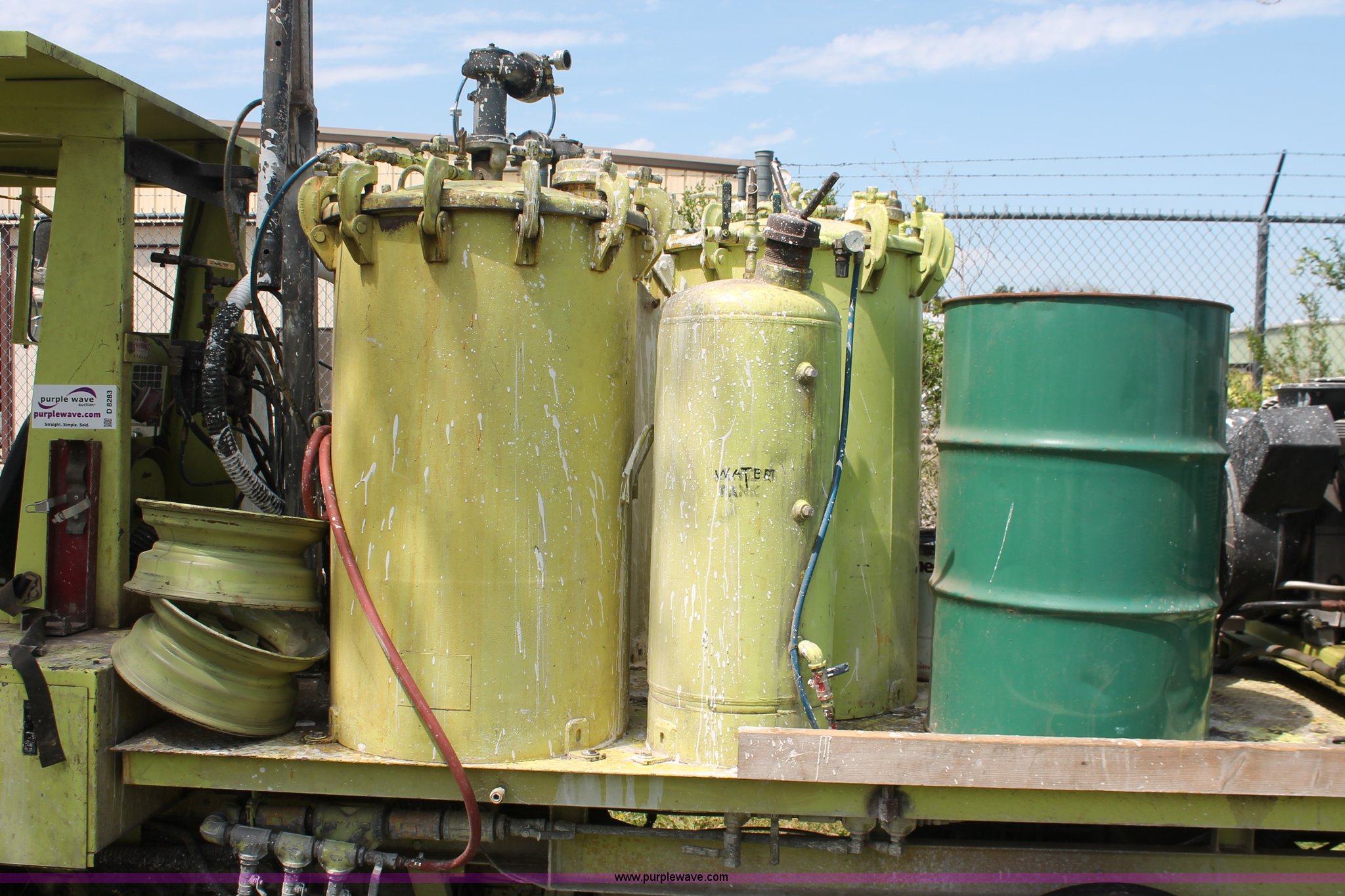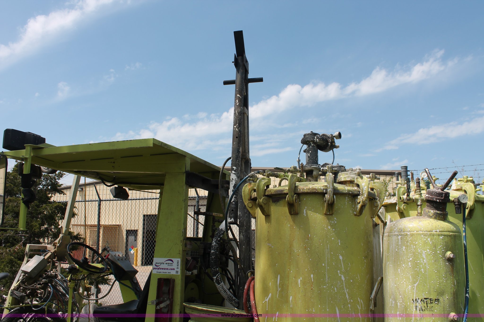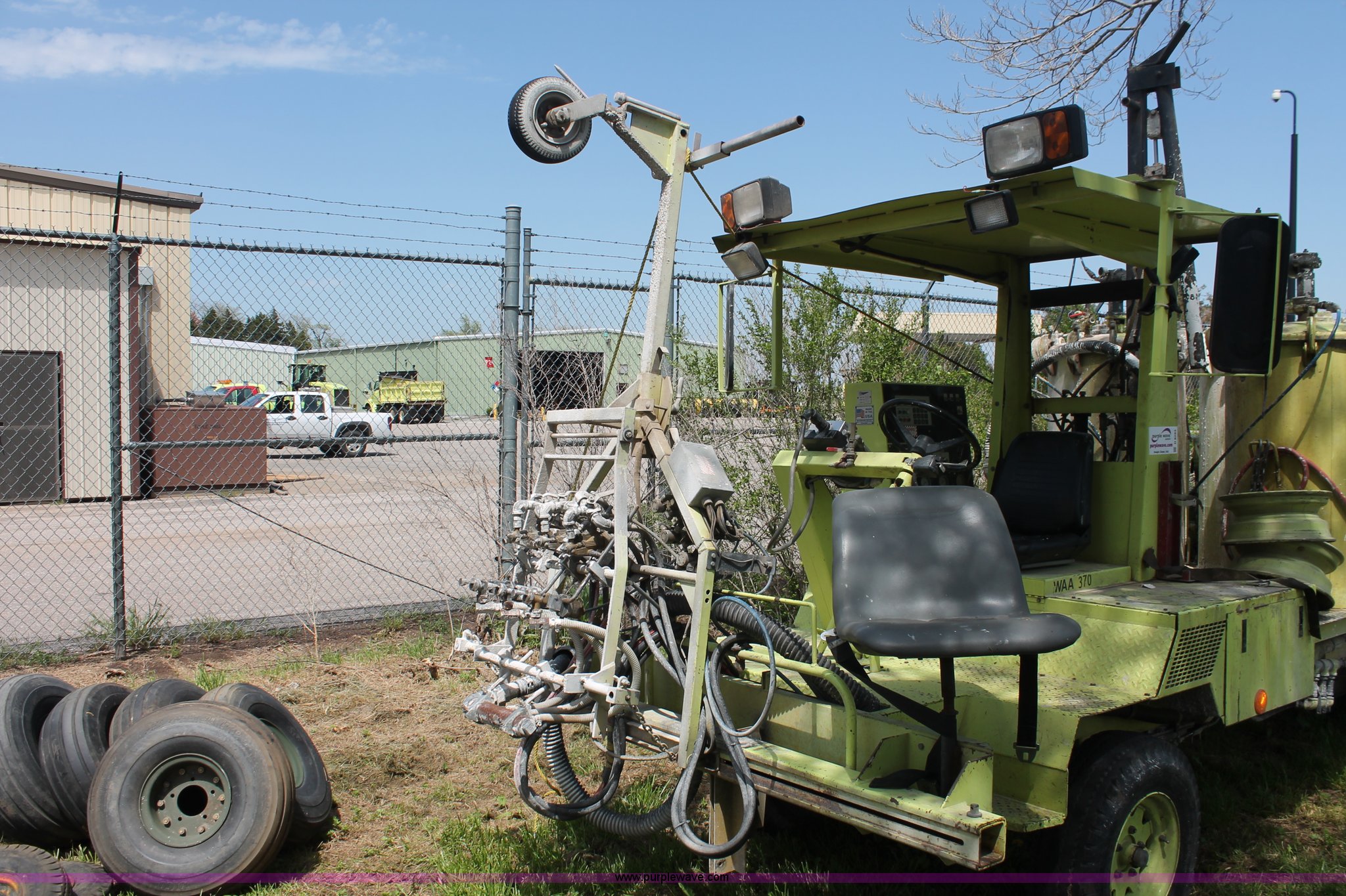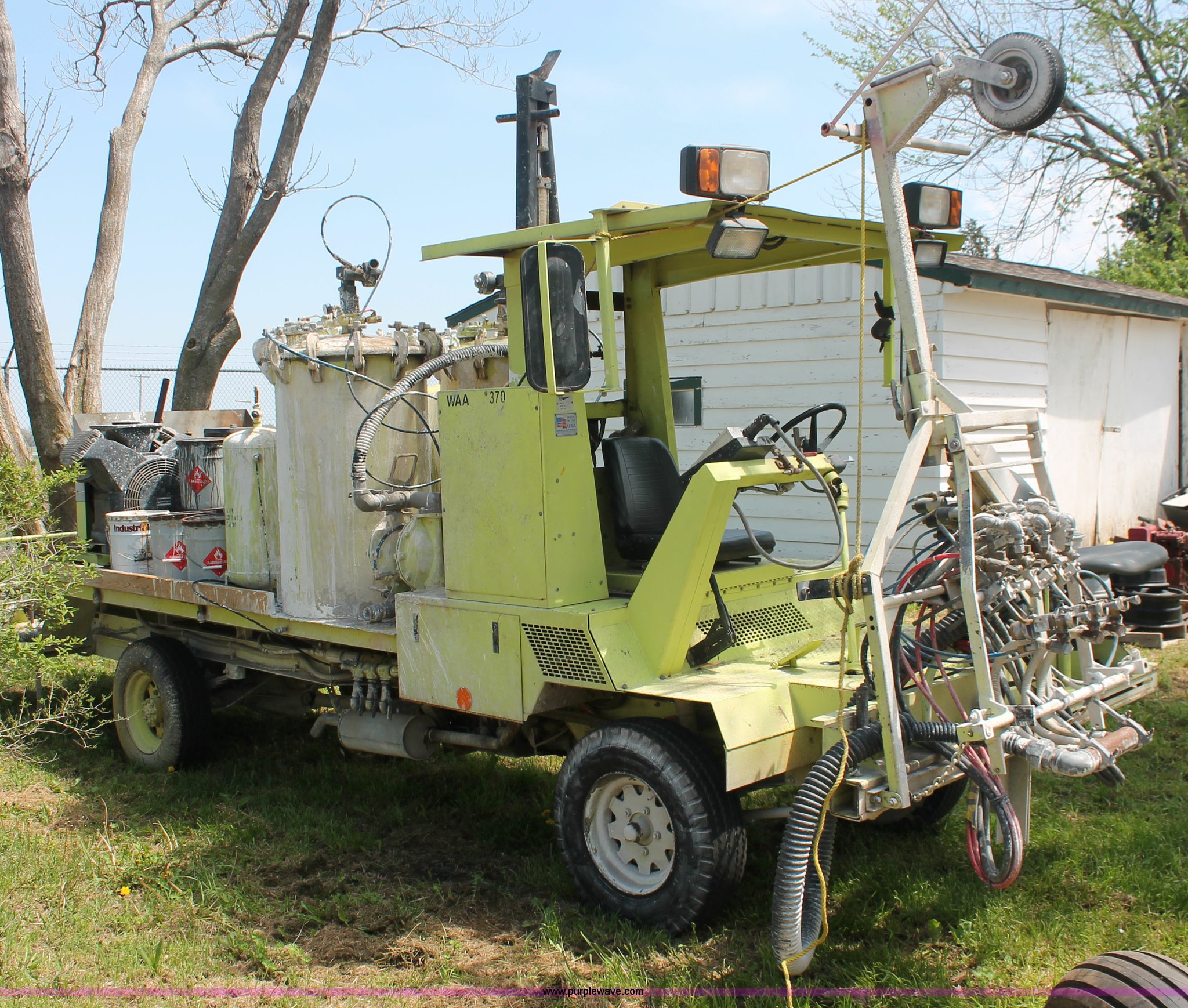 Purple Wave is selling a used Road Safety Equip. in Kansas. This item is a 1996 MB ride-on paint striper with the following: 855 hours on meter, Model MB245, Spec No. BM-3476, Four cylinder gas engine, Automatic transmission, Canopy, Paint control monitor, Operator assistant seat, Three gun system, Fold up guide wheels, Onan Performer 24 gas engine, Atlas Copco twin cylinder compressor, (3) Approx. 55 gallon paint drums, (2) pressure tanks, Rear platform, Observation seat, Work lights, 8-14.5 tires, Serial 5-0177