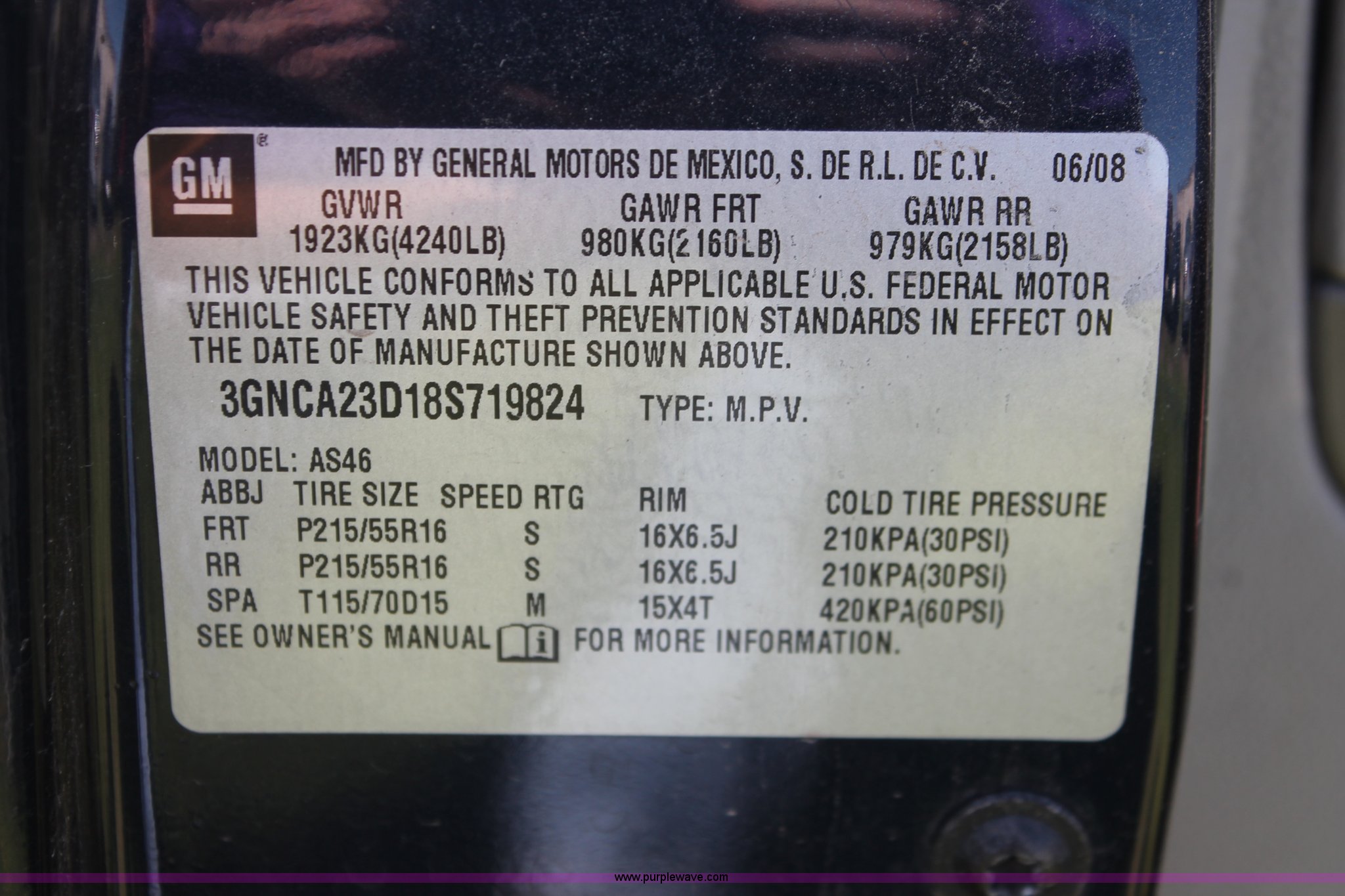 2008 Chevrolet HHR LT. Unknown miles on odometer, 2.2L L4 DOHC 16V gas engine, Automatic transmission, AM/FM/cassette, P215/55R16 tires, Flat tire, Unattached front bumper included, Case# 13C09251. Previous Rebuilt Salvage Title. Vehicle is abandoned. No additional information is available. Vehicle does not have keys unless notated otherwise in the item listing.. View City Of Wichita Terms for title acquisition and item removal requirements.. 3GNCA23D18S719824. Shipping quotes available. Interstate Wrecker Service. 1028 N Mosley. Wichita, KS 67214