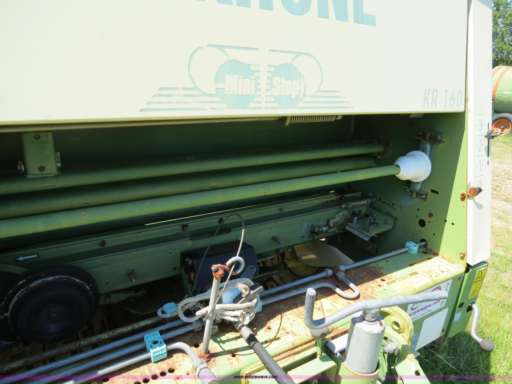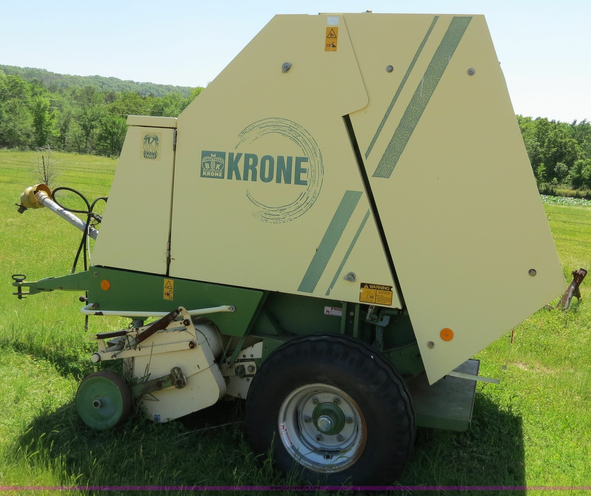 Purple Wave is selling a used Round Baler in Oklahoma. This item is a 1997 Krone KR160B round baler with the following: 540 PTO, Twine tie or net wrap, 4' x 5' bale capacity, Bale kicker, Steel gauge wheels, 11.5/80-15.3 tires, Serial 389796